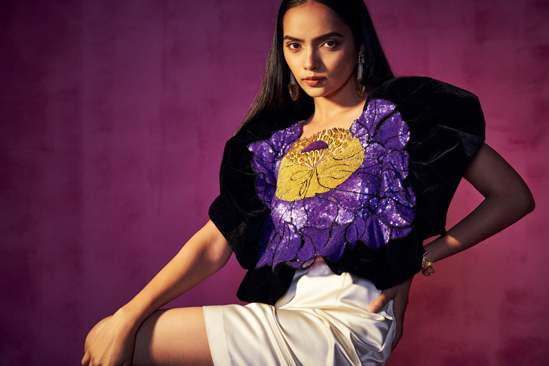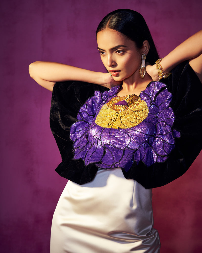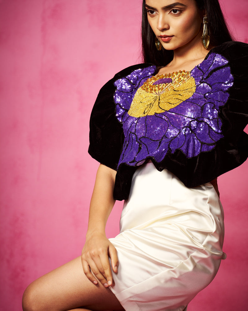 This multi-colored dress is made with tulle, velvet, and satin, adorned with beautiful 3D floral and sequins embroidery.