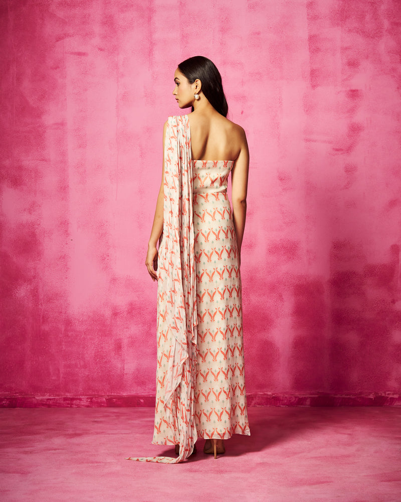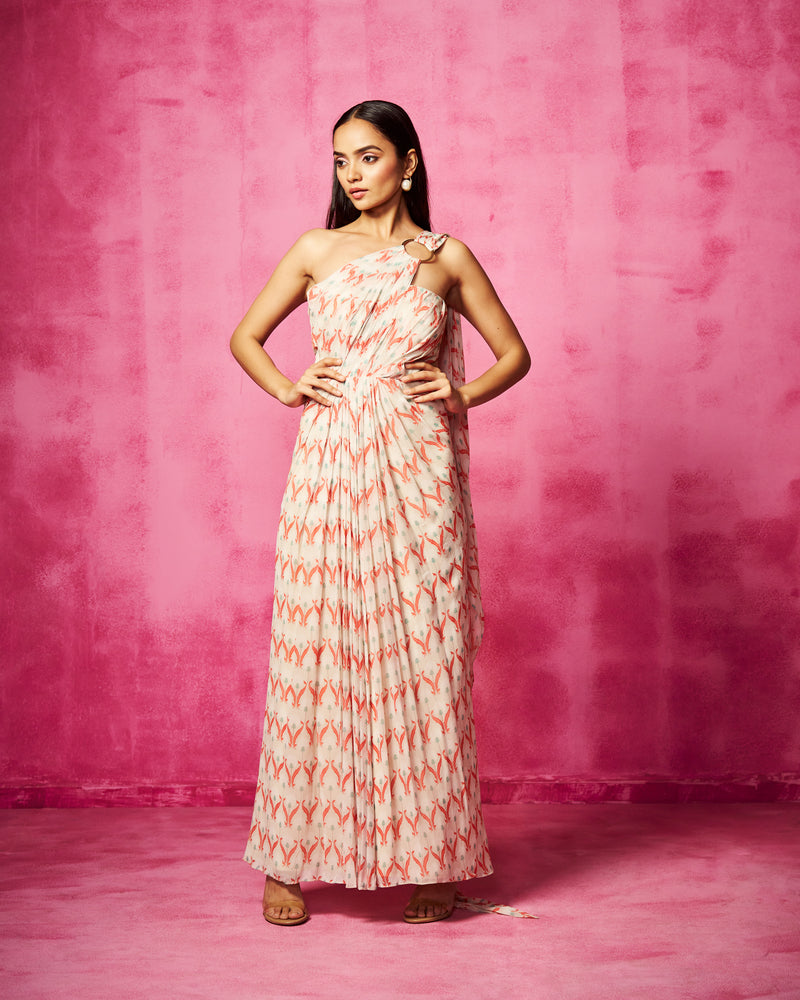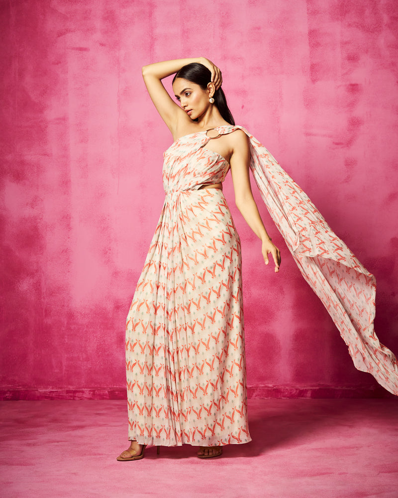 Experience the elegant and luxurious sensation of this ivory georgette pre-draped saree gown featuring an abstract print and a waist cutout, adorned with stunning gold ring detailing.