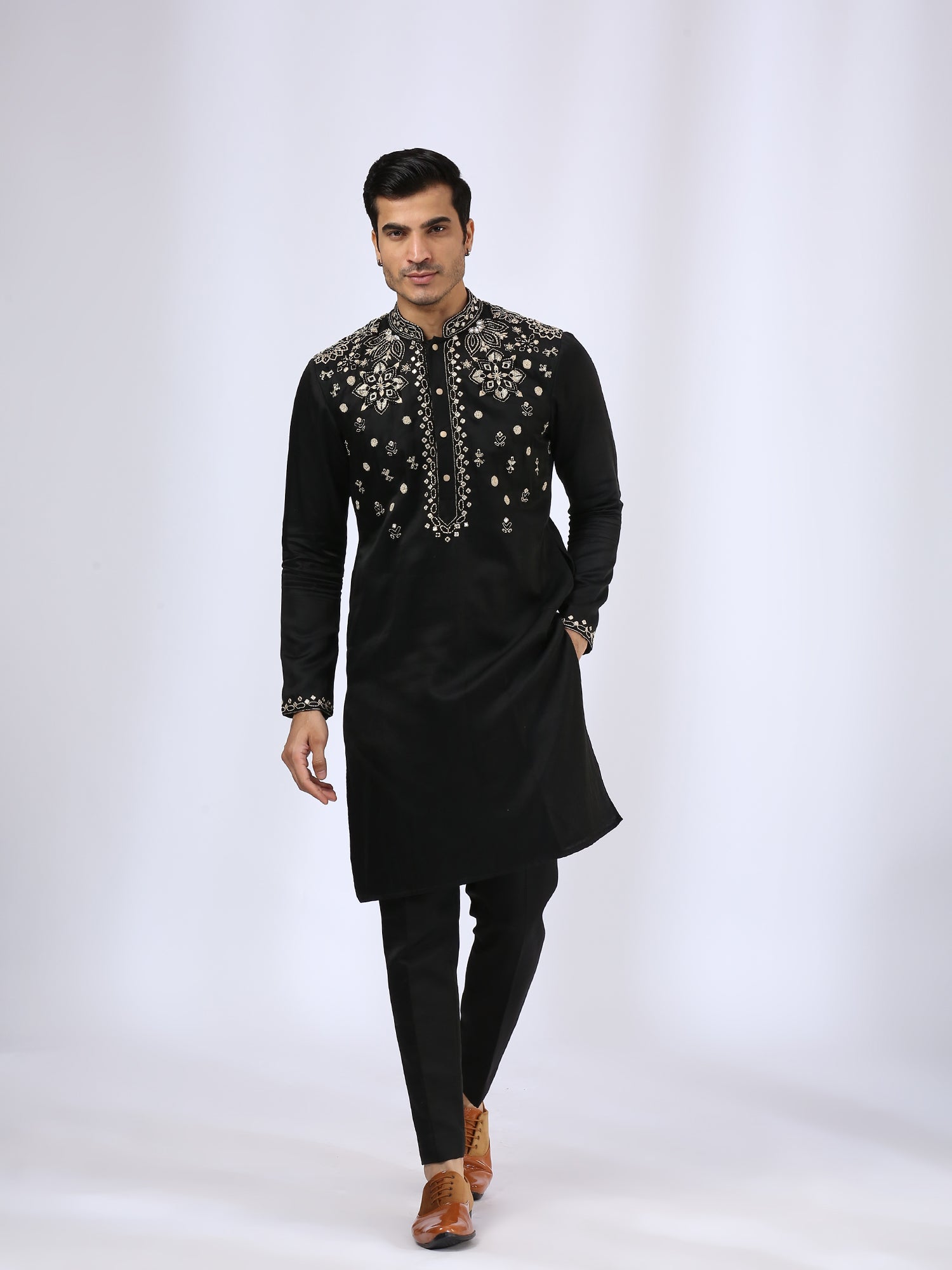 Black embroidered kurta with threadwork on the shoulder,collar, placket ,back and sleeves. It is teamed with narrow pants men and son.