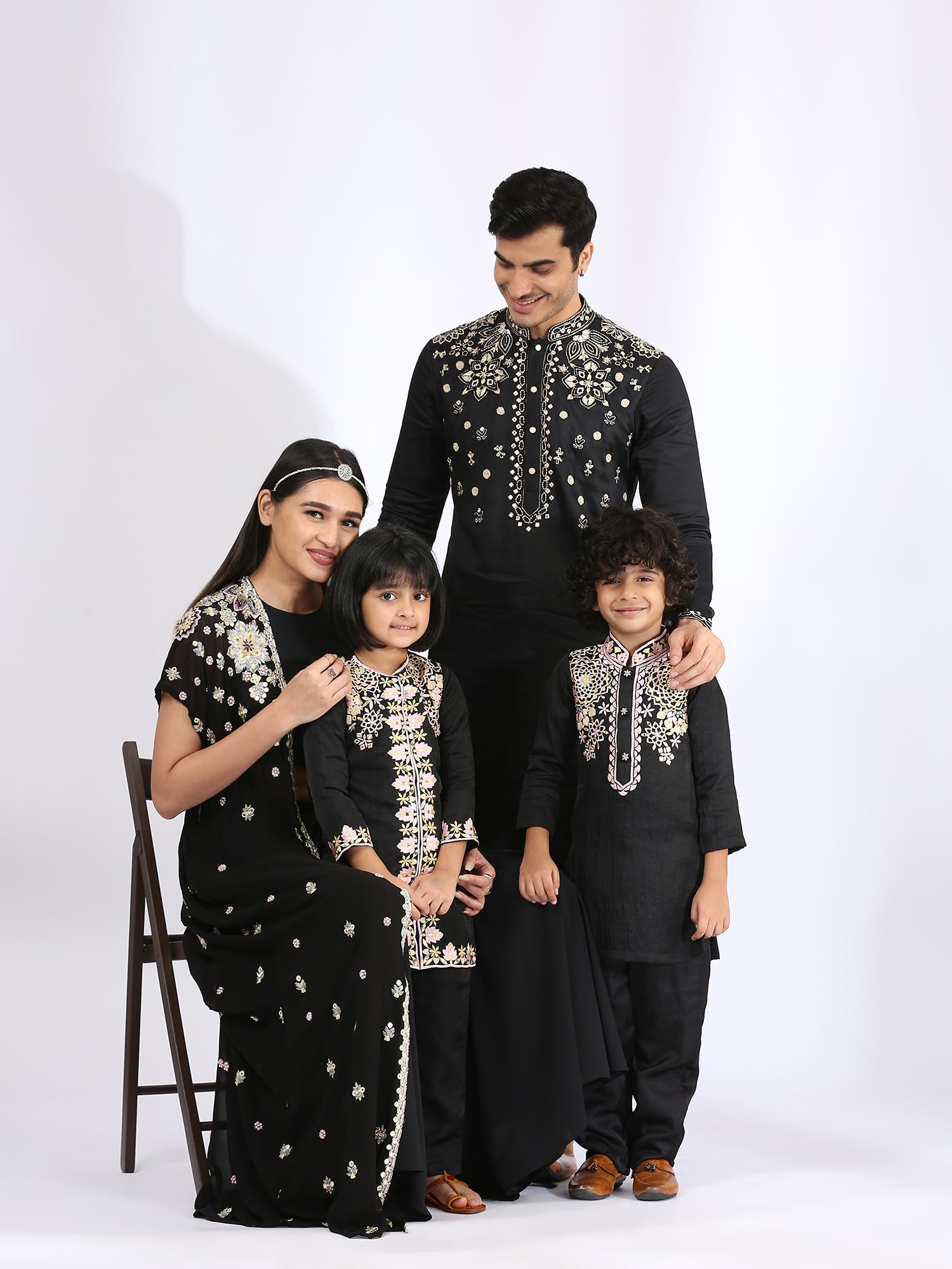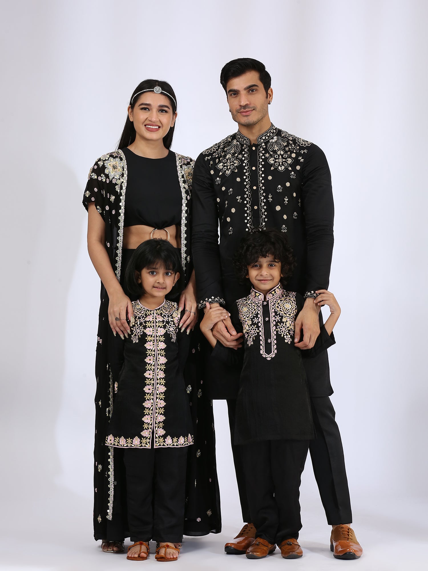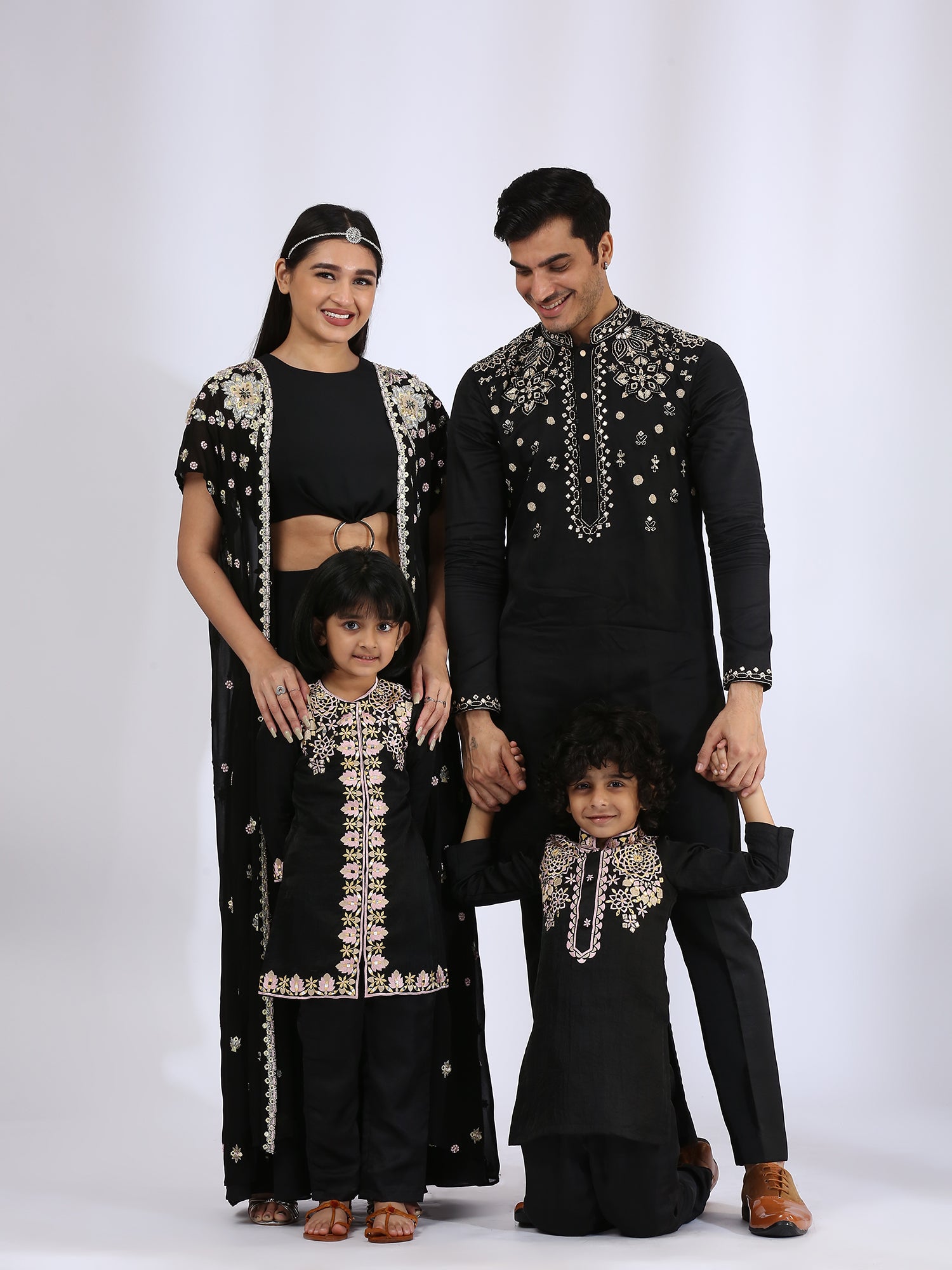 Jet black Jumpsuit with silver ring in the center. It is further enhanced with an open jacket with 3-D and threadwork embroidery for women teamed up with Black embroidered kurta enhanced with threadwork. It is teamed with narrow pants for daughter