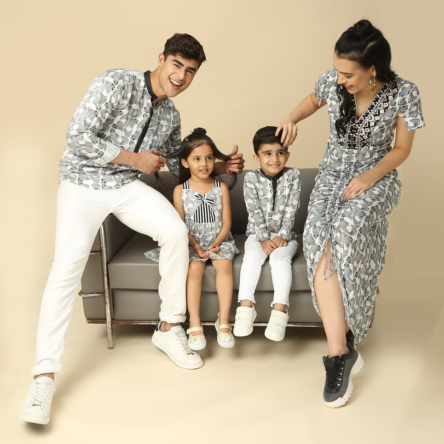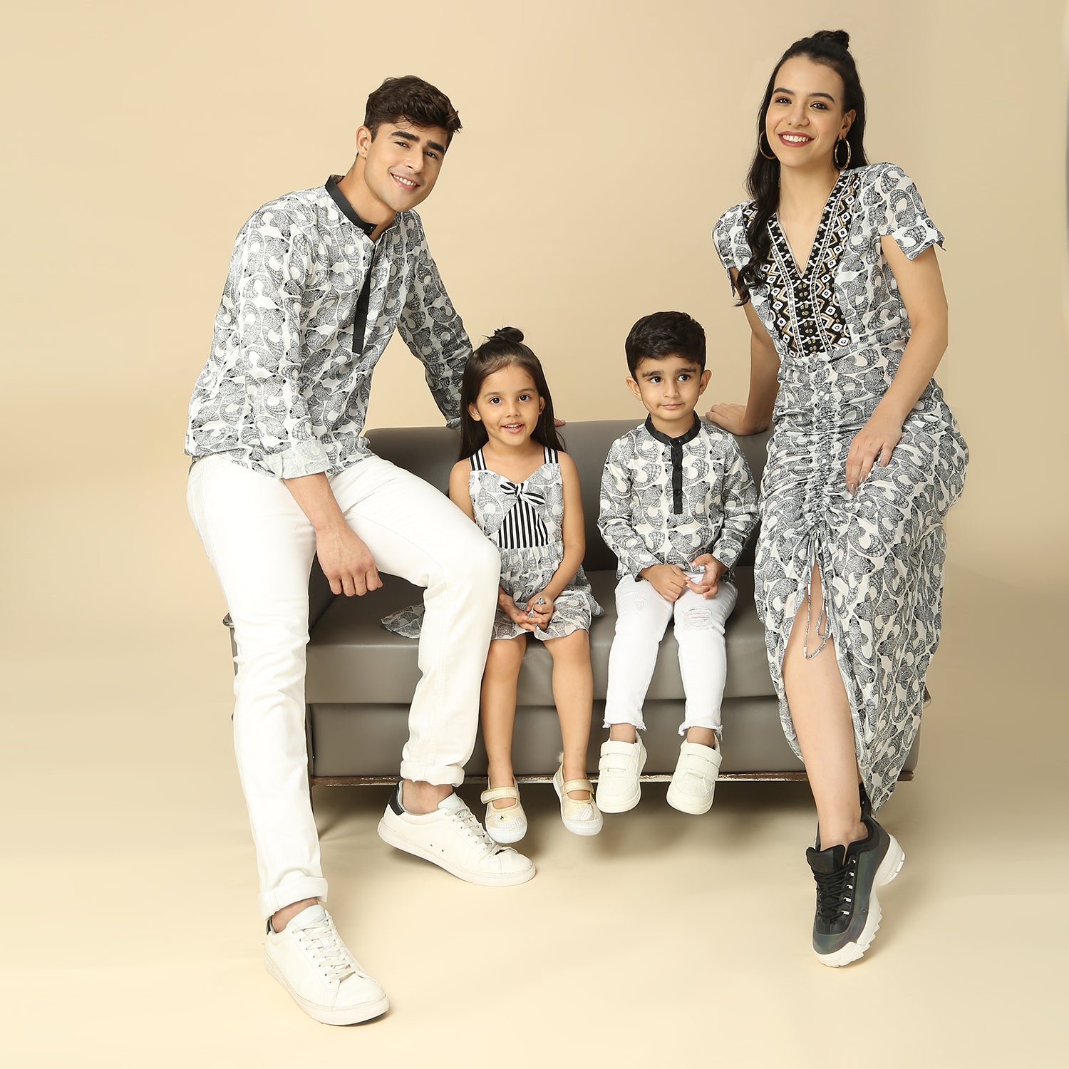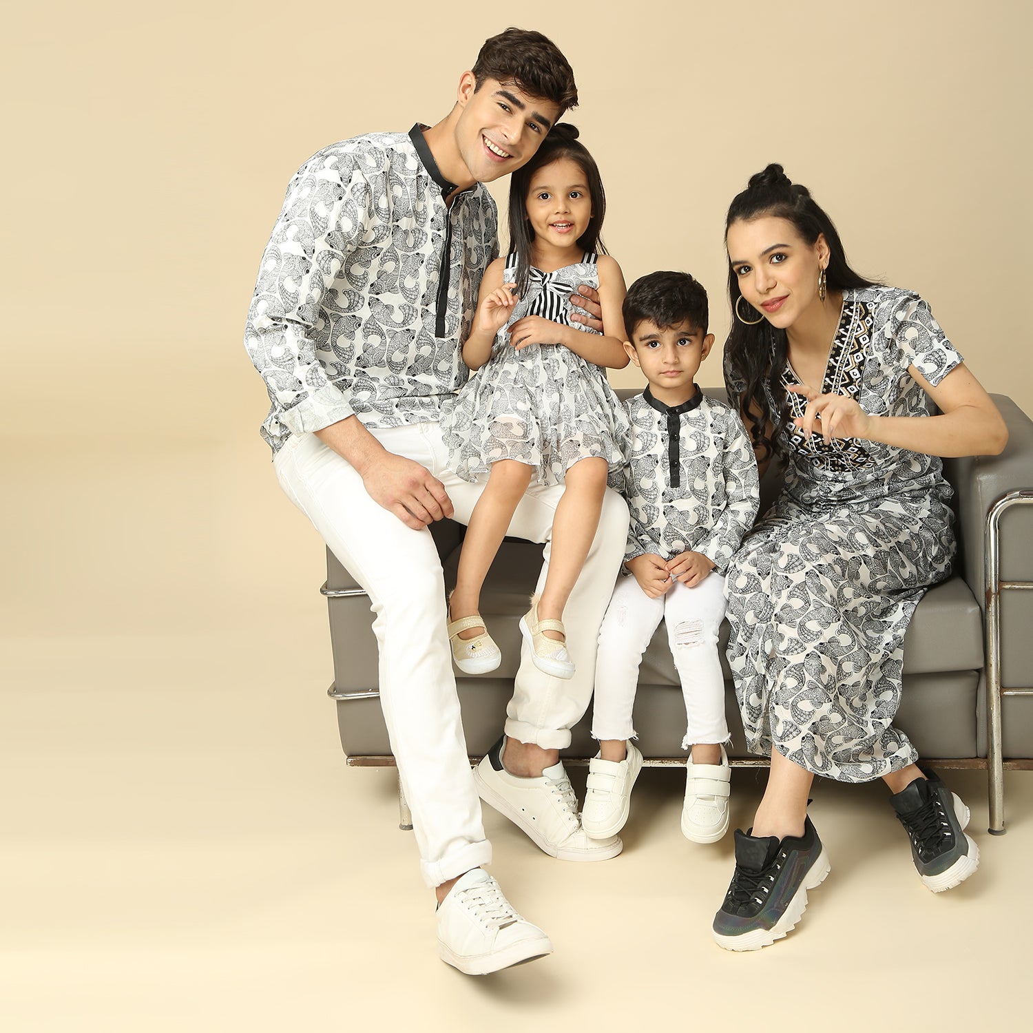 Draped fish print cuckoon dress with hand embroidered yoke for Mother and Daughter