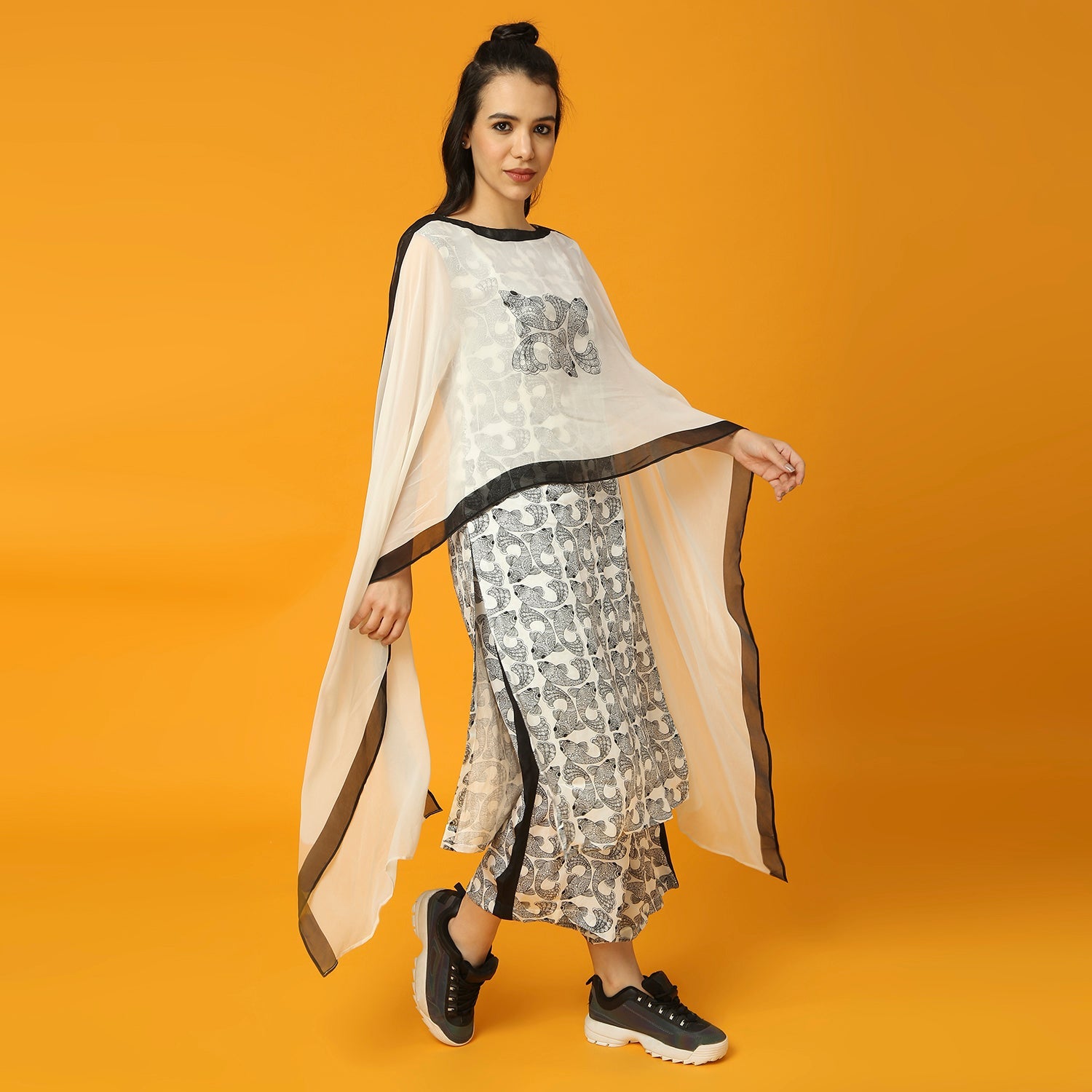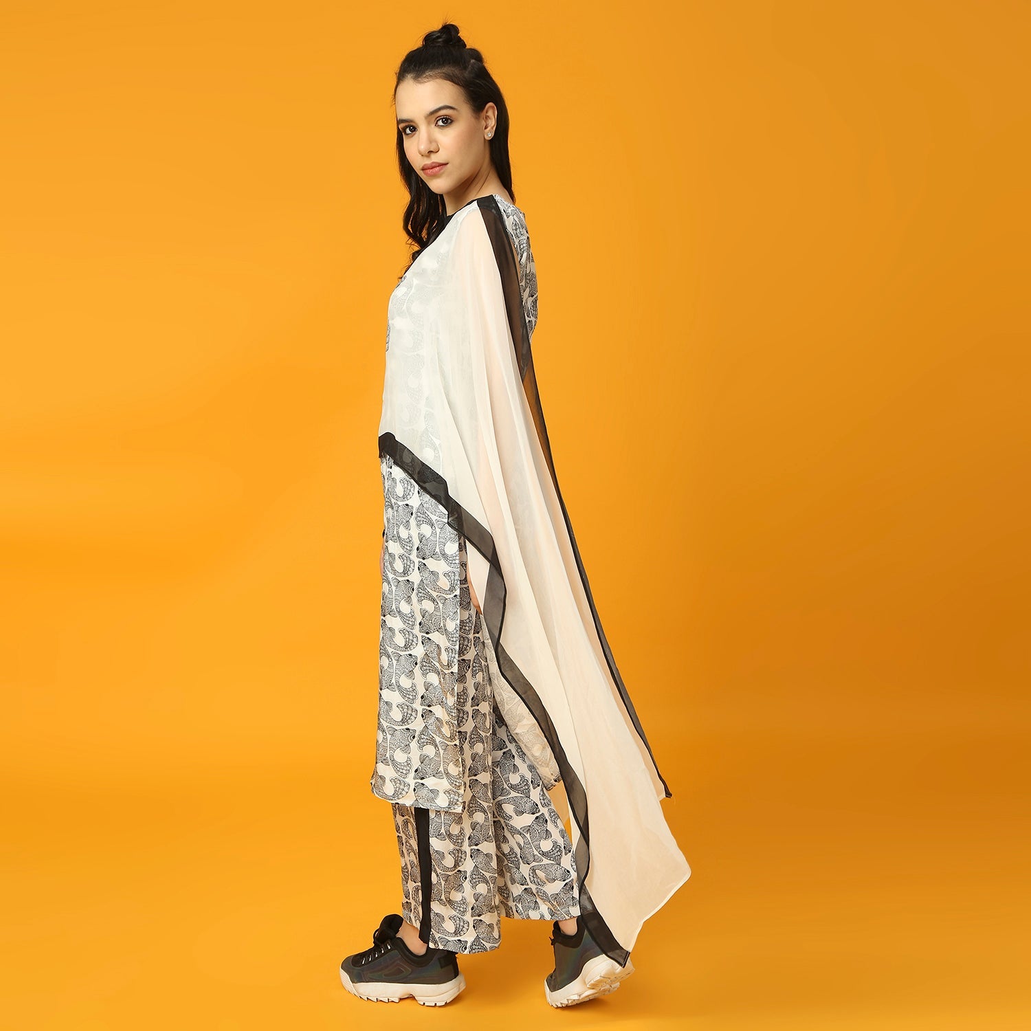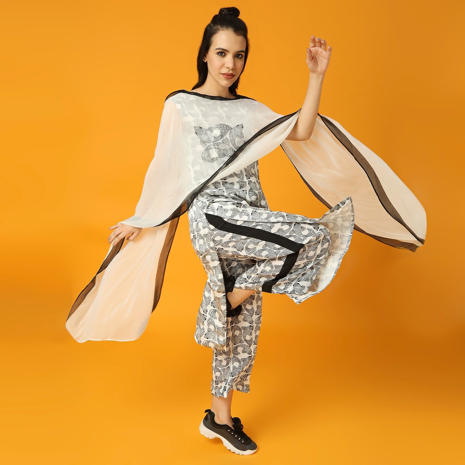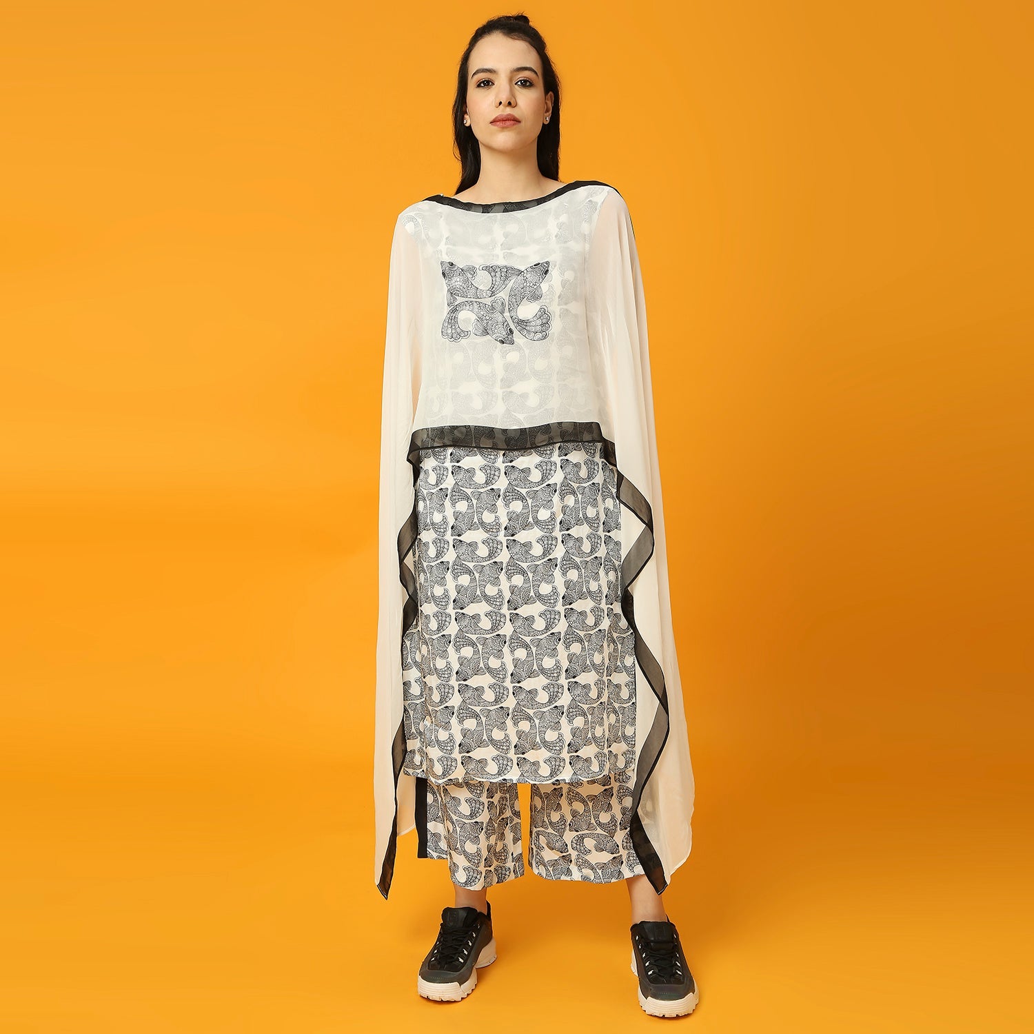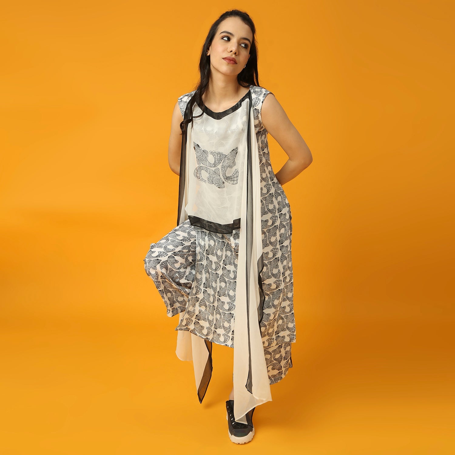 This Black and White Kurta features a unique fish print design. It also includes a pre-draped dupatta for added ease and style.