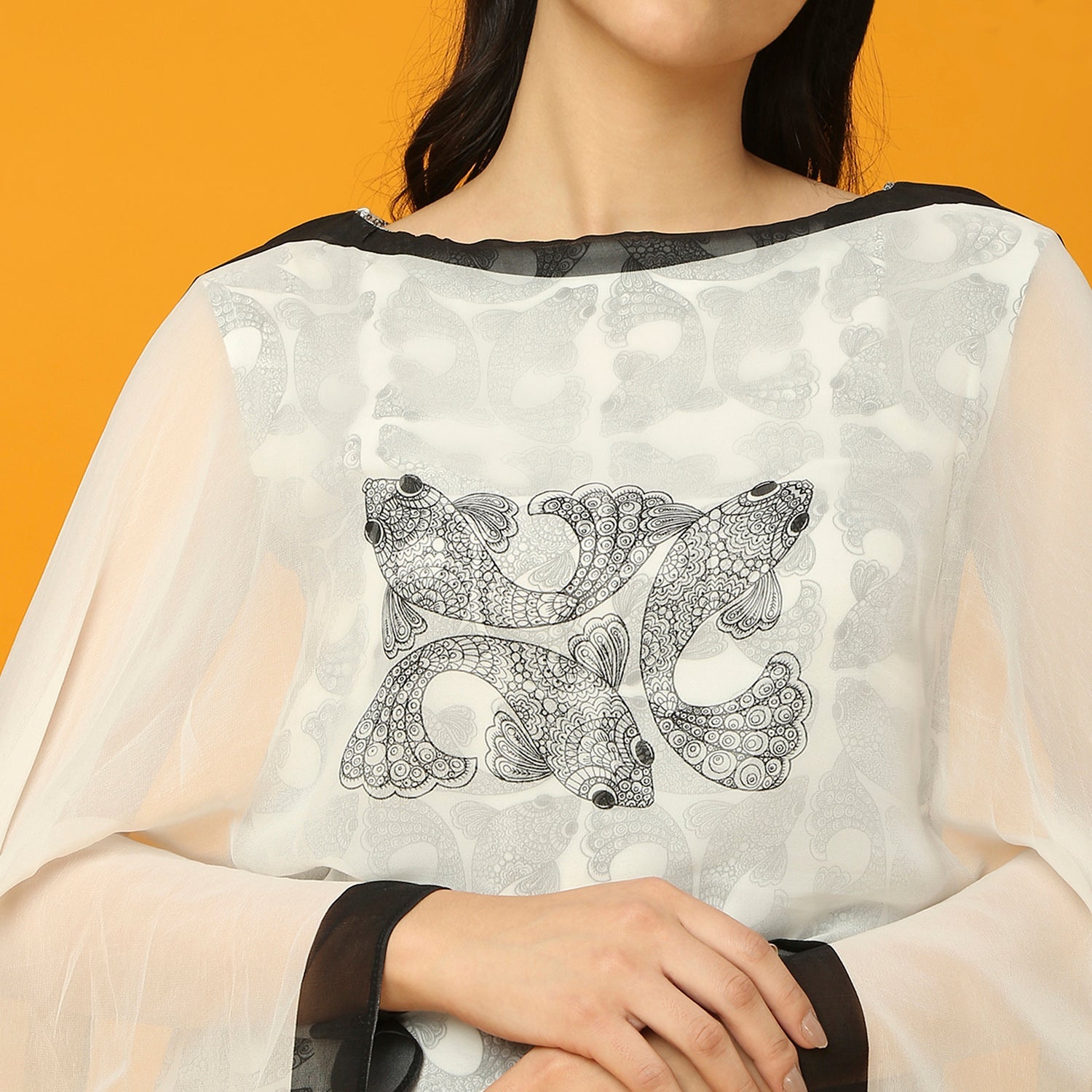 Black and White Fish Print Kurta and Pre-Draped Dupatta