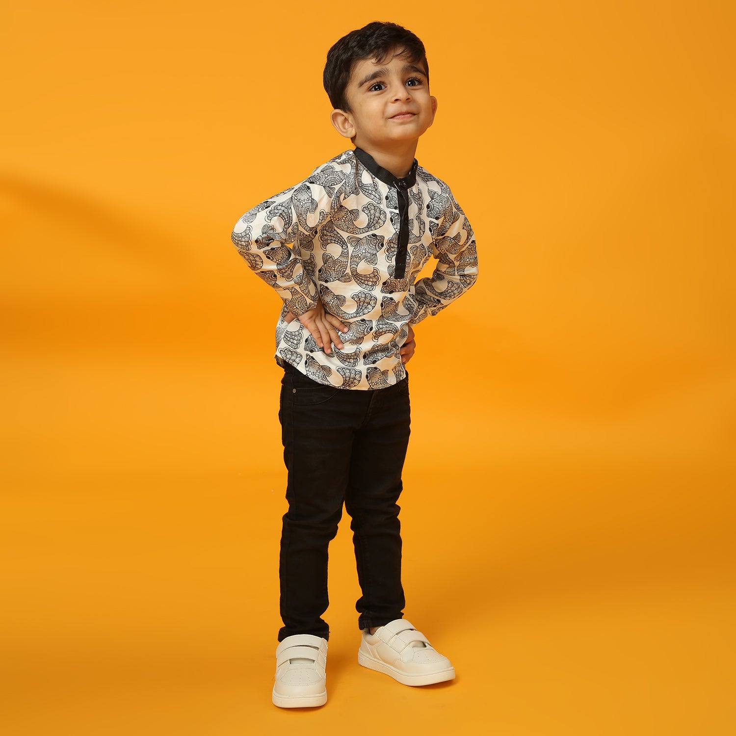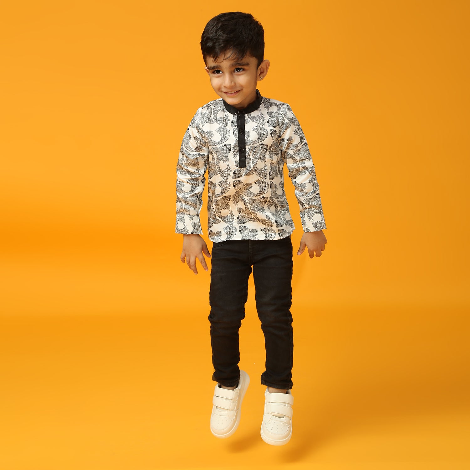 This short kurta for boys showcases a stylish fish print design, complete with a collar and placket detail.