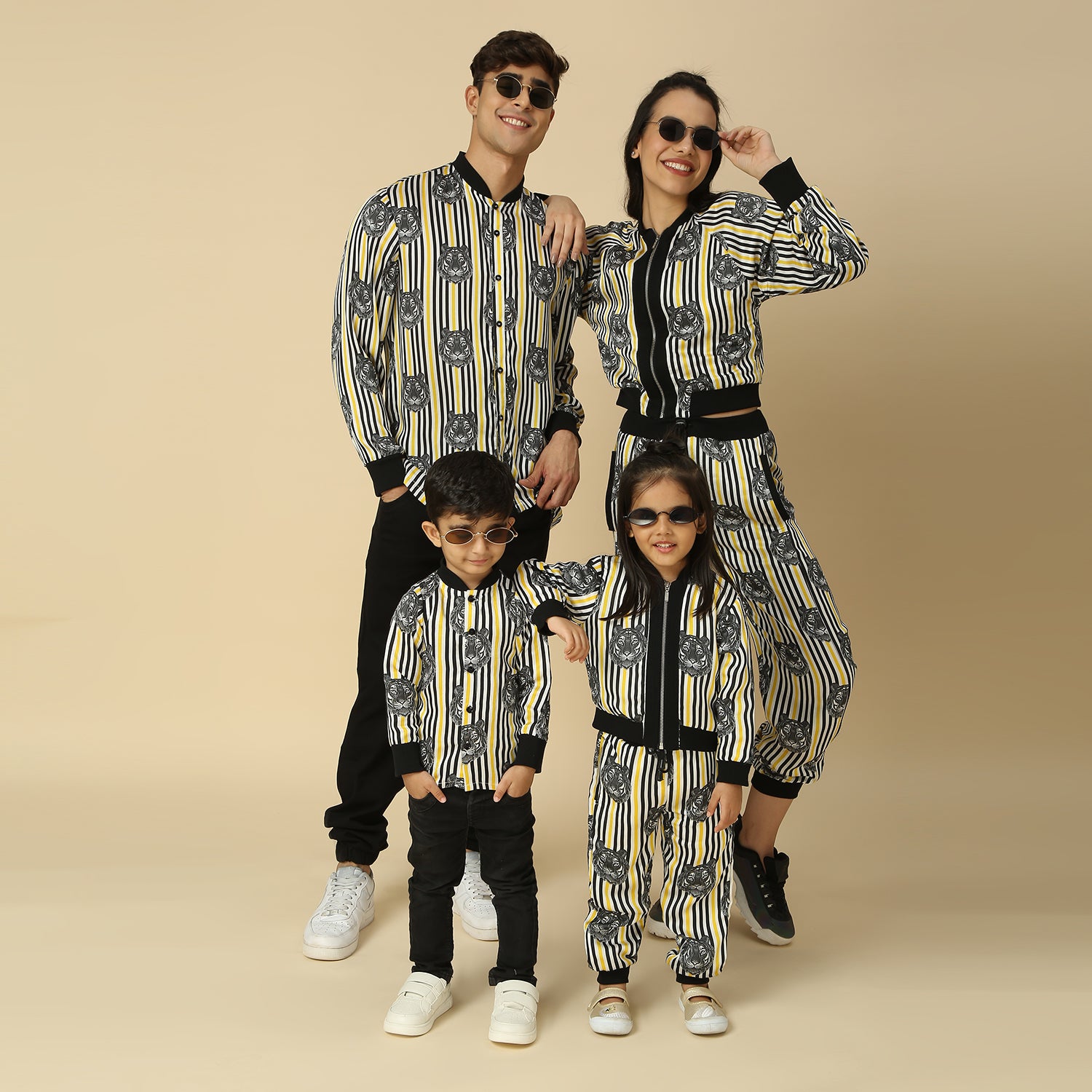 Black white and yellow printed striped jogger pants with a matching jacket for Mother and Daughter