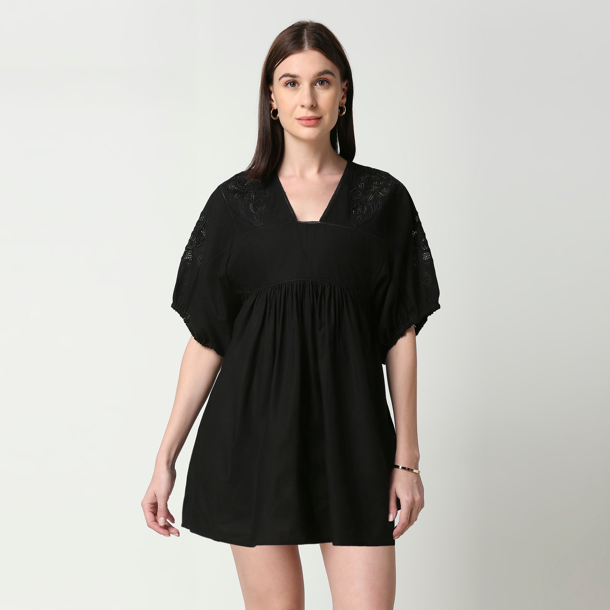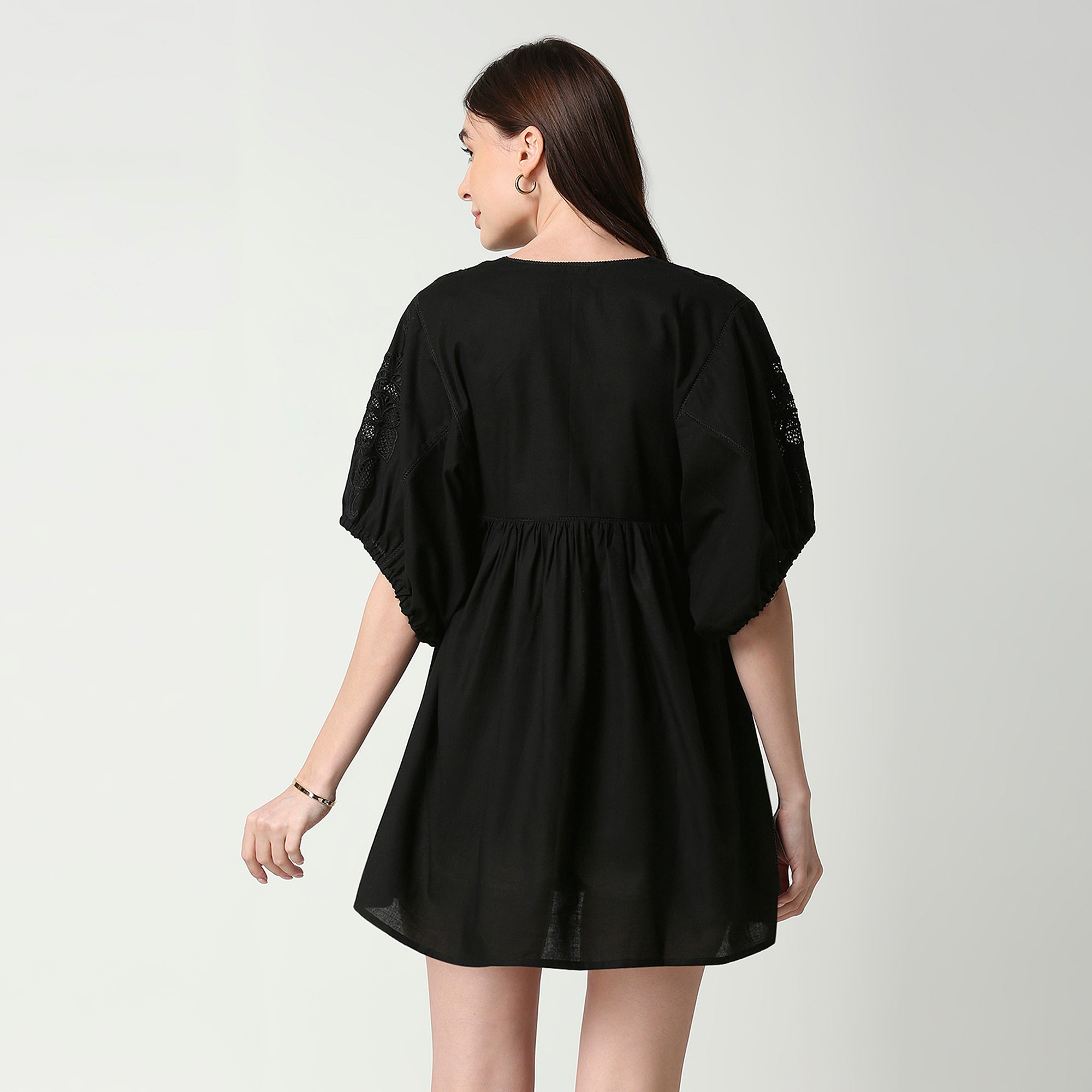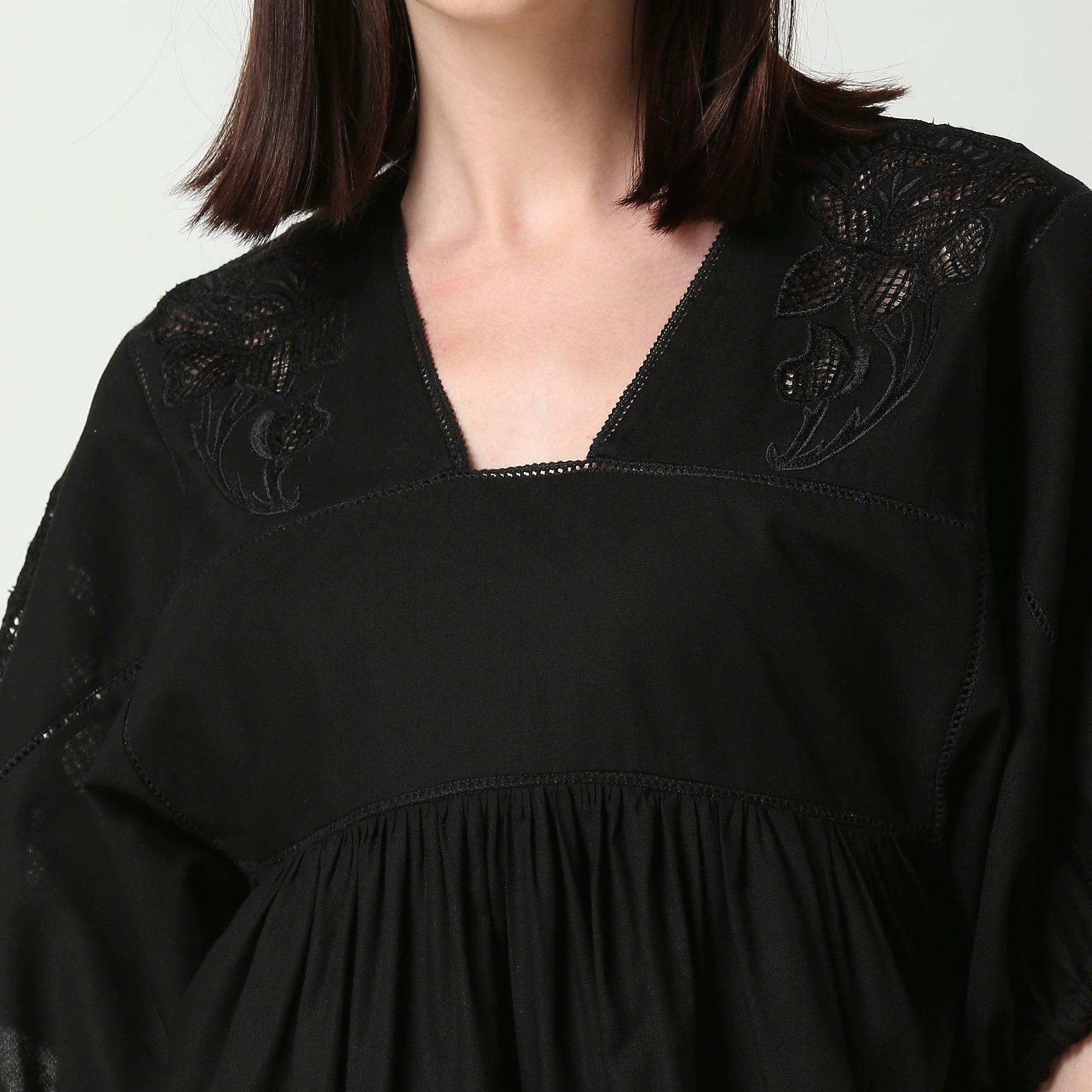 Black butterfly dress with delicate cutwork and lace detailing on the front yoke and sleeves, adding a touch of elegance to your look.