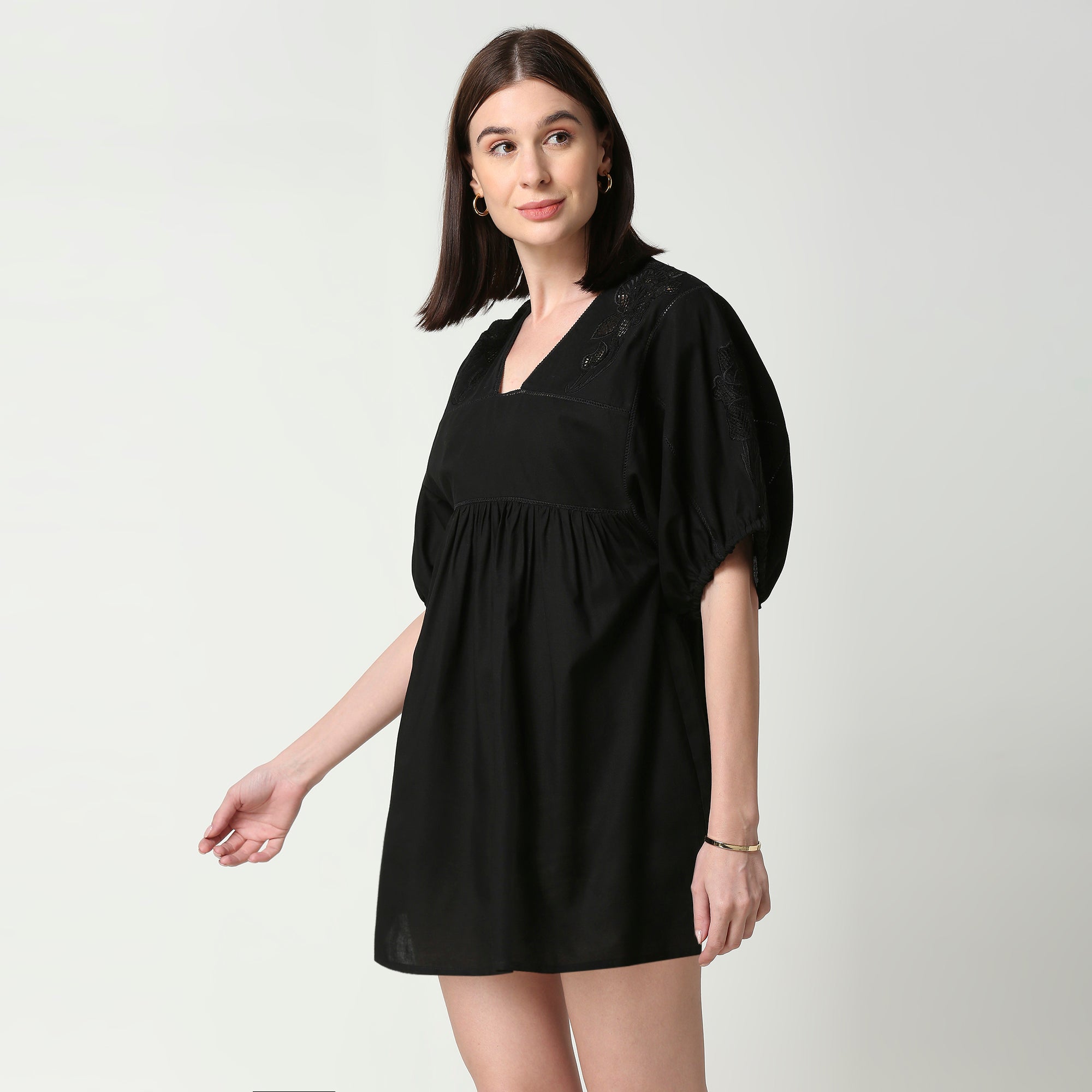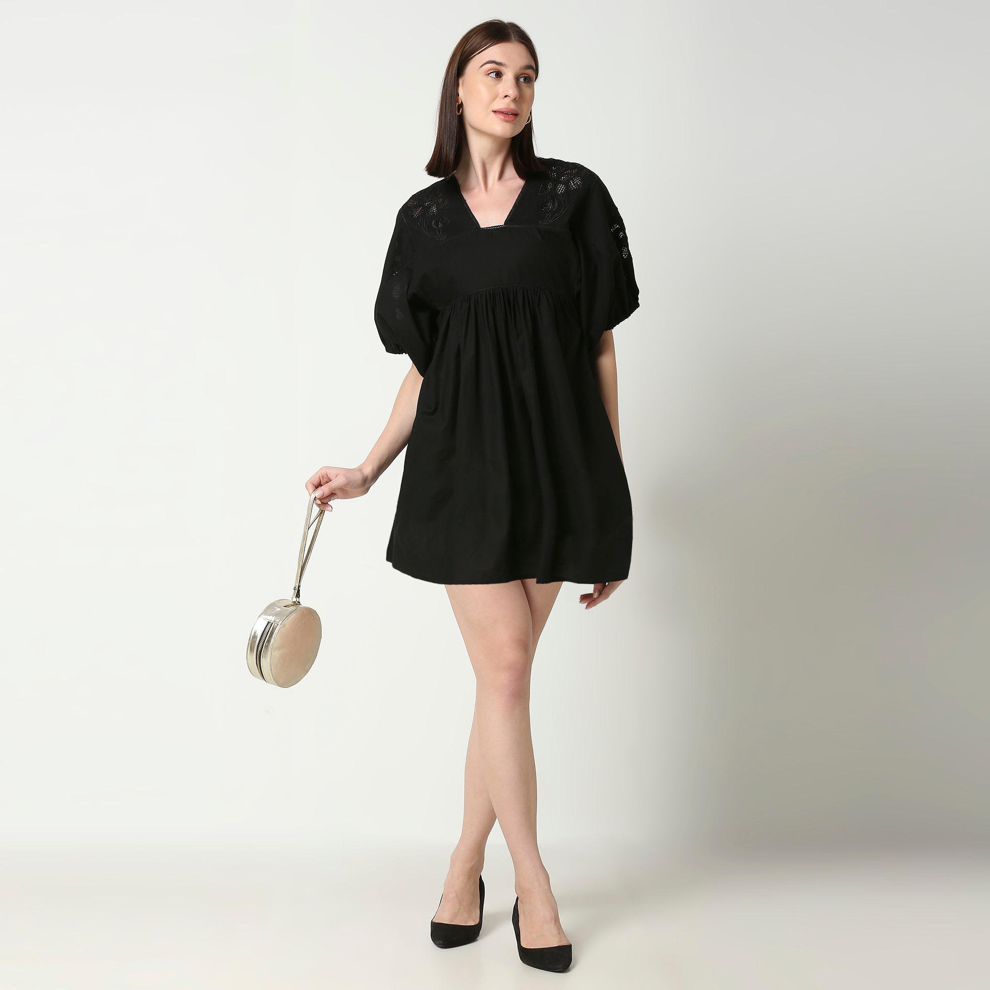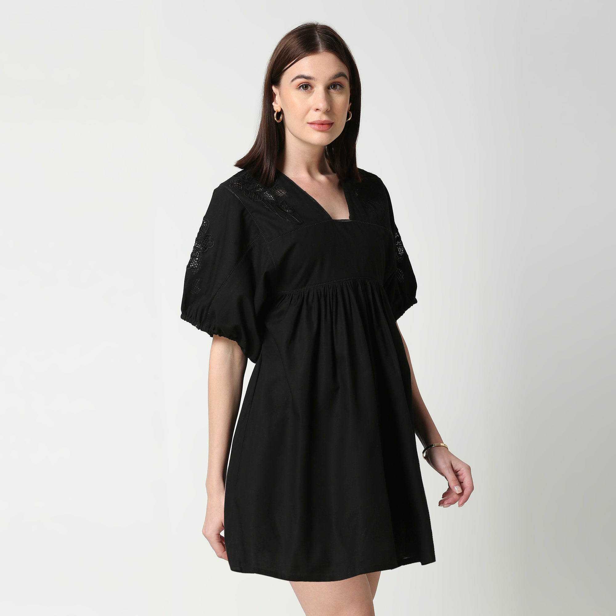Black butterfly dress with delicate cutwork and lace detailing on the front yoke and sleeves, adding a touch of elegance to your look.