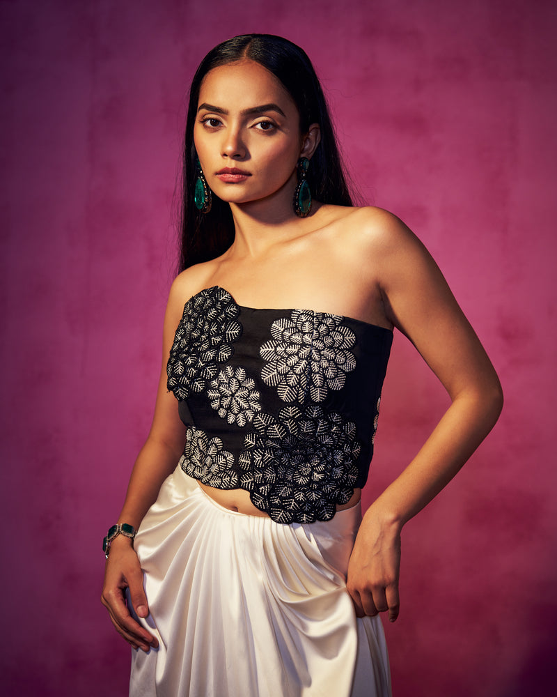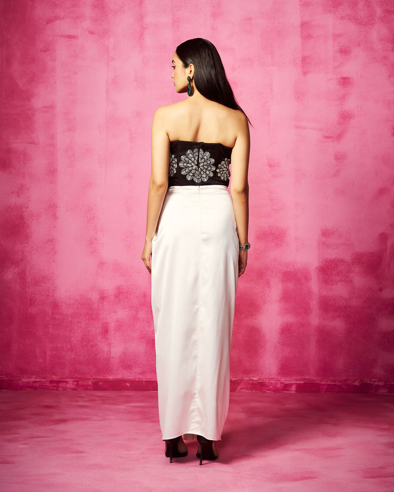 This black corset with skirt features 3D thread embroidery on a cotton silk fabric. The included pre-draped skirt is made of stretch satin in an off-white color.