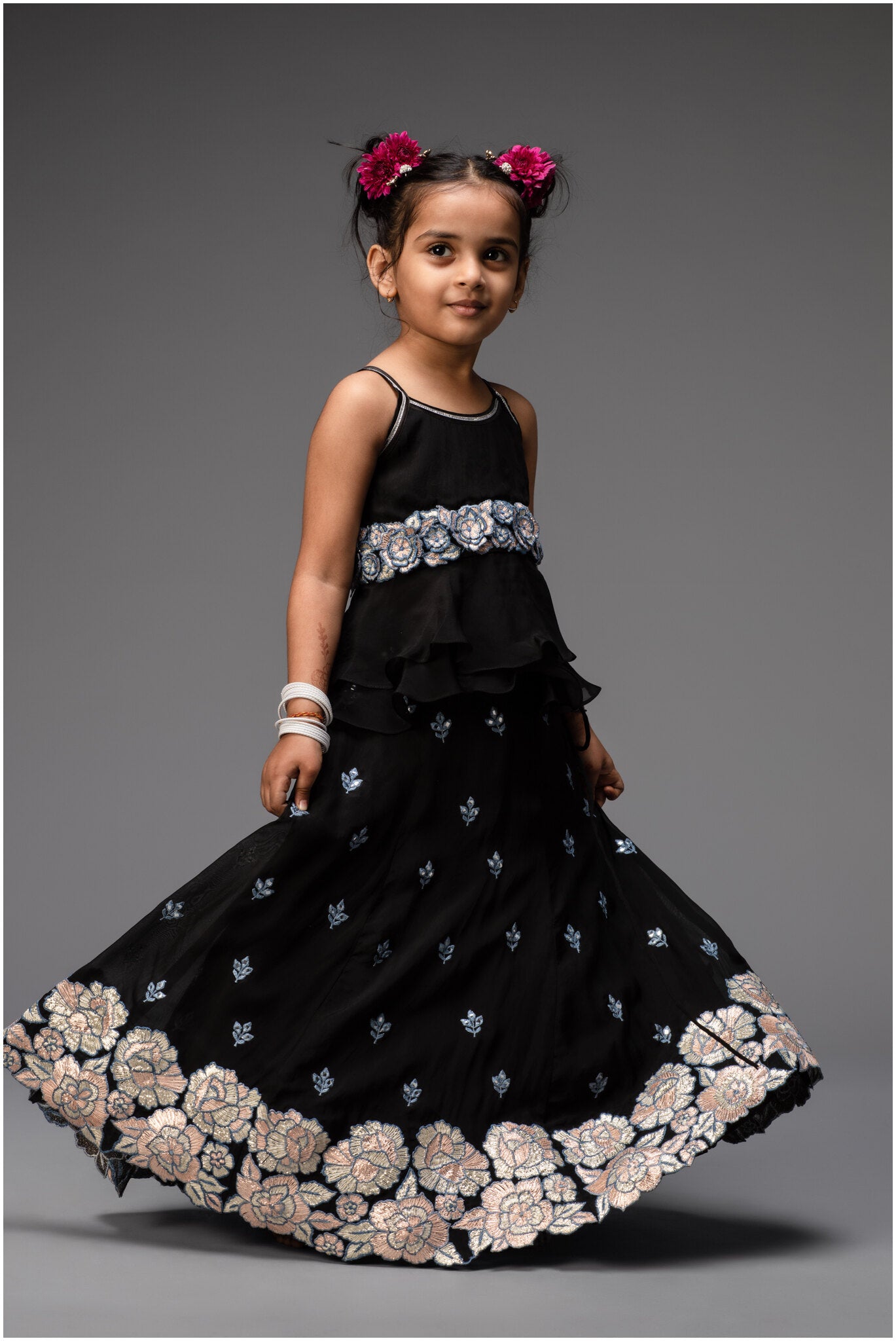 Charcoal Black embroidered lehenga for girls with thread, gota and mirror work embroidery. It is paired with a matching peplum top with 3-D embroidered flowers.