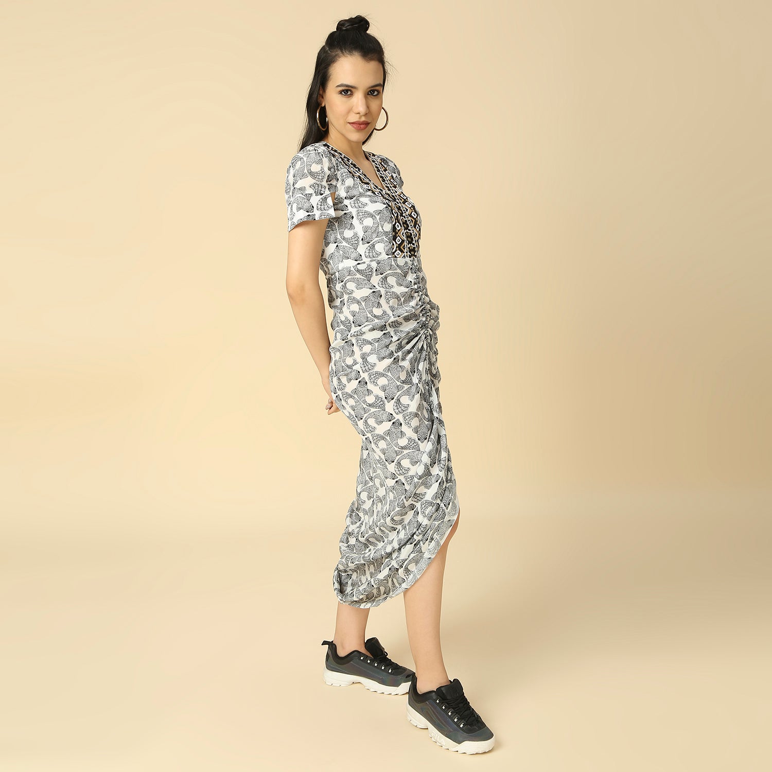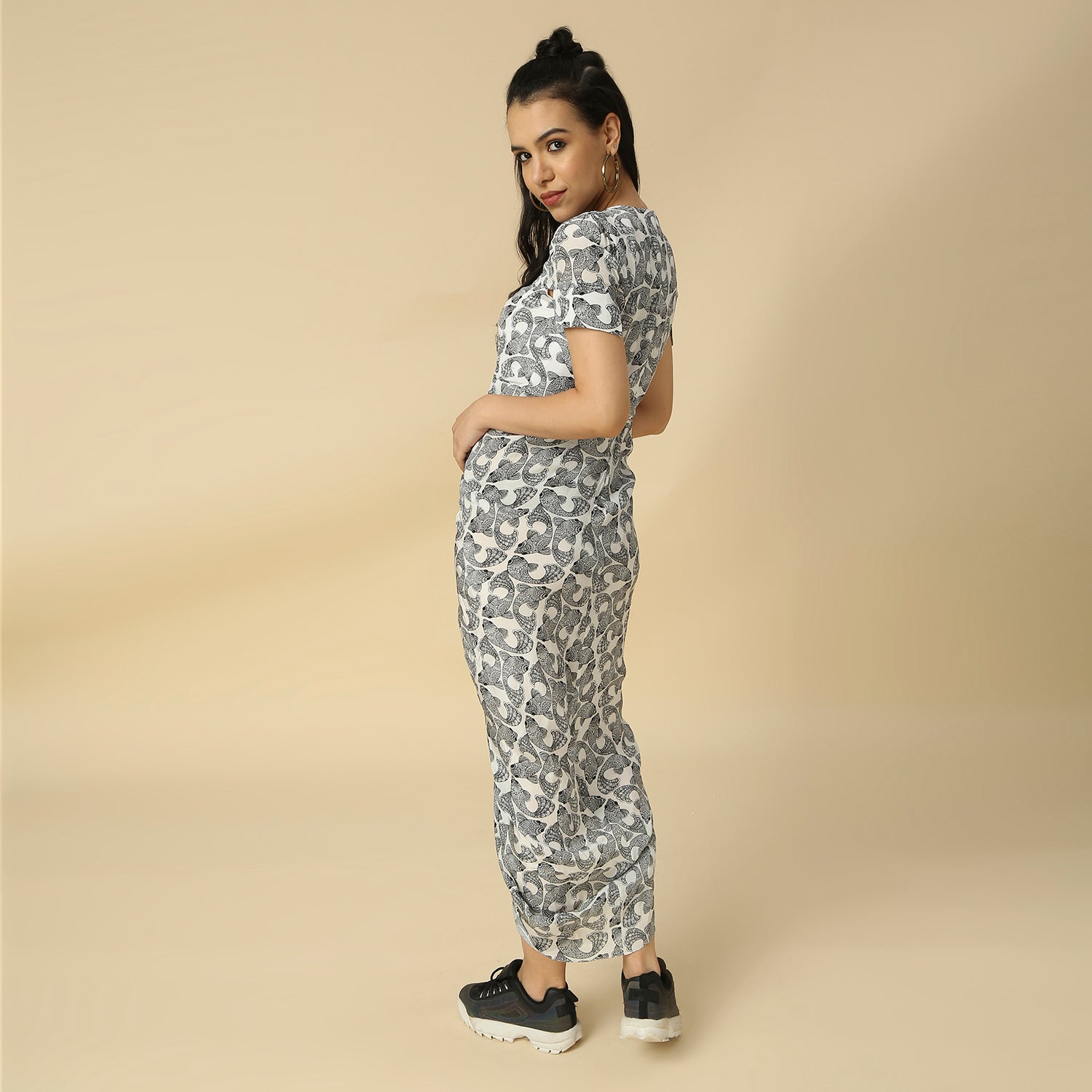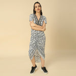Black Fish Print Draped Cocoon Dress