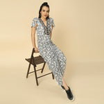 This black and white draped cocoon dress features a fish print and hand-embroidered yoke, all made from viscose crepe for a luxurious touch.