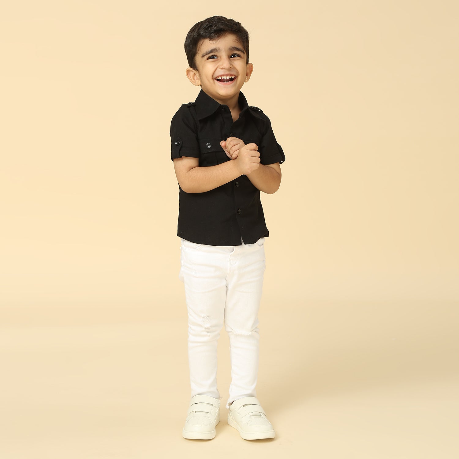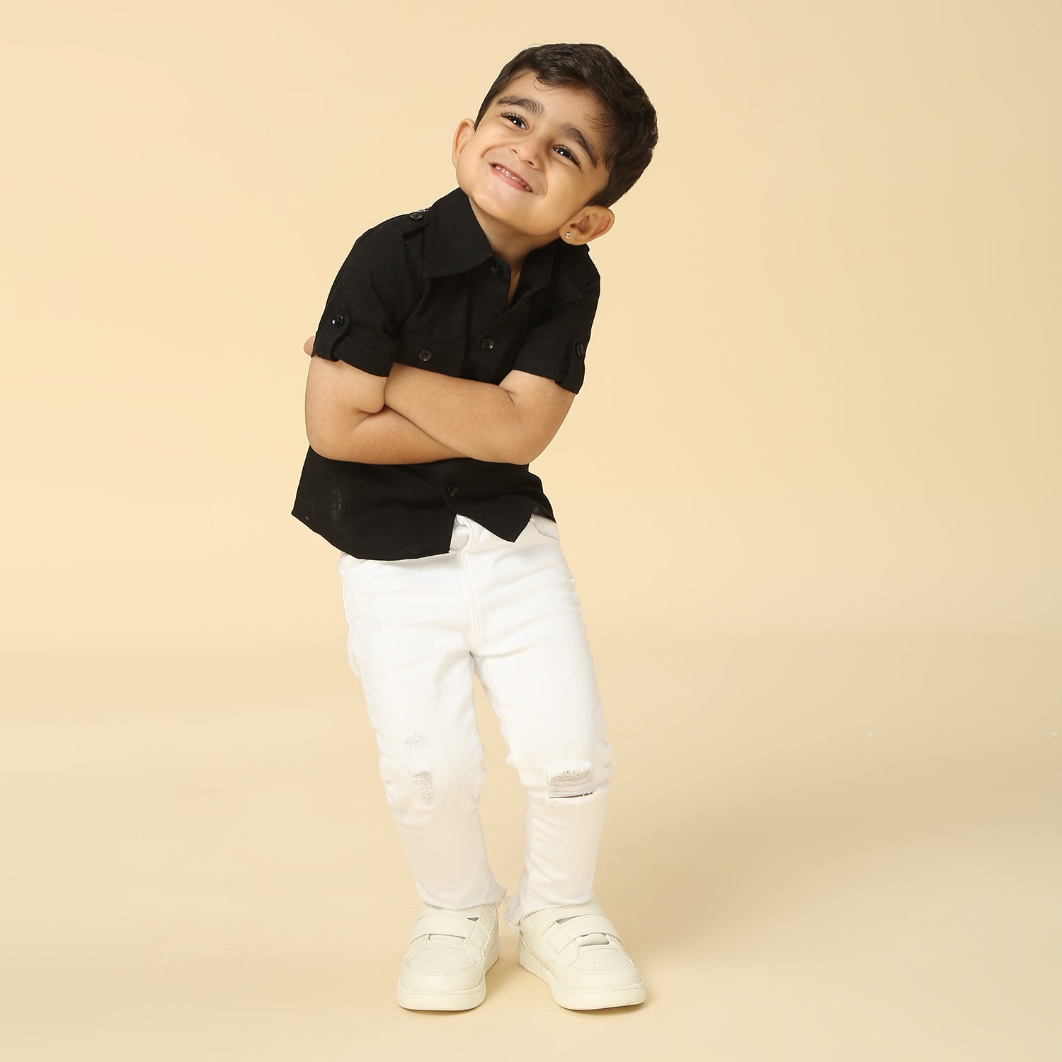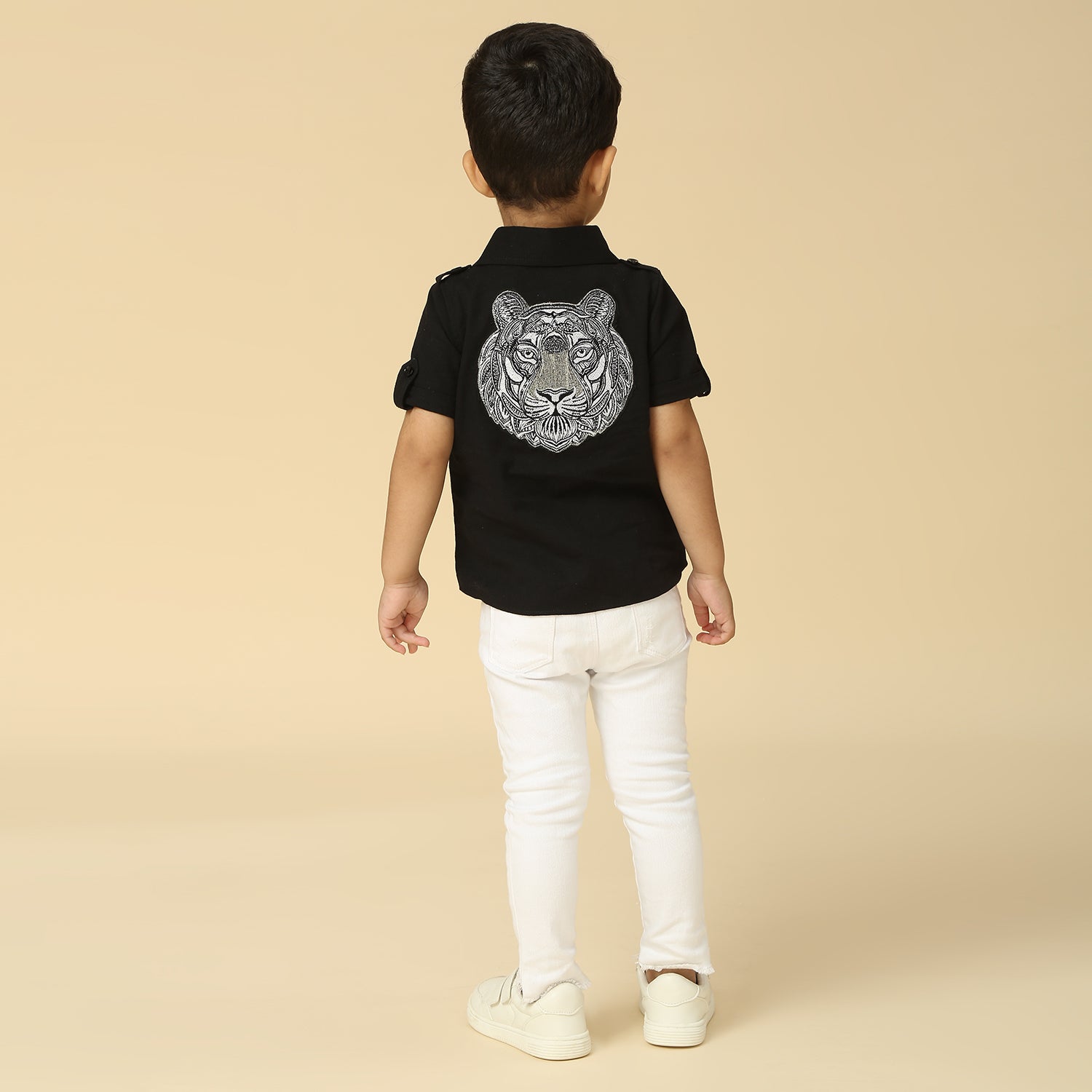Black Linen button down shirt for boys featuring front pocket details and embroidered tiger motif at the back.