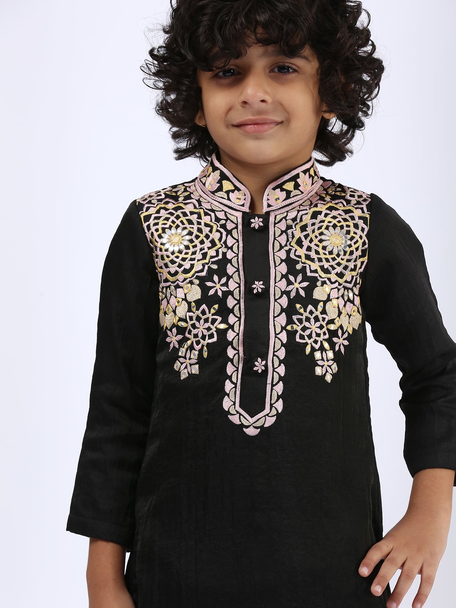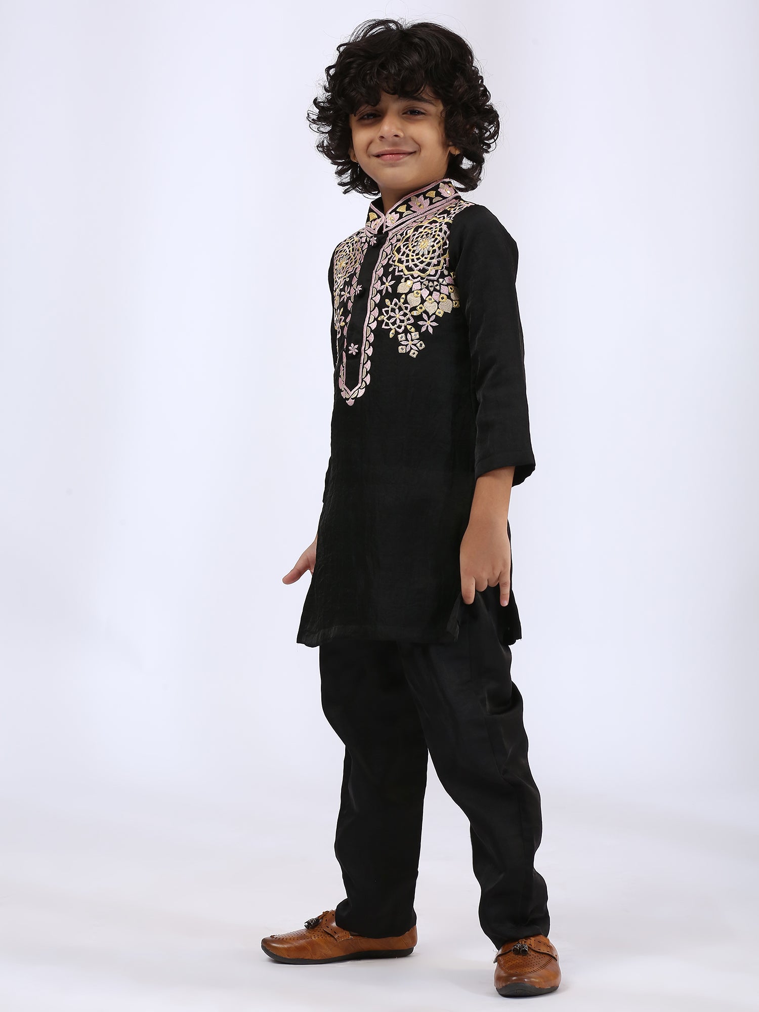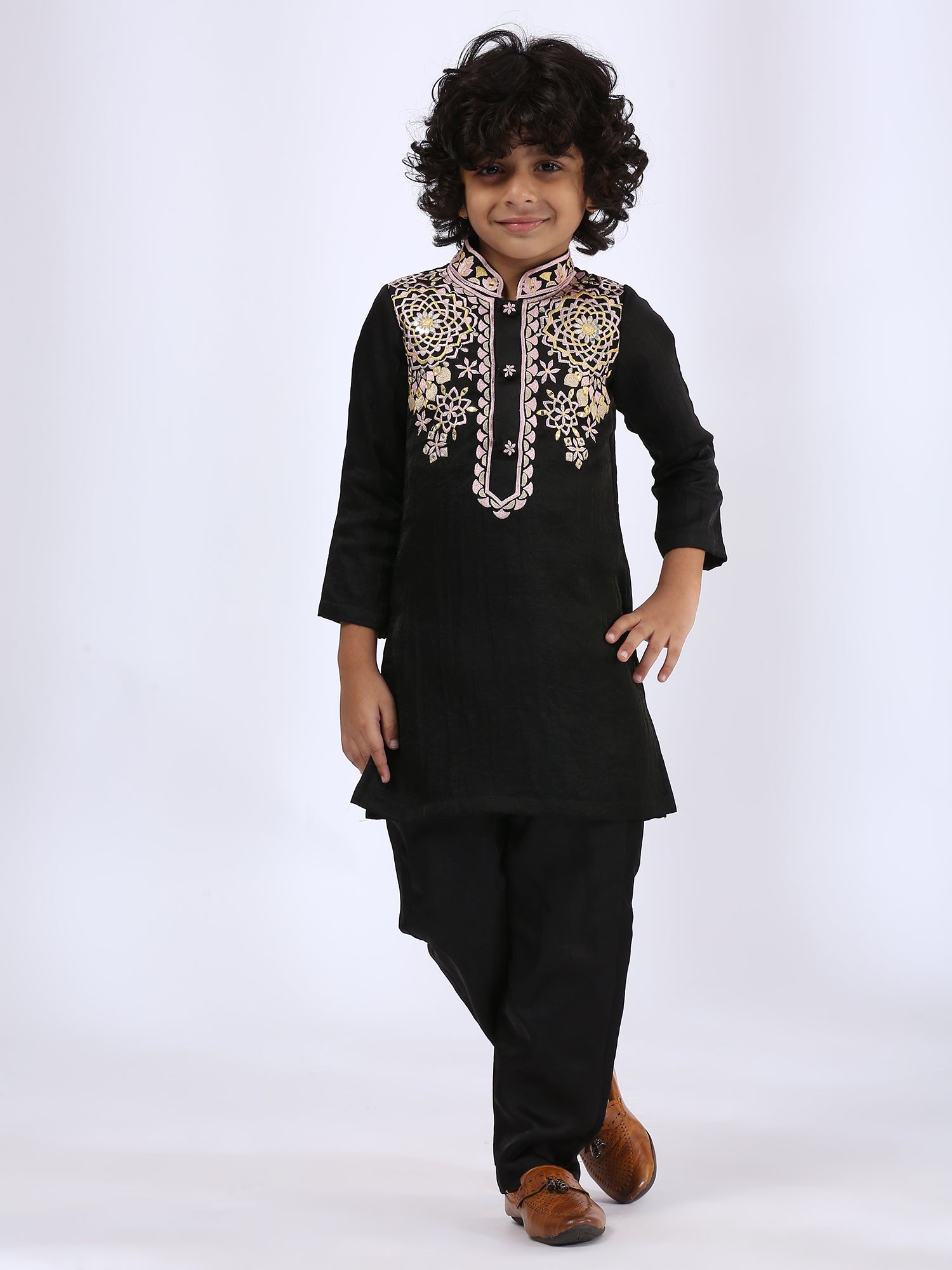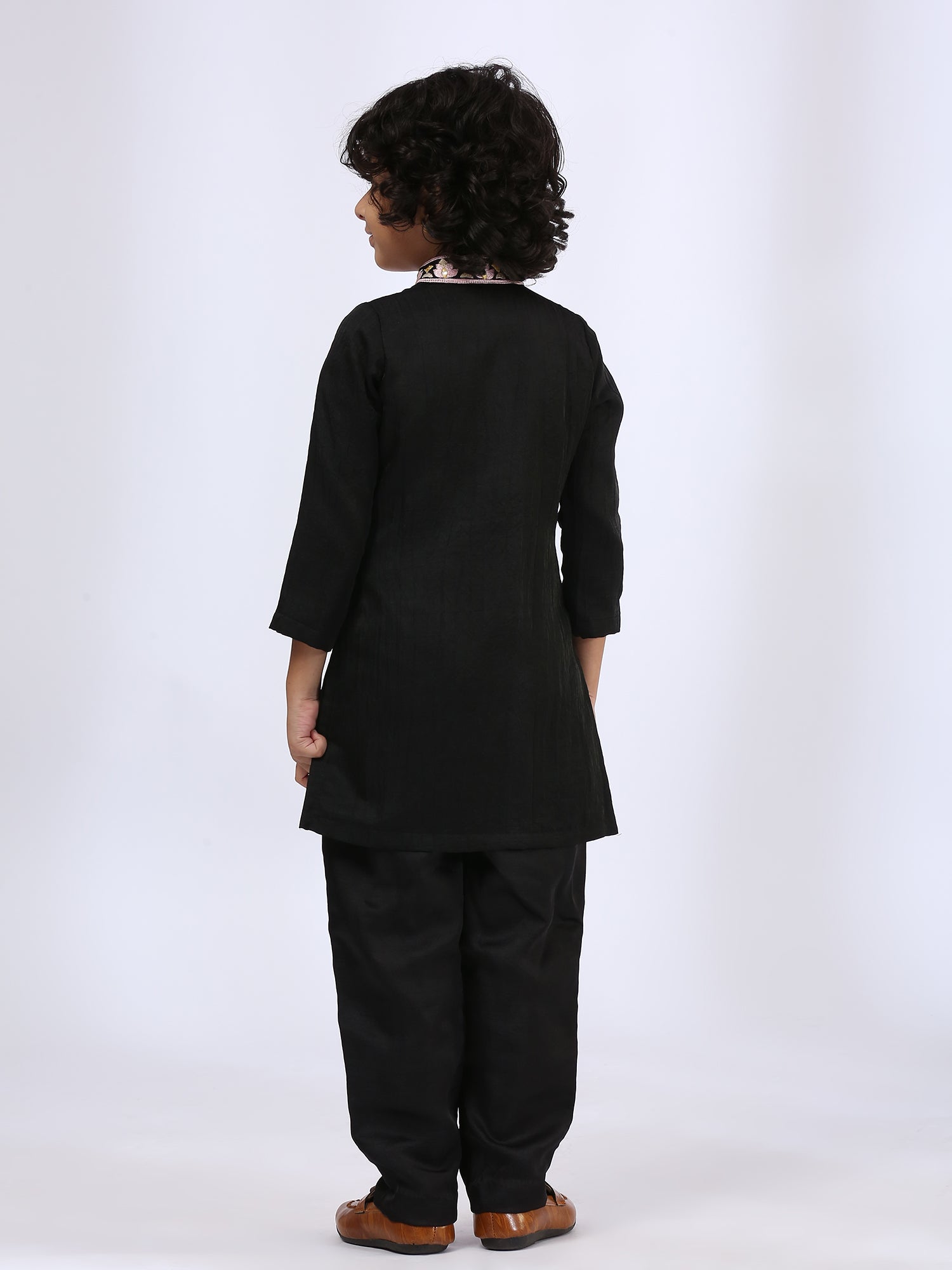 This Black Satin Linen Embroidered Kurta and Pant Set for boys features elegant embroidery and intricate threadwork, perfect for adding a touch of sophistication to child's your wardrobe. The kurta pairs perfectly with the narrow pants included in the set. Perfect for a stylish desi look.