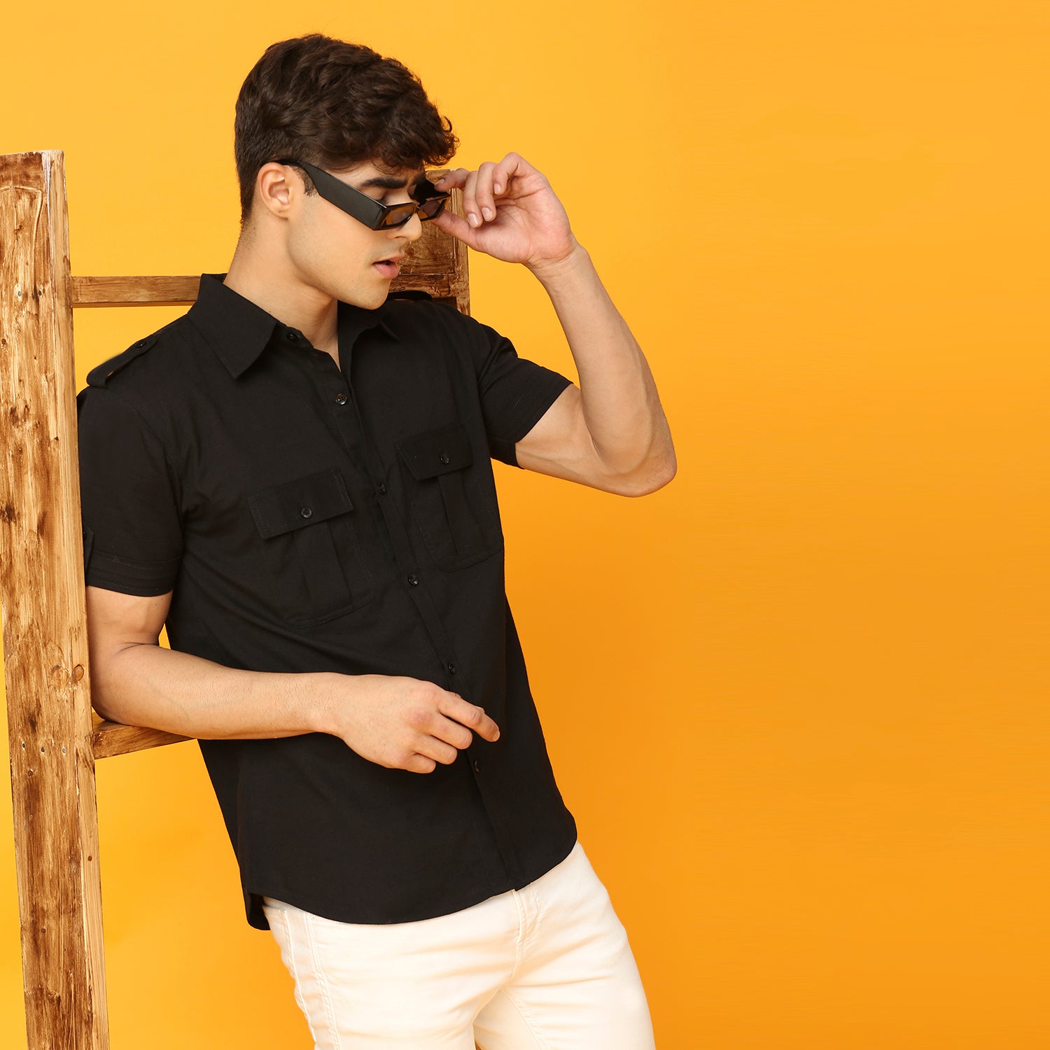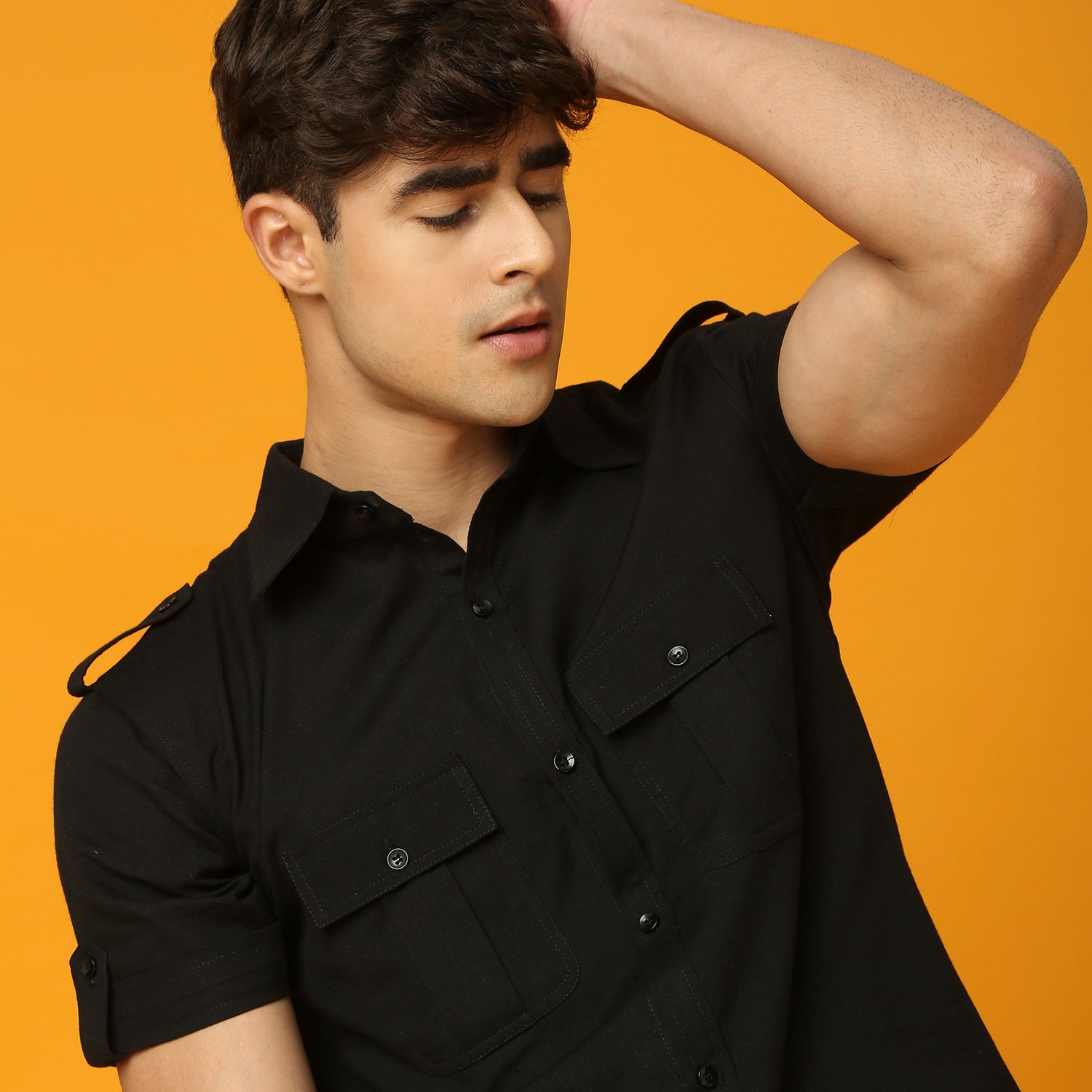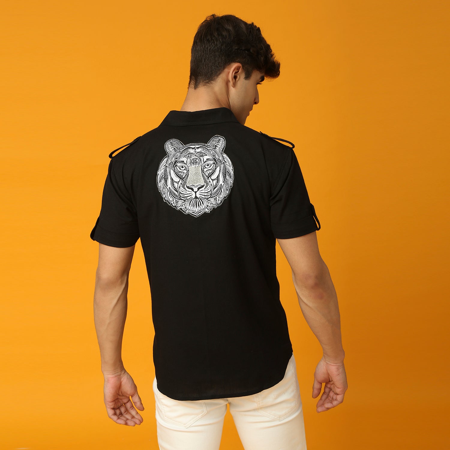 Black Linen button down shirt with front pocket details and embroidered tiger motif at the back