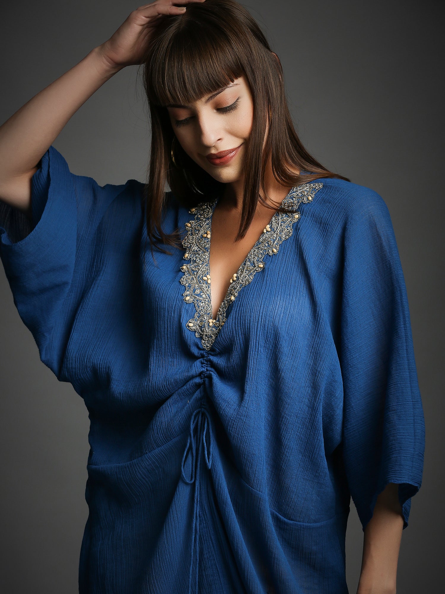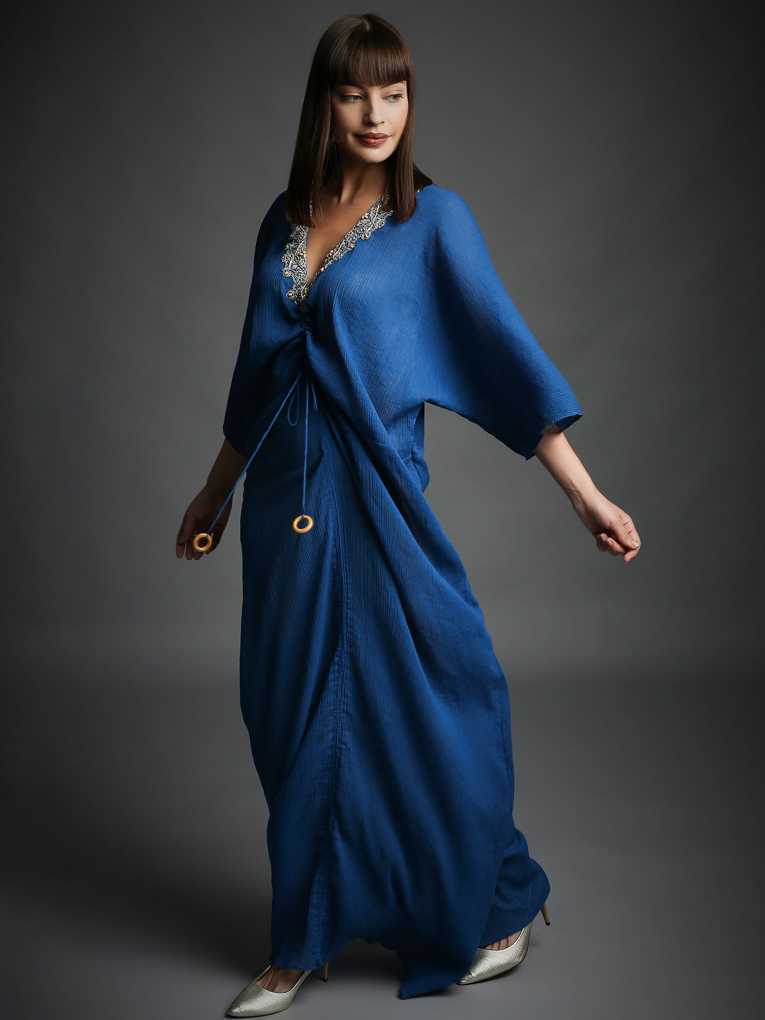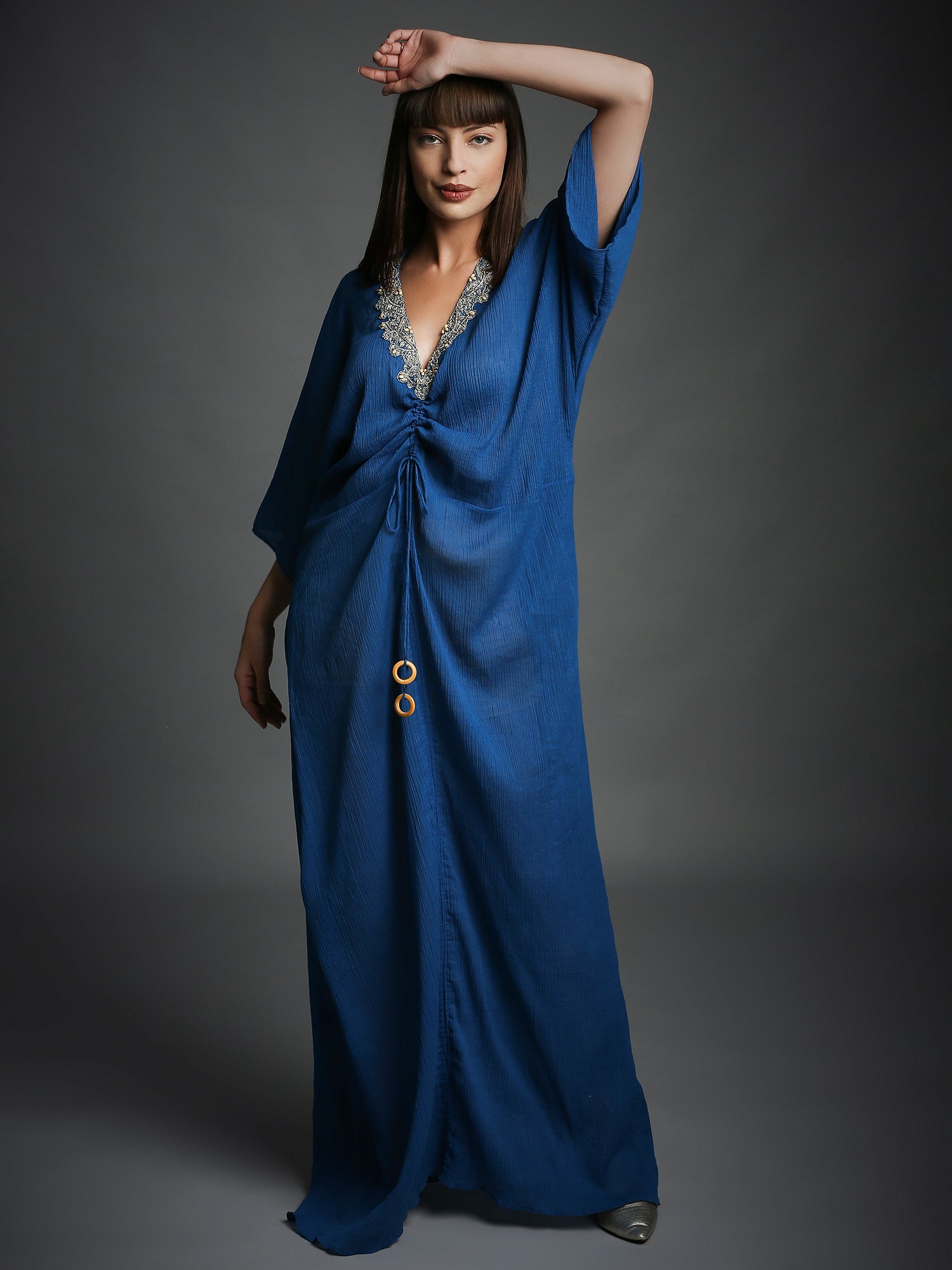Blue kaftan in crinkled cotton with center front drawstring details. It is front enhanced with beadwork embroidery on the neckline.