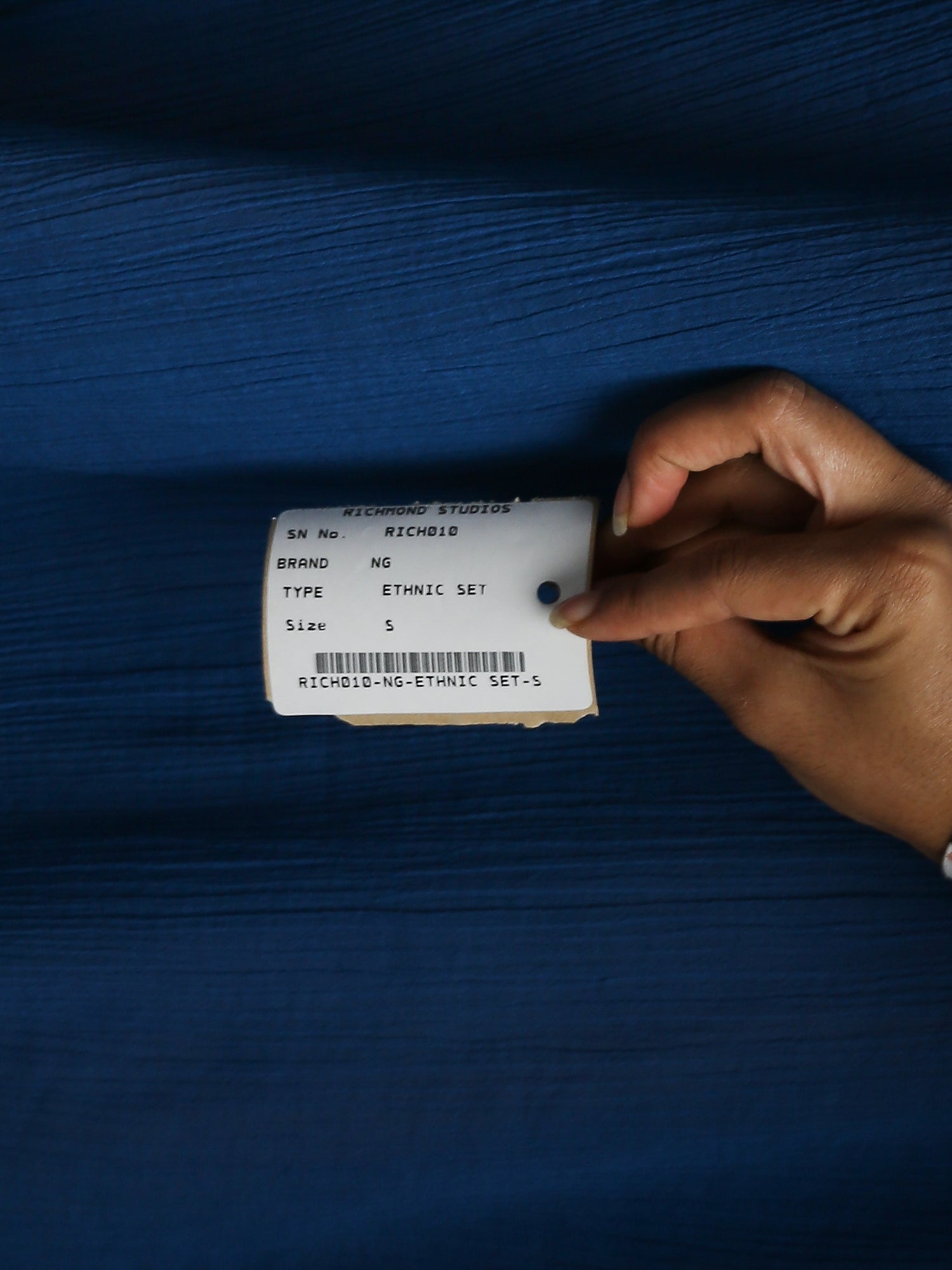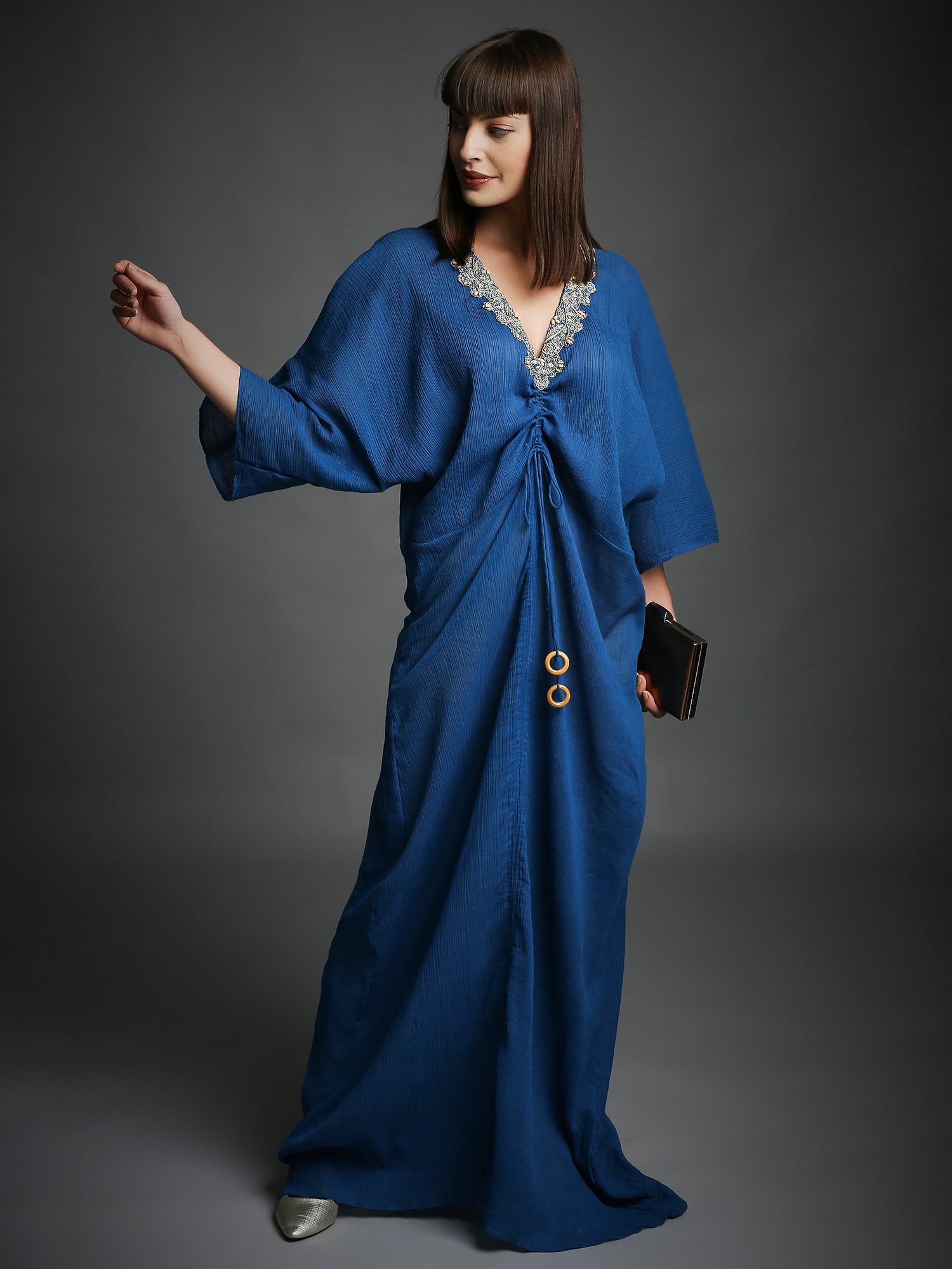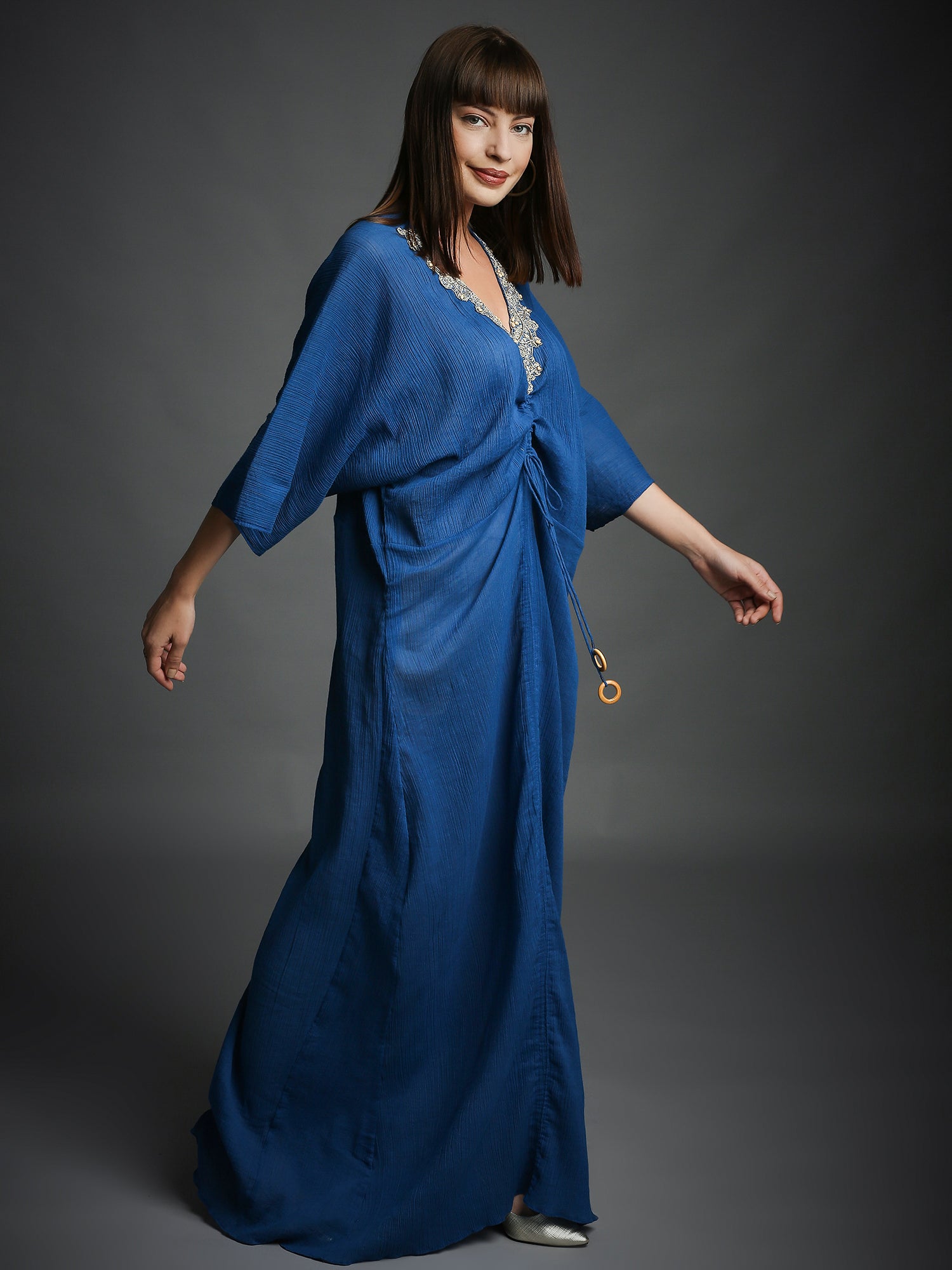Blue kaftan in crinkled cotton with center front drawstring details. It is front enhanced with beadwork embroidery on the neckline.