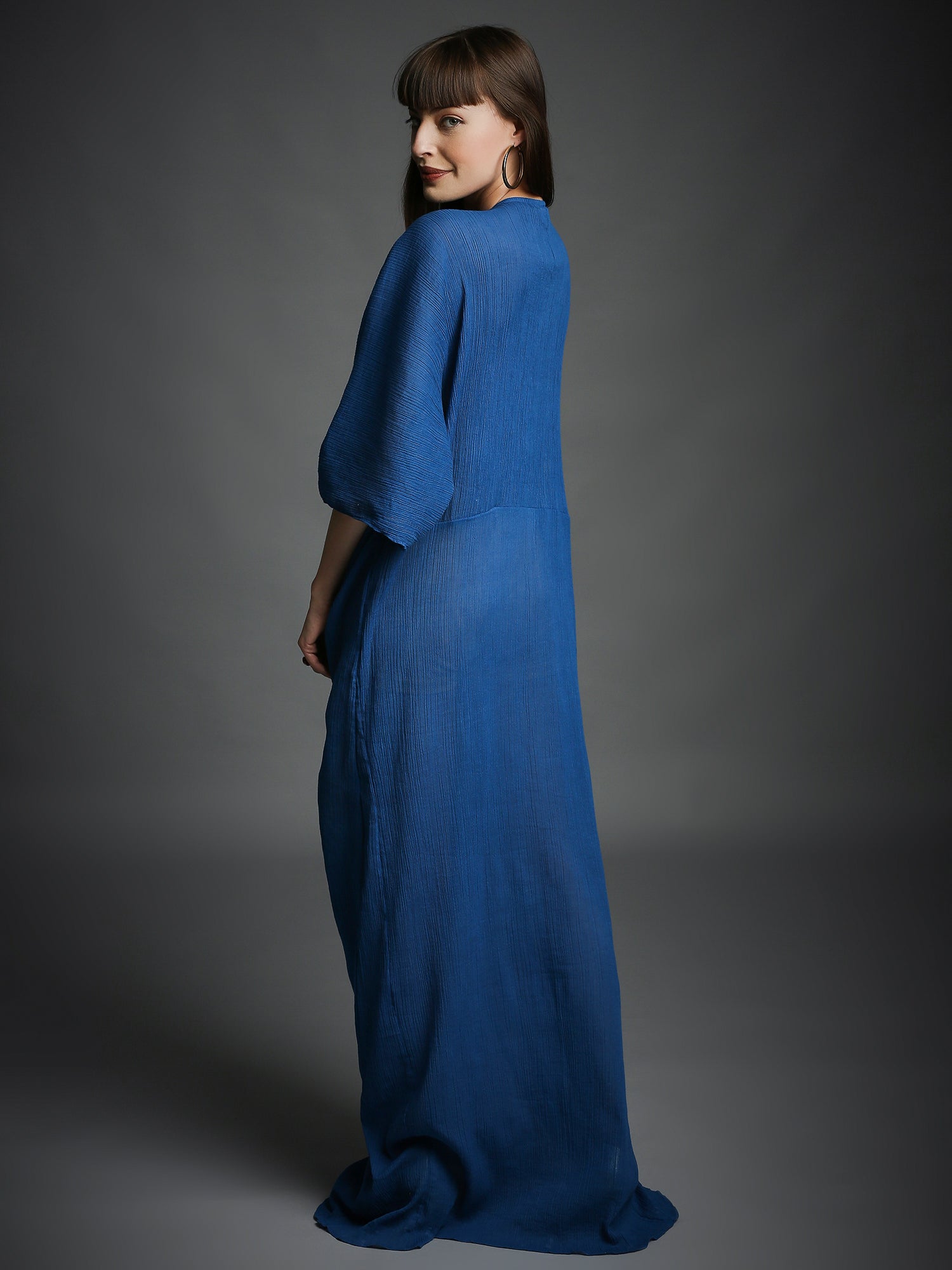Blue Crinkled Cotton Embroidered Neckline Kaftan