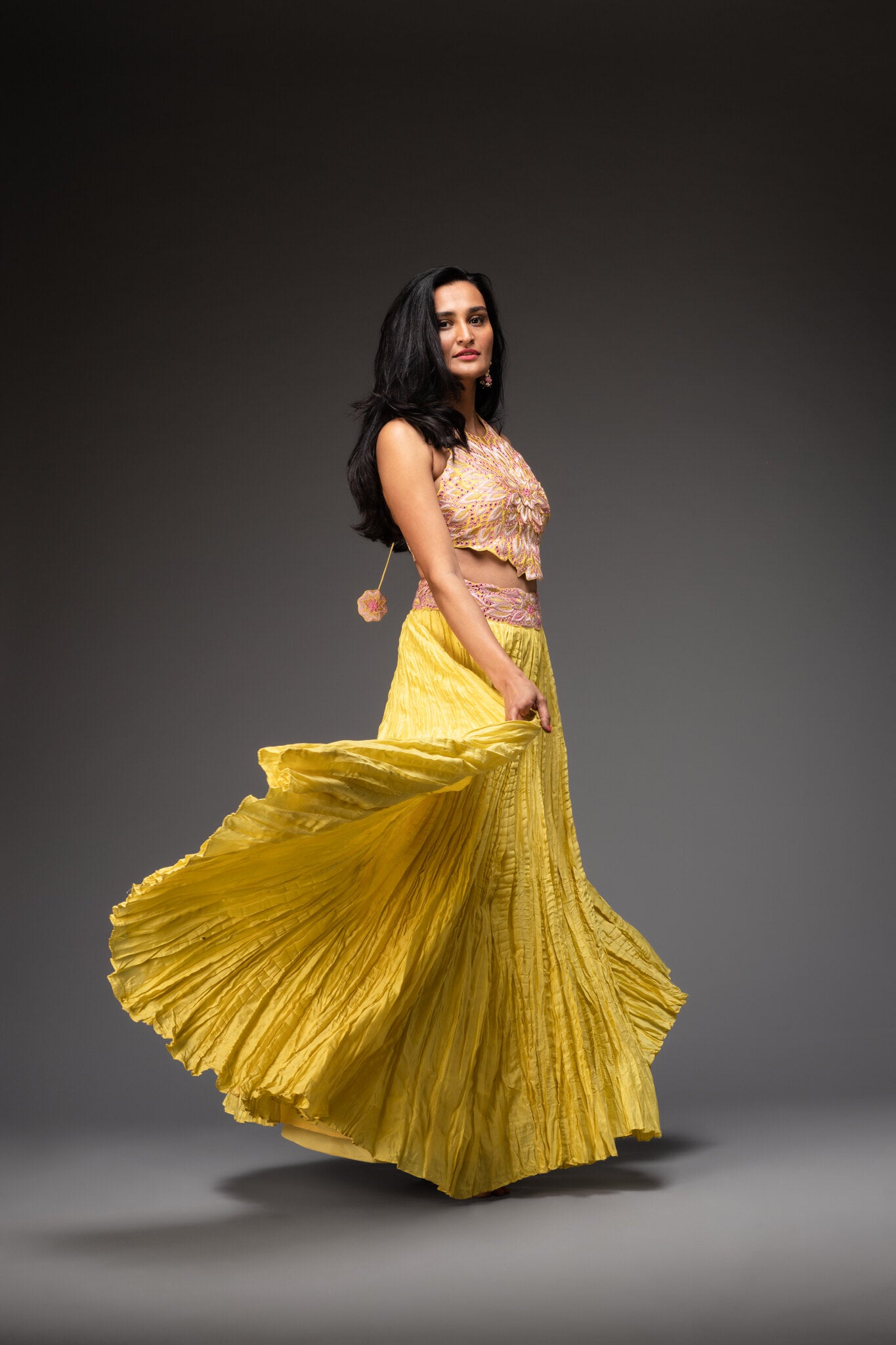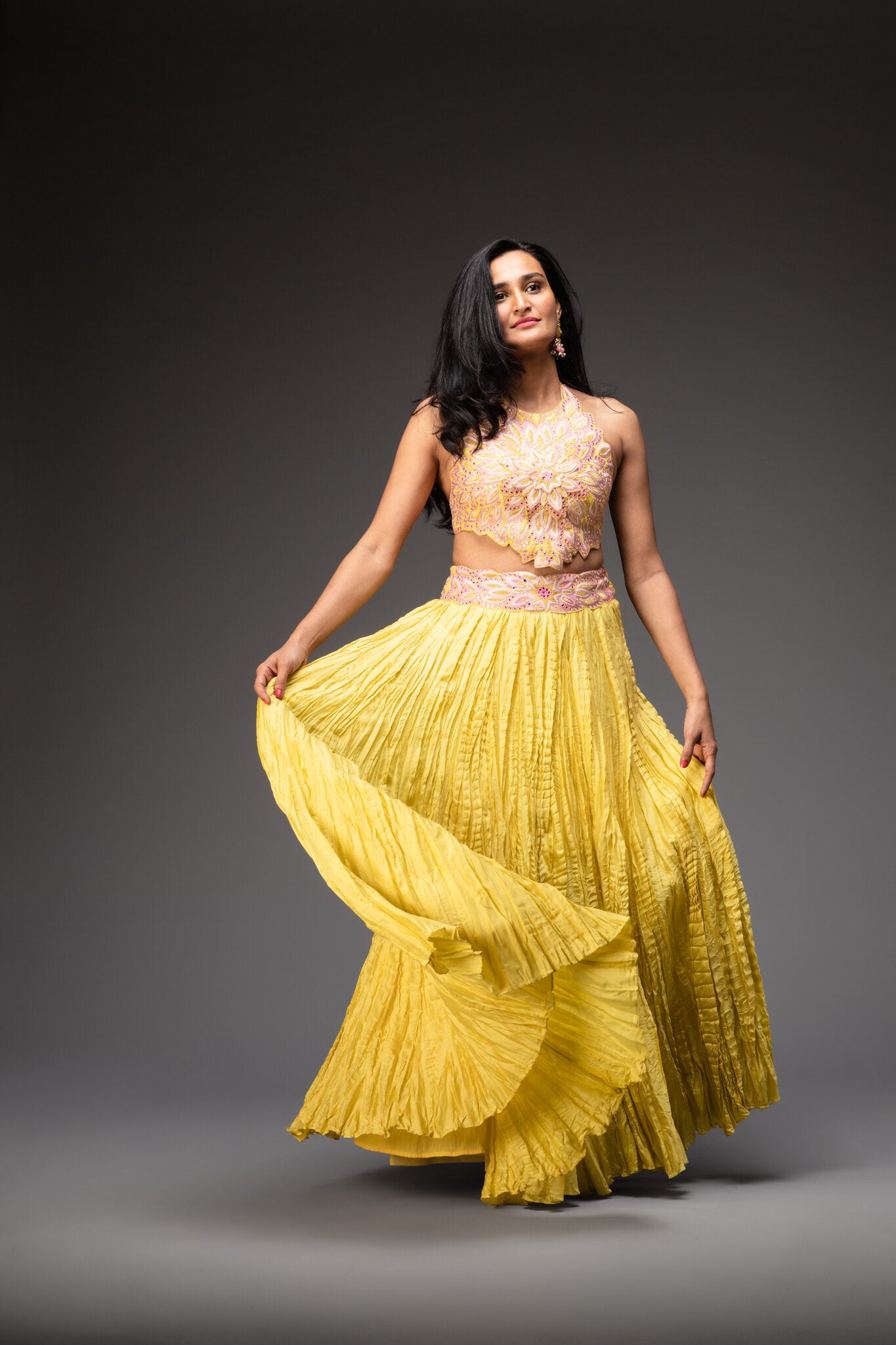 This lemon yellow crinkled lehenga features a 3D embroidered waistband, paired with a chanderi halter blouse for a complete look.