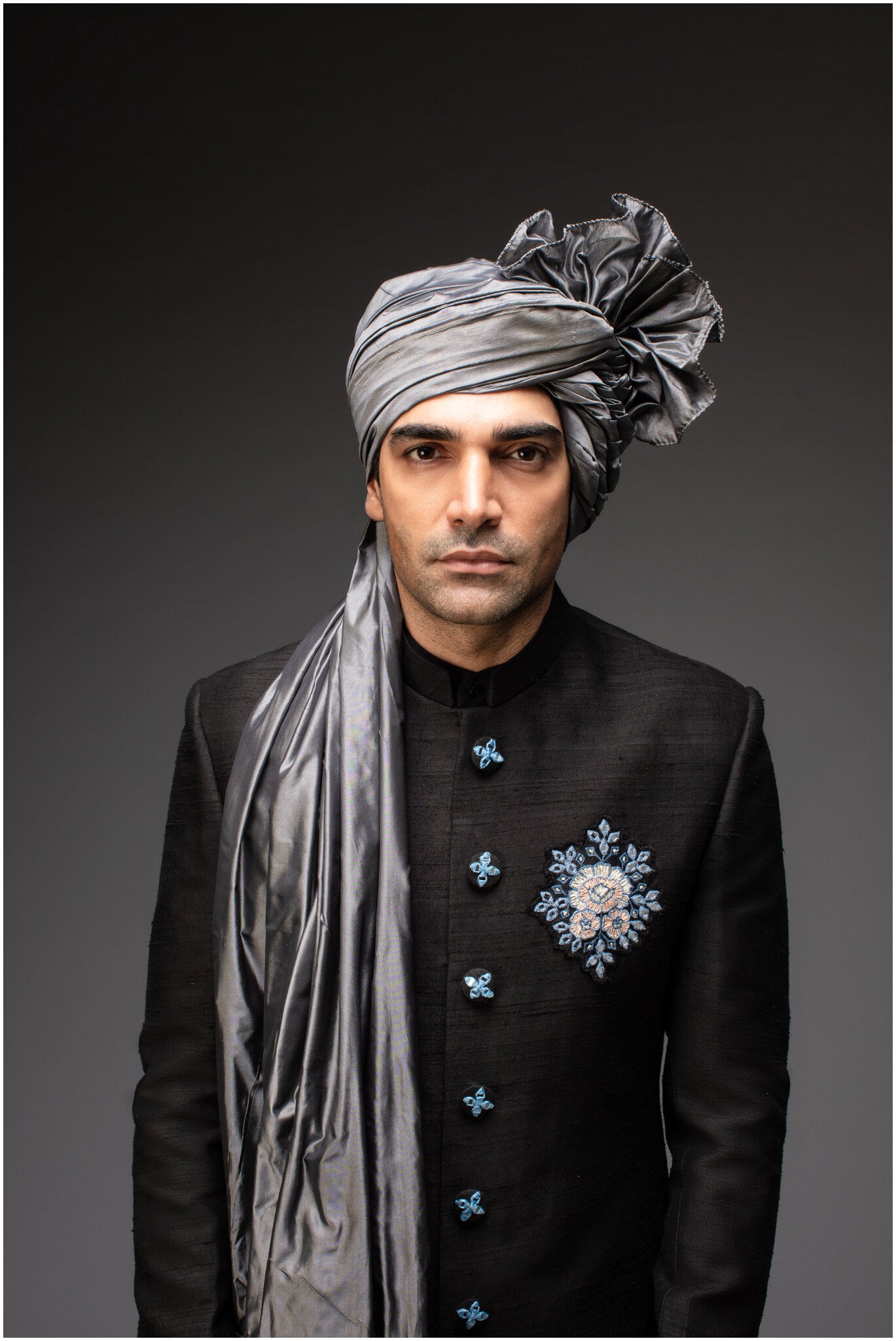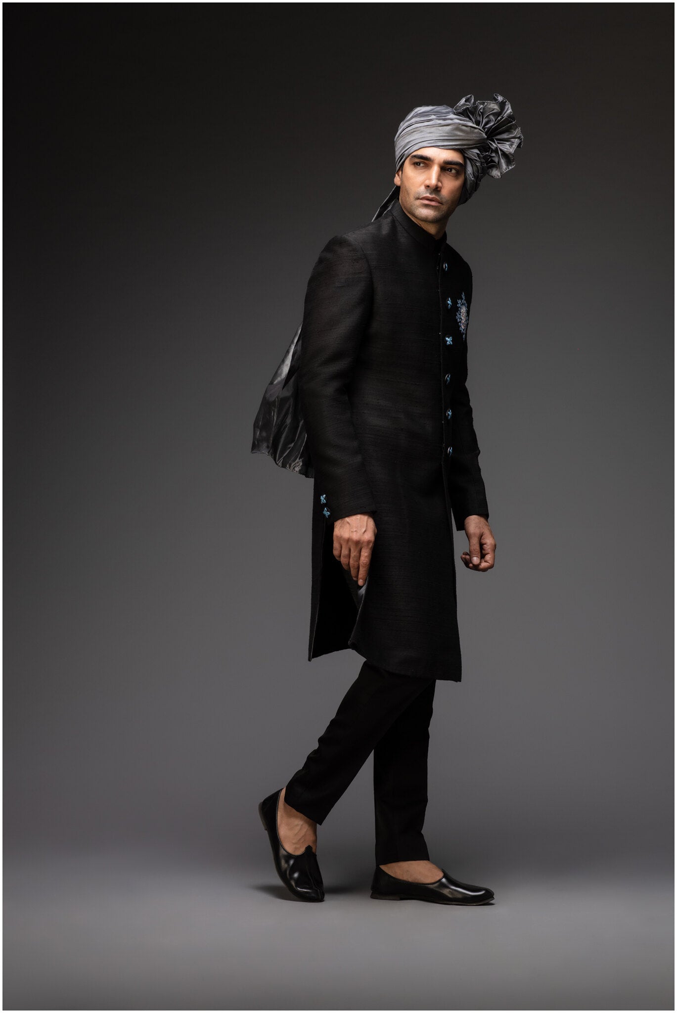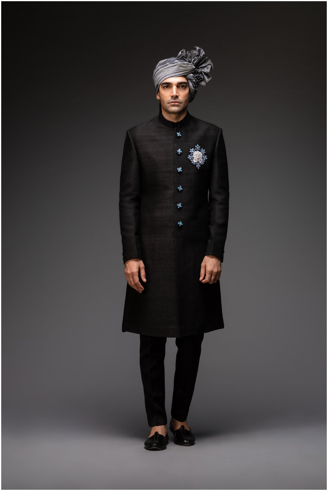 Charcoal black raw silk sherwani with embroidered buttons and crest on the chest. It is paired with black narrow pants