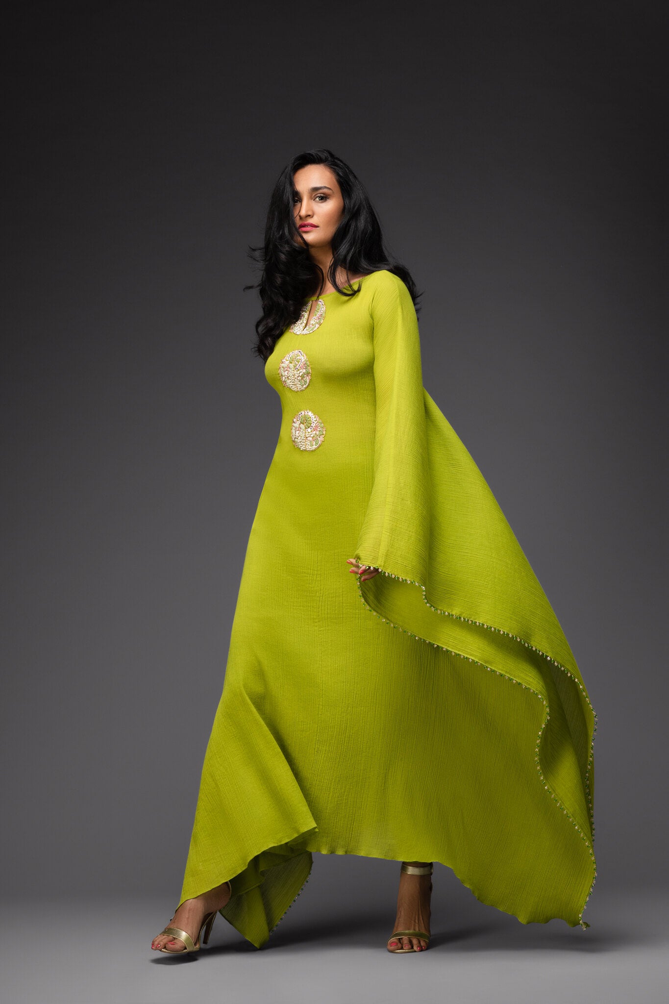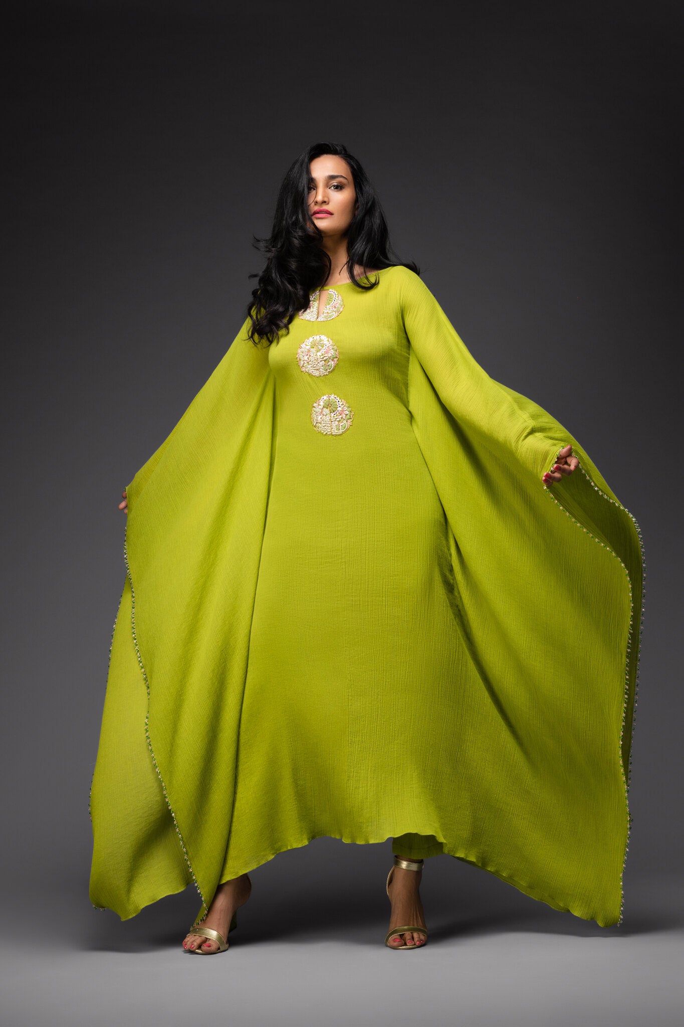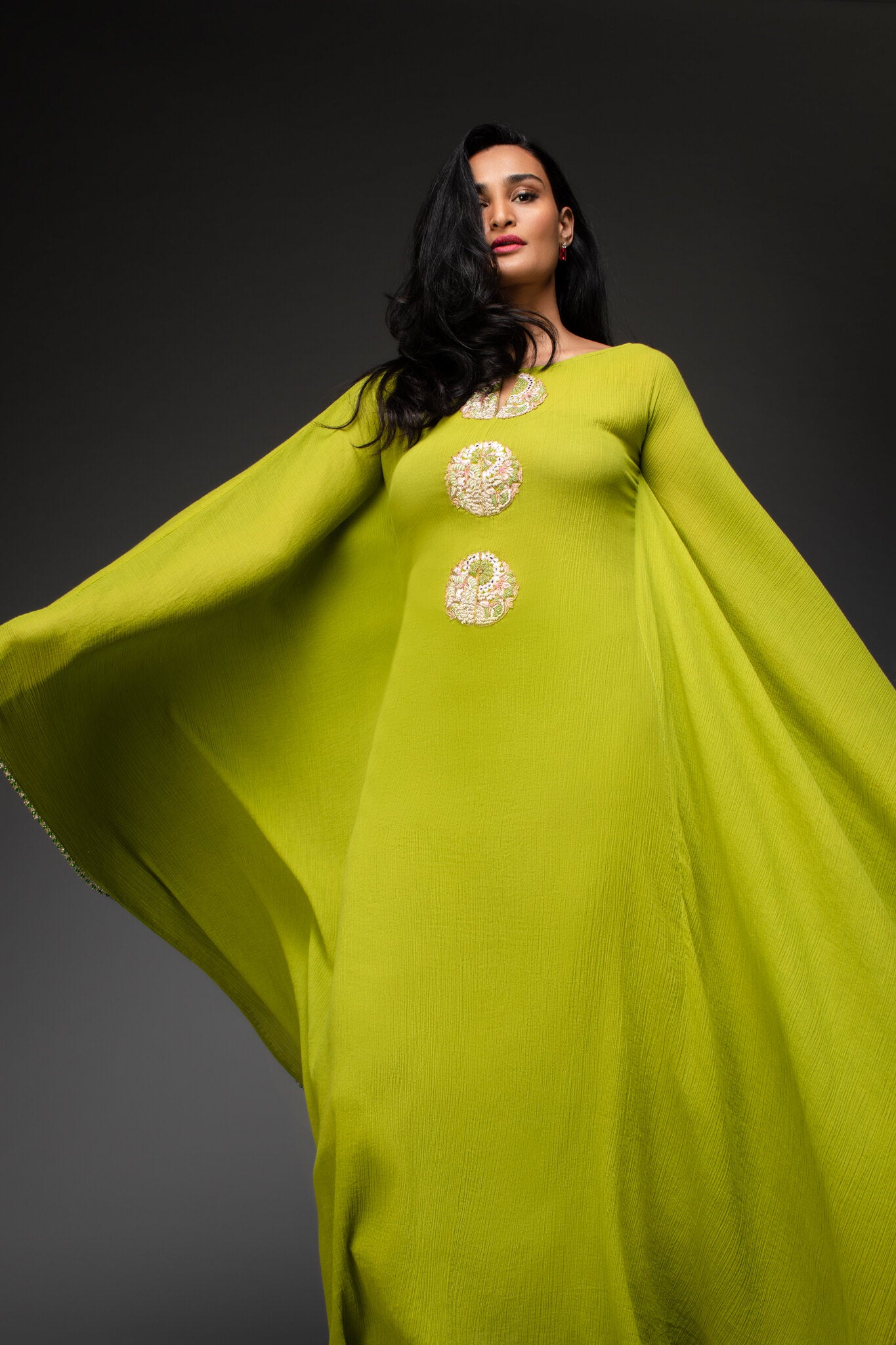 Crafted from crinkled cotton, this kurta and pant set features a chartreuse green kaftan-style kurta with a delicate embroidered yoke and keyhole neckline. The asymmetric hem adds a touch of uniqueness to this ensemble, making it a must-have for any wardrobe.