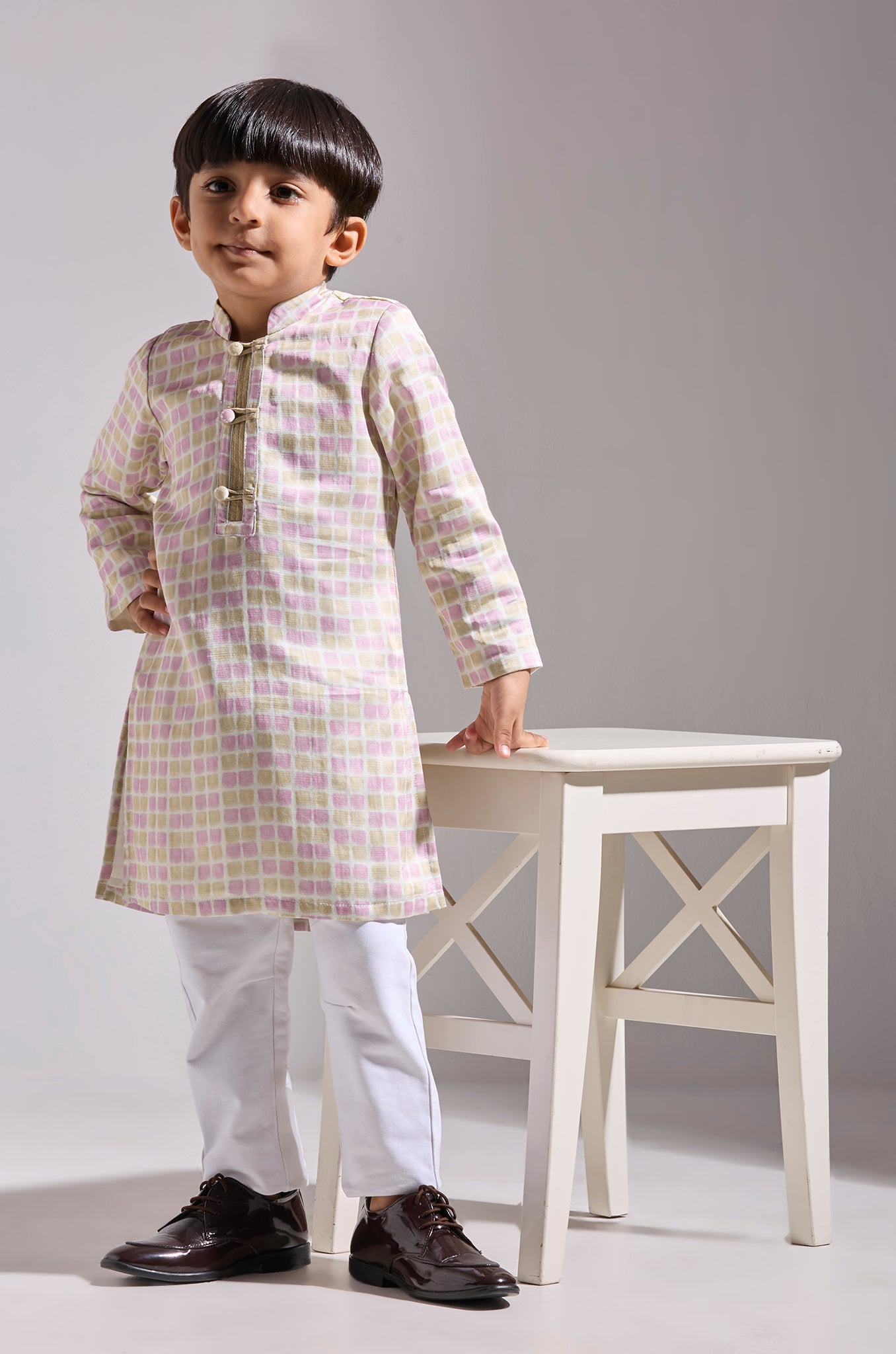 Featuring kurta in satin linen for boys featuring cube print, enhanced with contrast details on placket.
