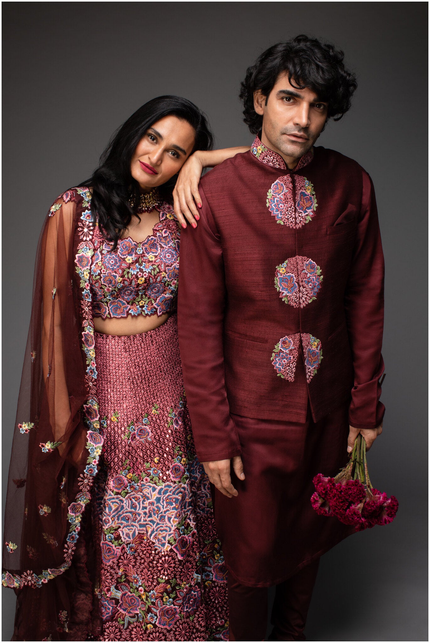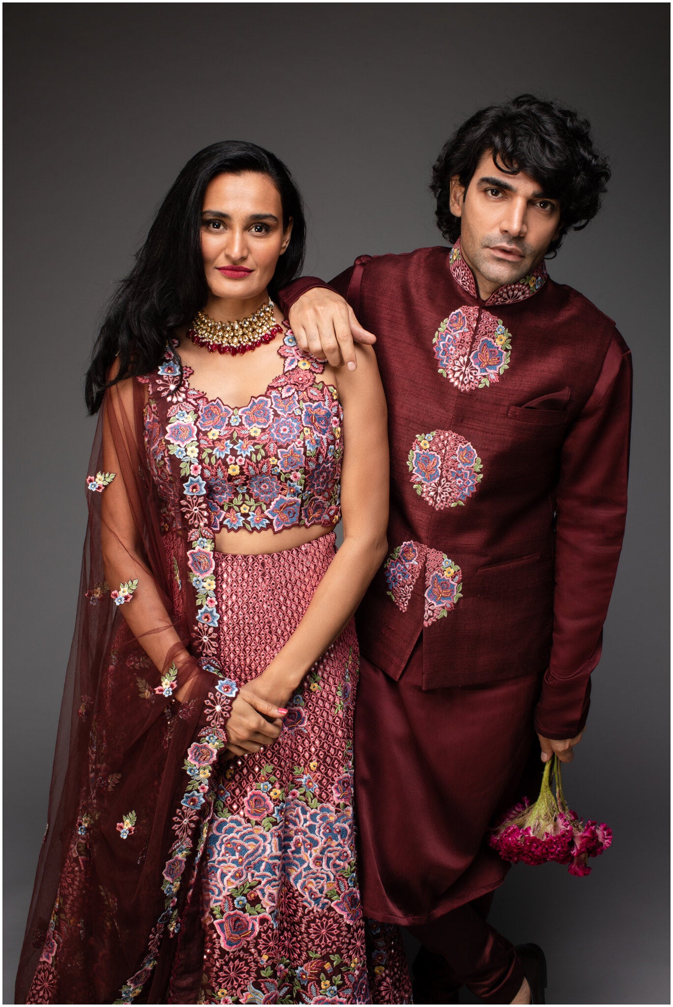 Deep Wine Embroidered Lehenga Choli With Dupatta And Nehru Jacket With Kurta And Pants - Couple set
