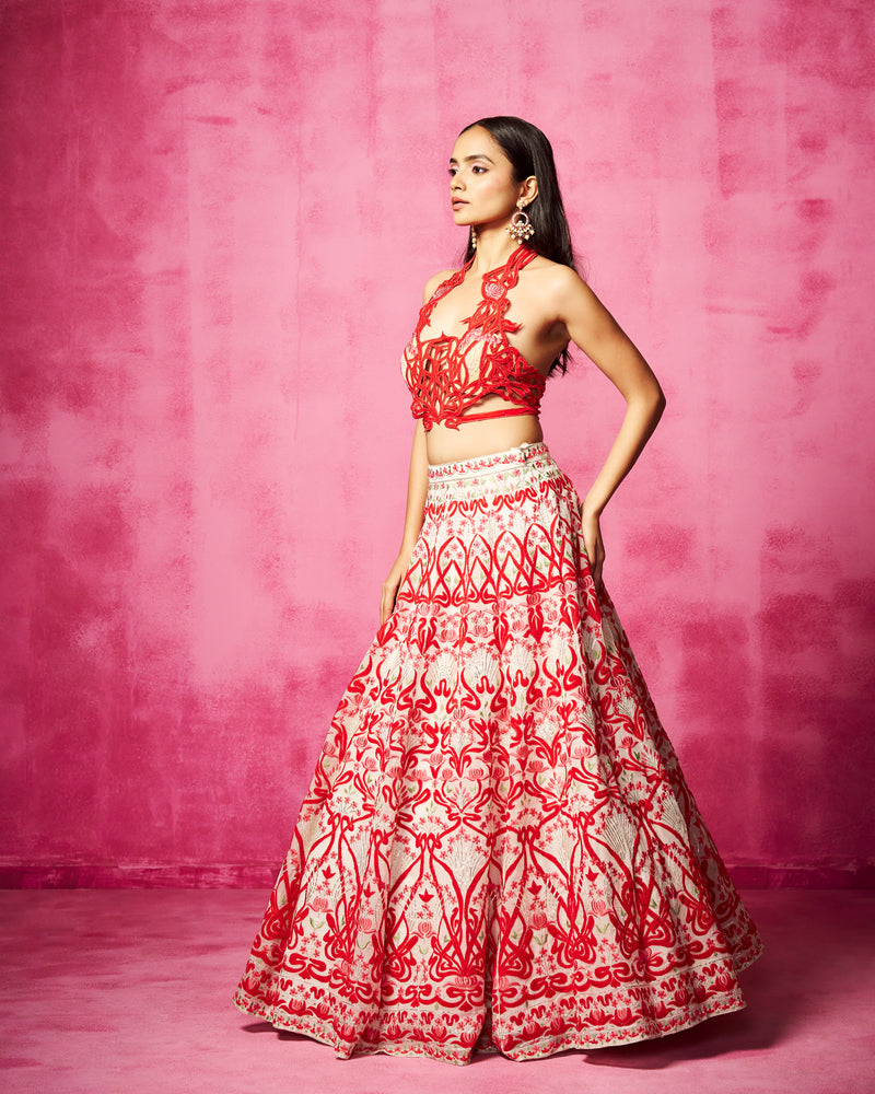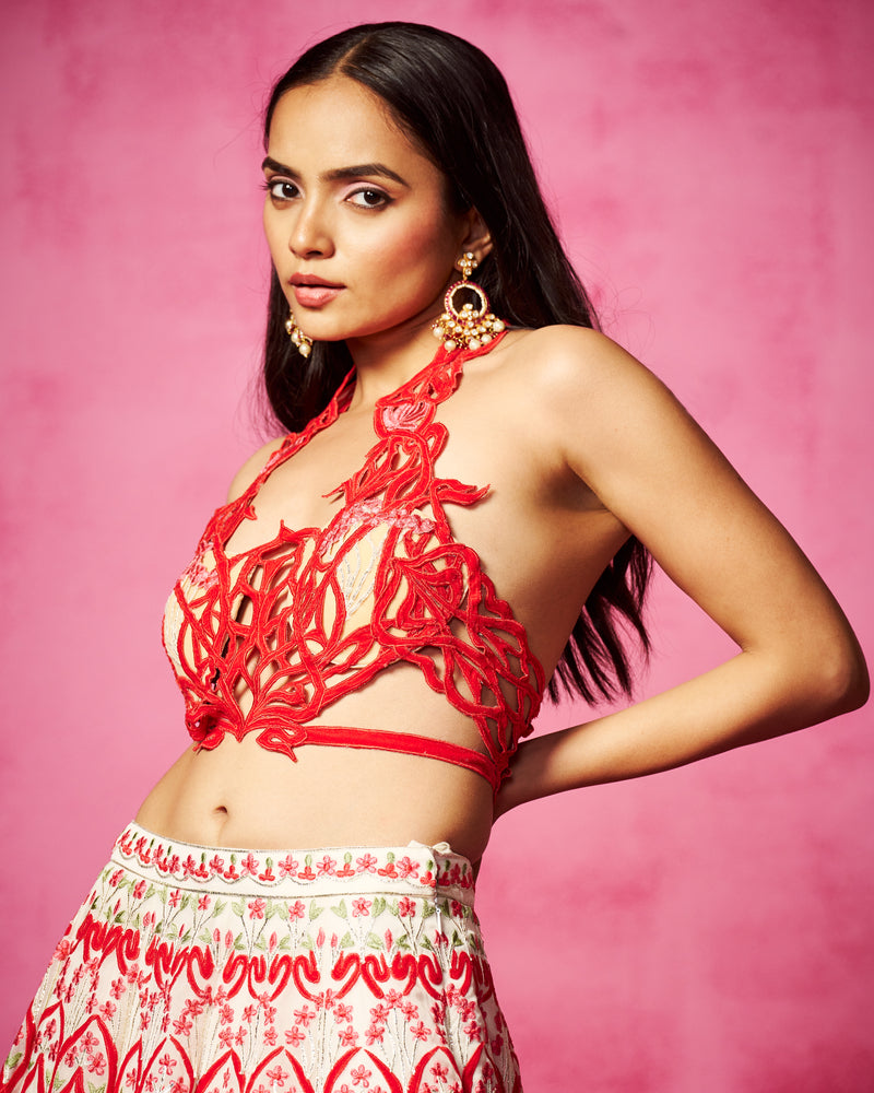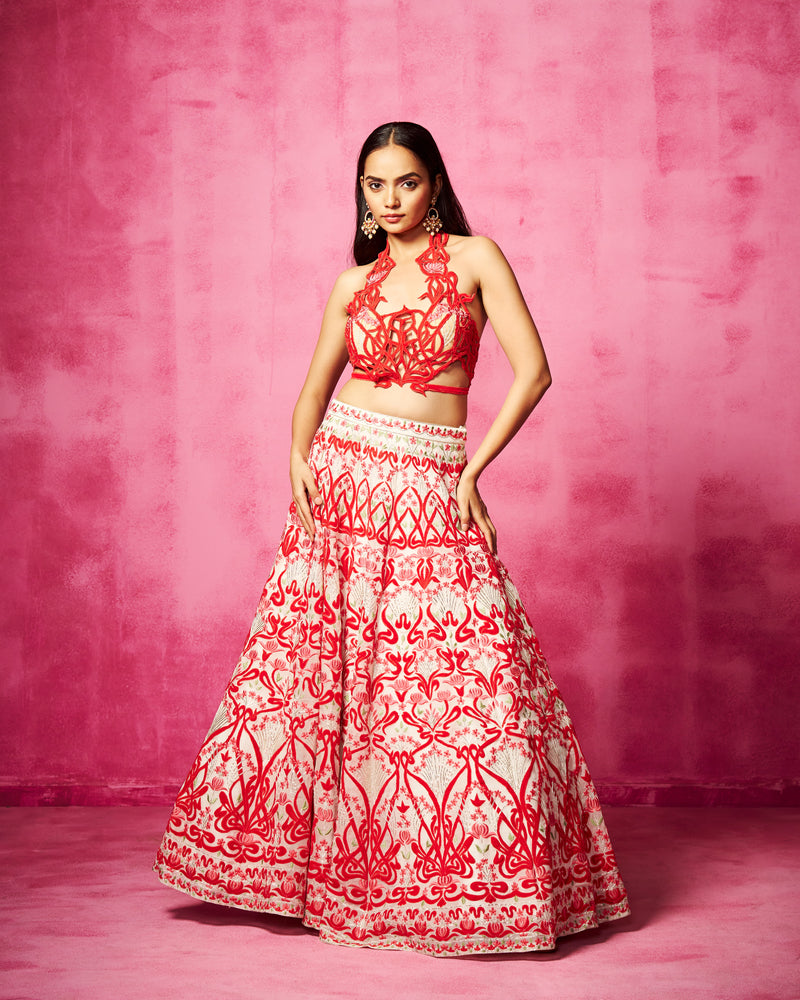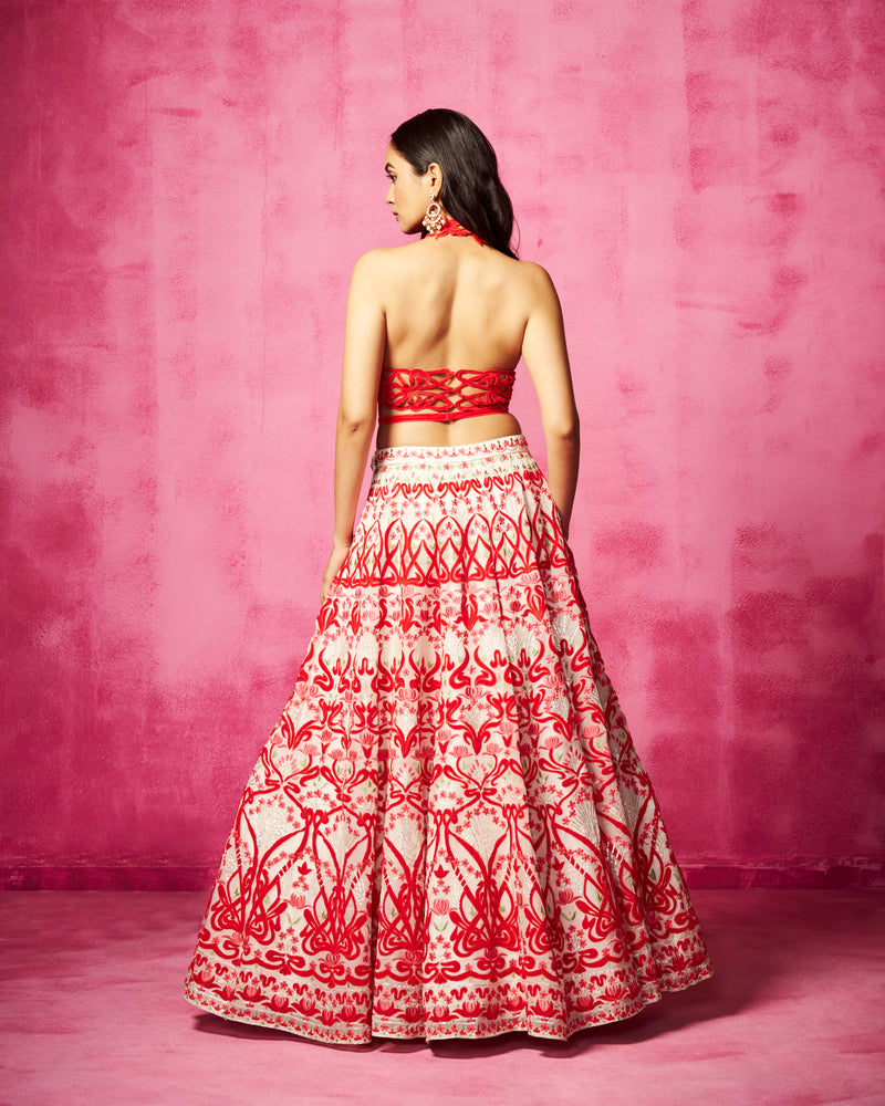 Embroidered Halter Crop Top and Ivory Lehenga Set