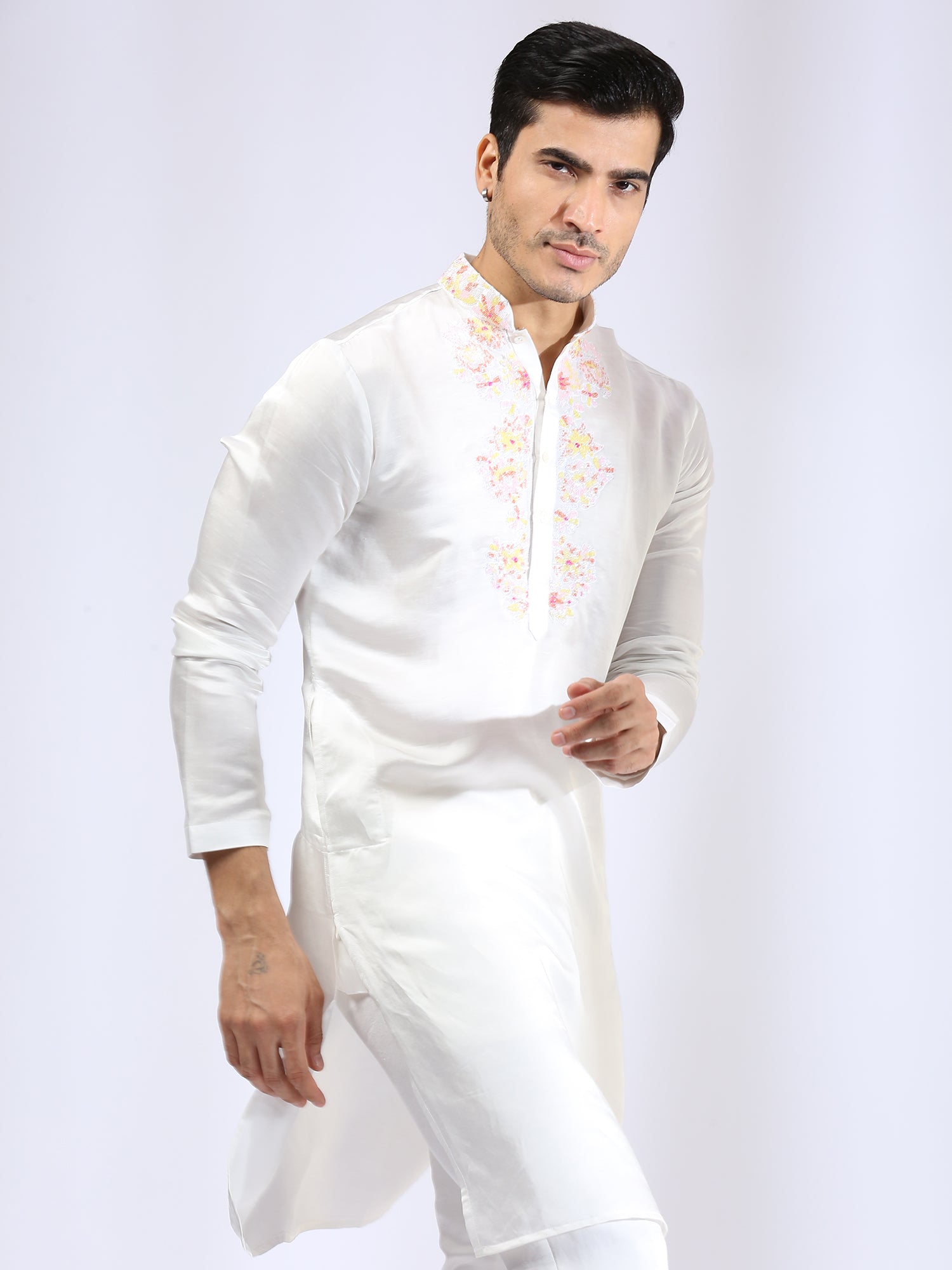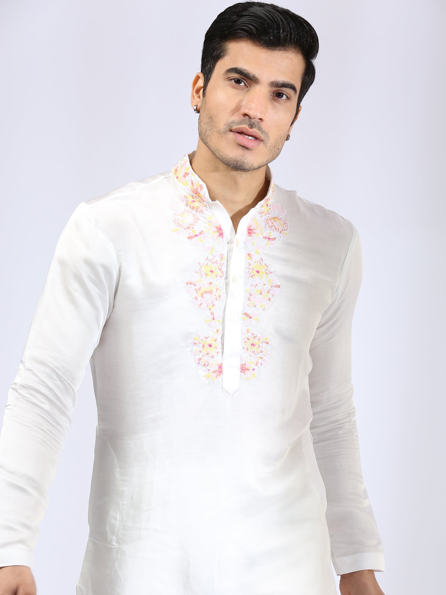 Ivory kurta embroidered with bugle beads on the collar and around the placket. It is teamed with matching narrow pants.