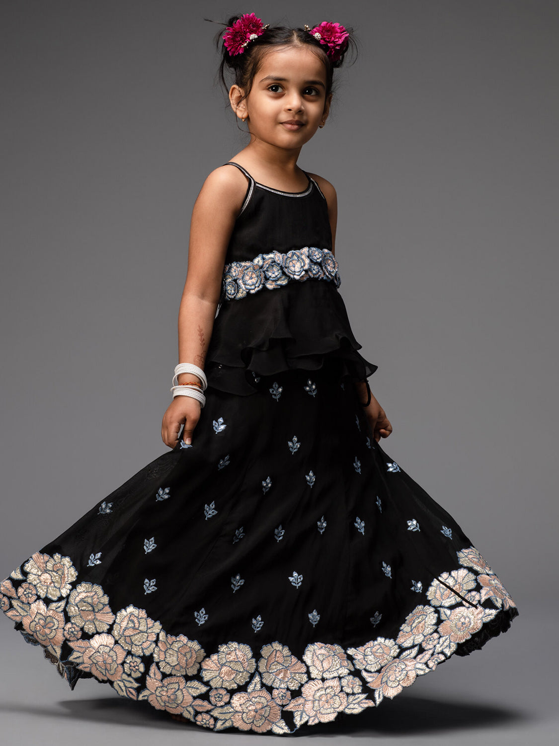 Midnight blue net gown with a pleated bodice attached to a full bias cut skirt. The gown is further enhanced with metallic embroidery along the waist. This navy blue layered party gown is an ideal choice for your daughter’s western collection. It comes with a satin bow detailing at the front that boosts its look.