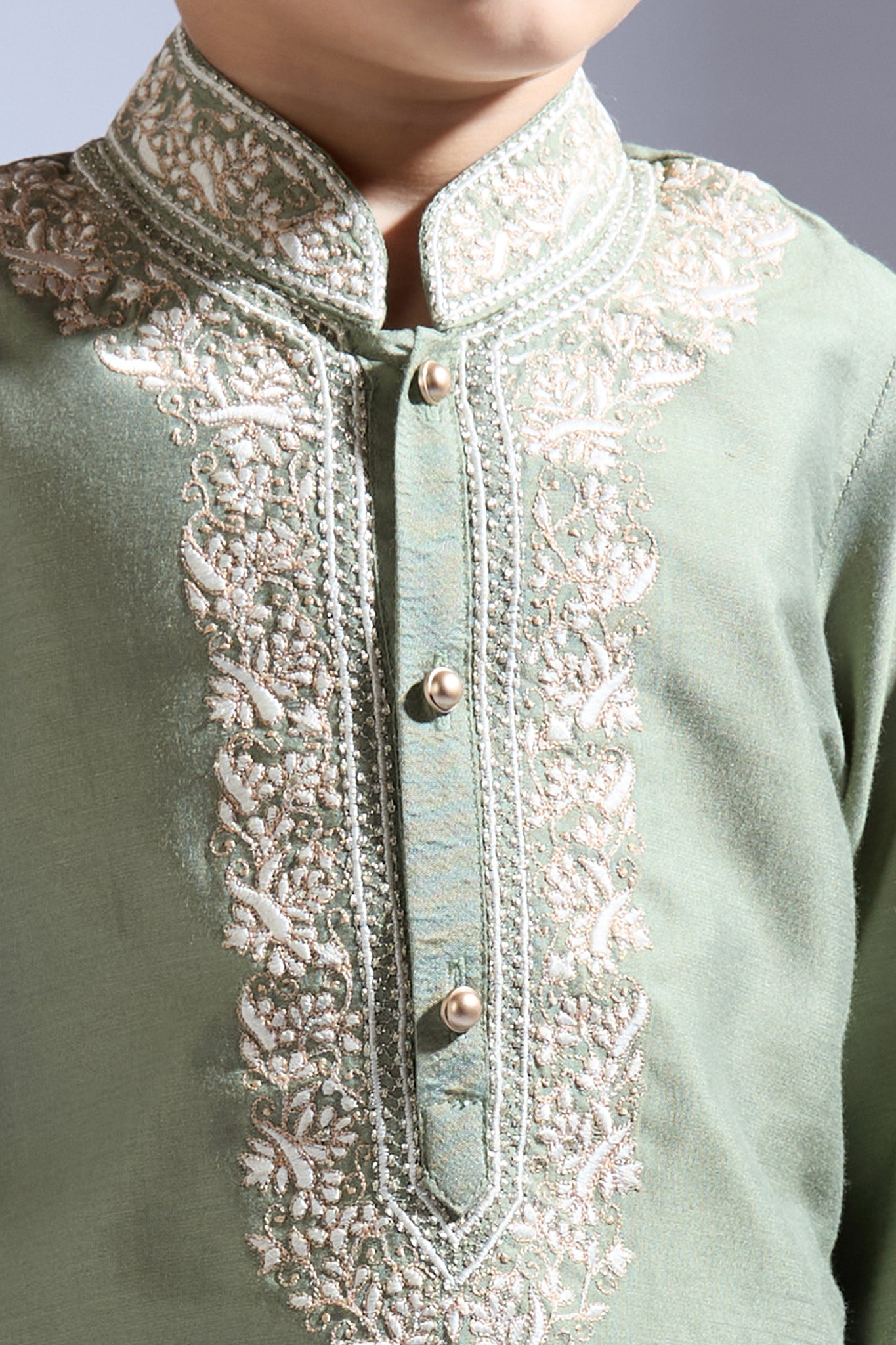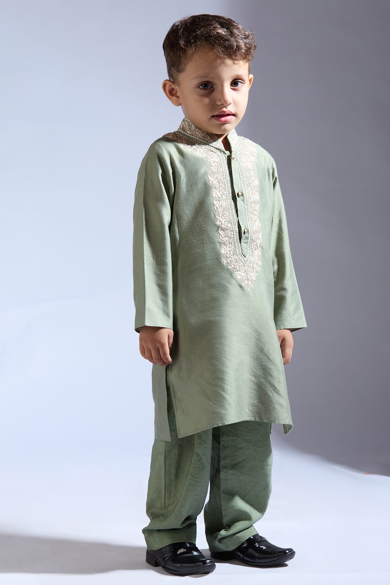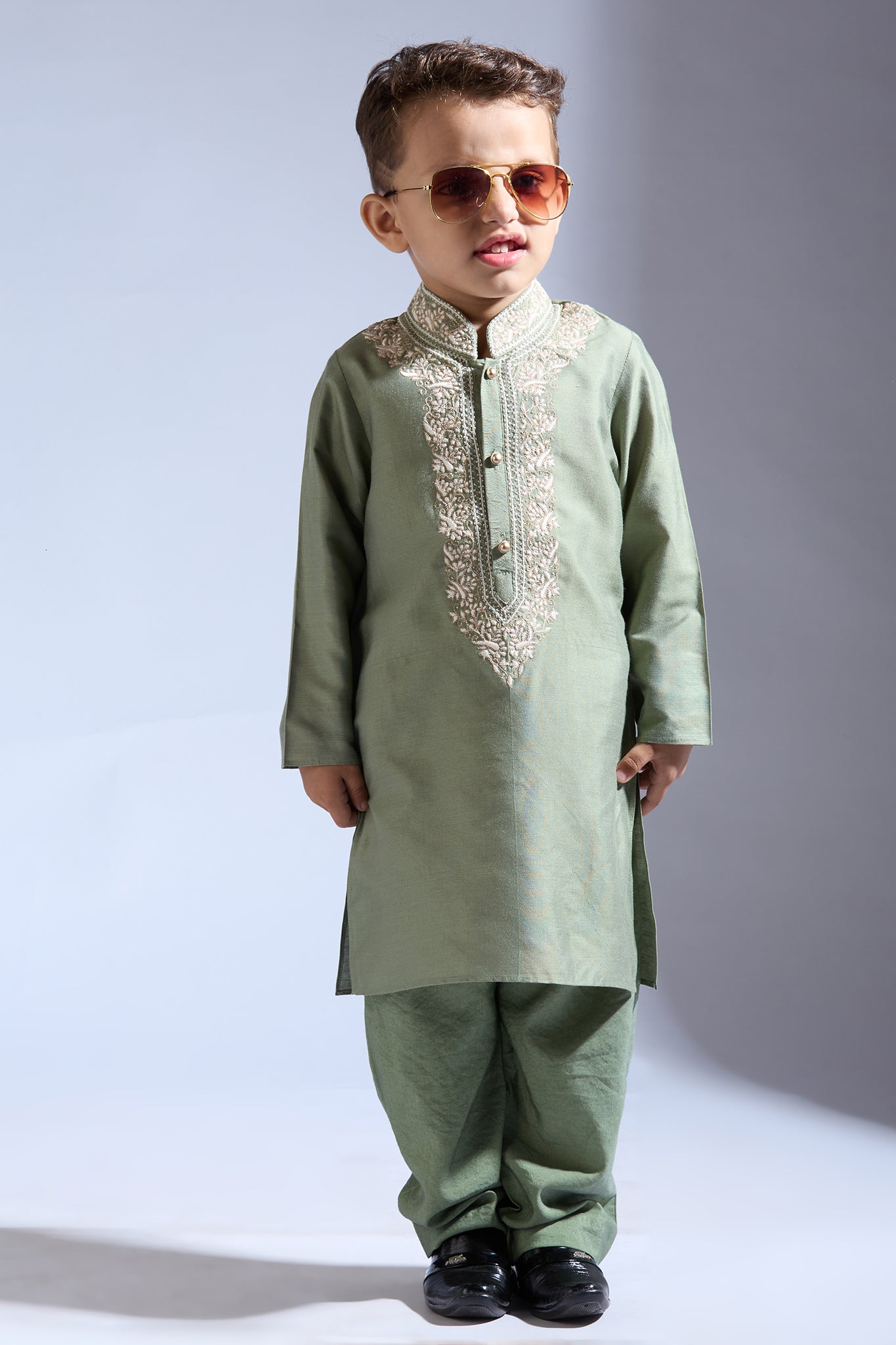 Forest green kurta for boys with embroidery details collar and around the placket. It is teamed with matching pants.