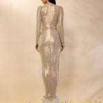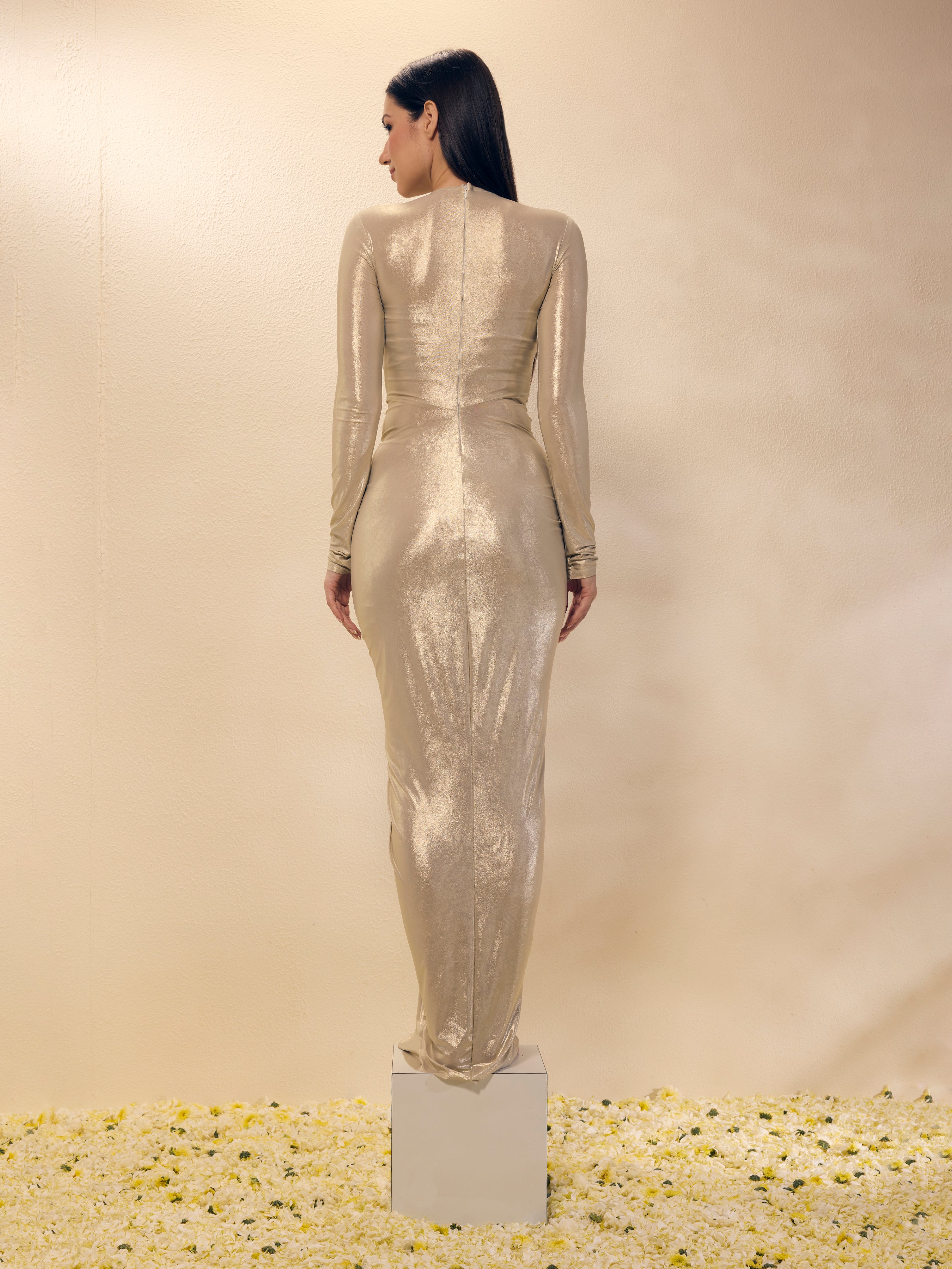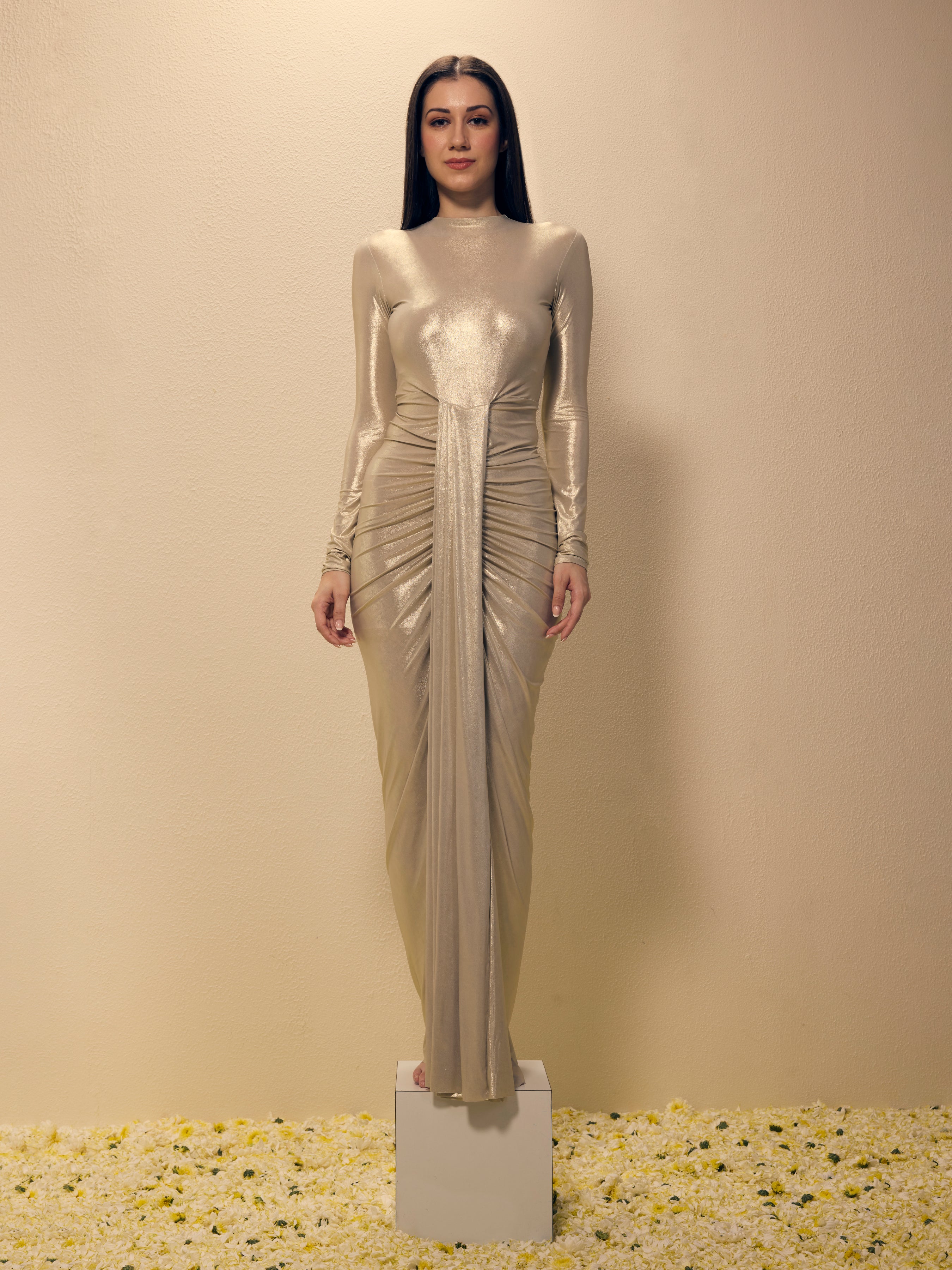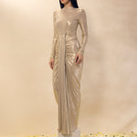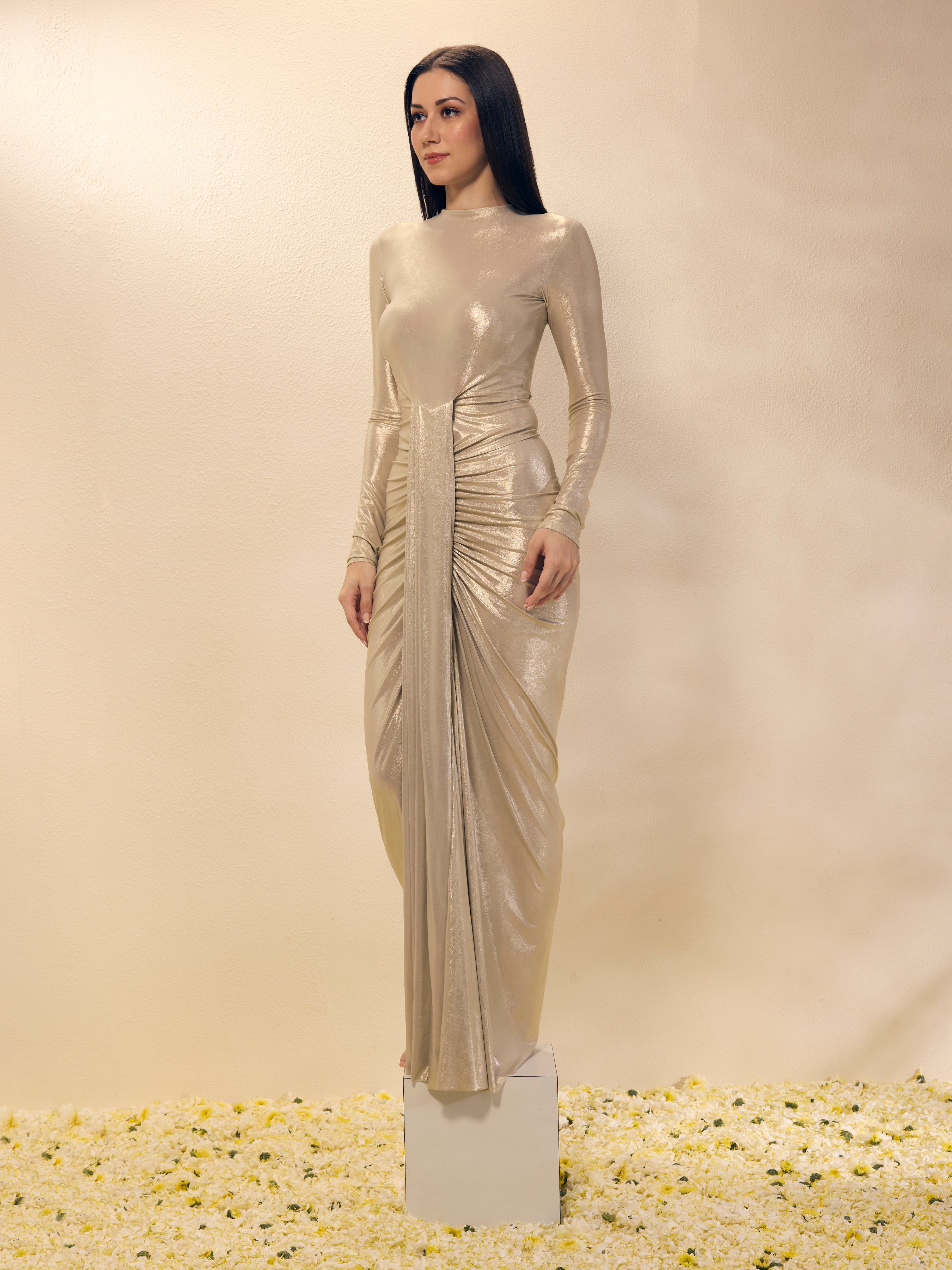 Step into sophistication with this stunning gold lycra draped gown, designed to highlight your silhouette with a sleek and flowing drape. Crafted from luxurious lycra fabric, this gown offers both comfort and elegance, making it perfect for formal events, parties, and special occasions. Its radiant gold color adds a glamorous touch to every appearance.