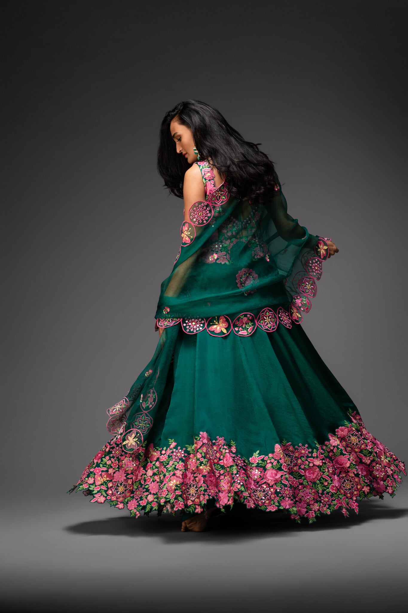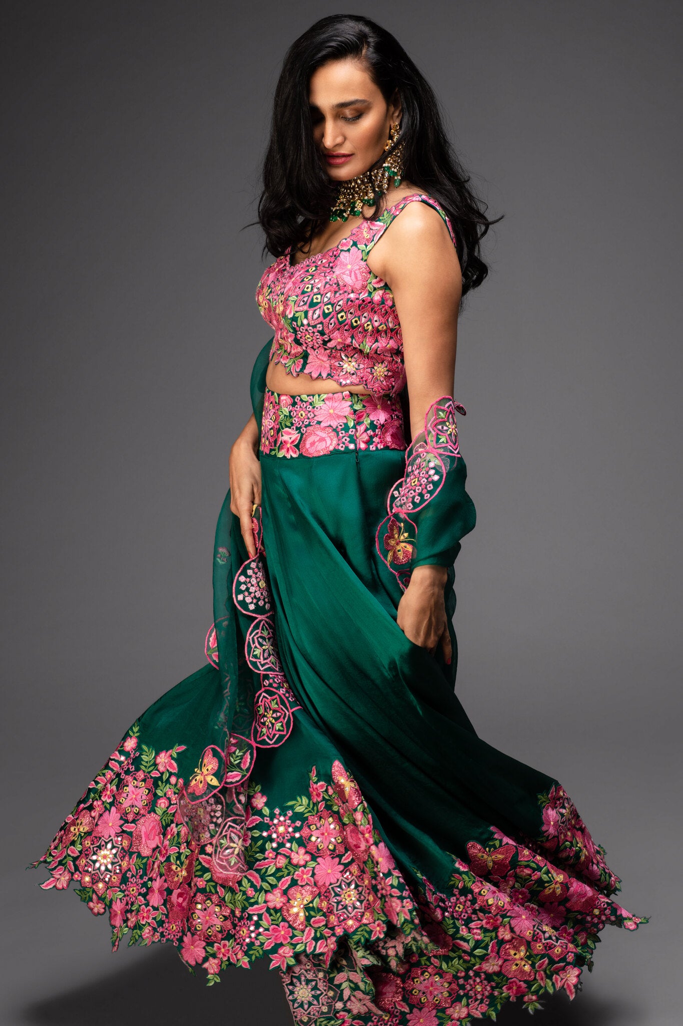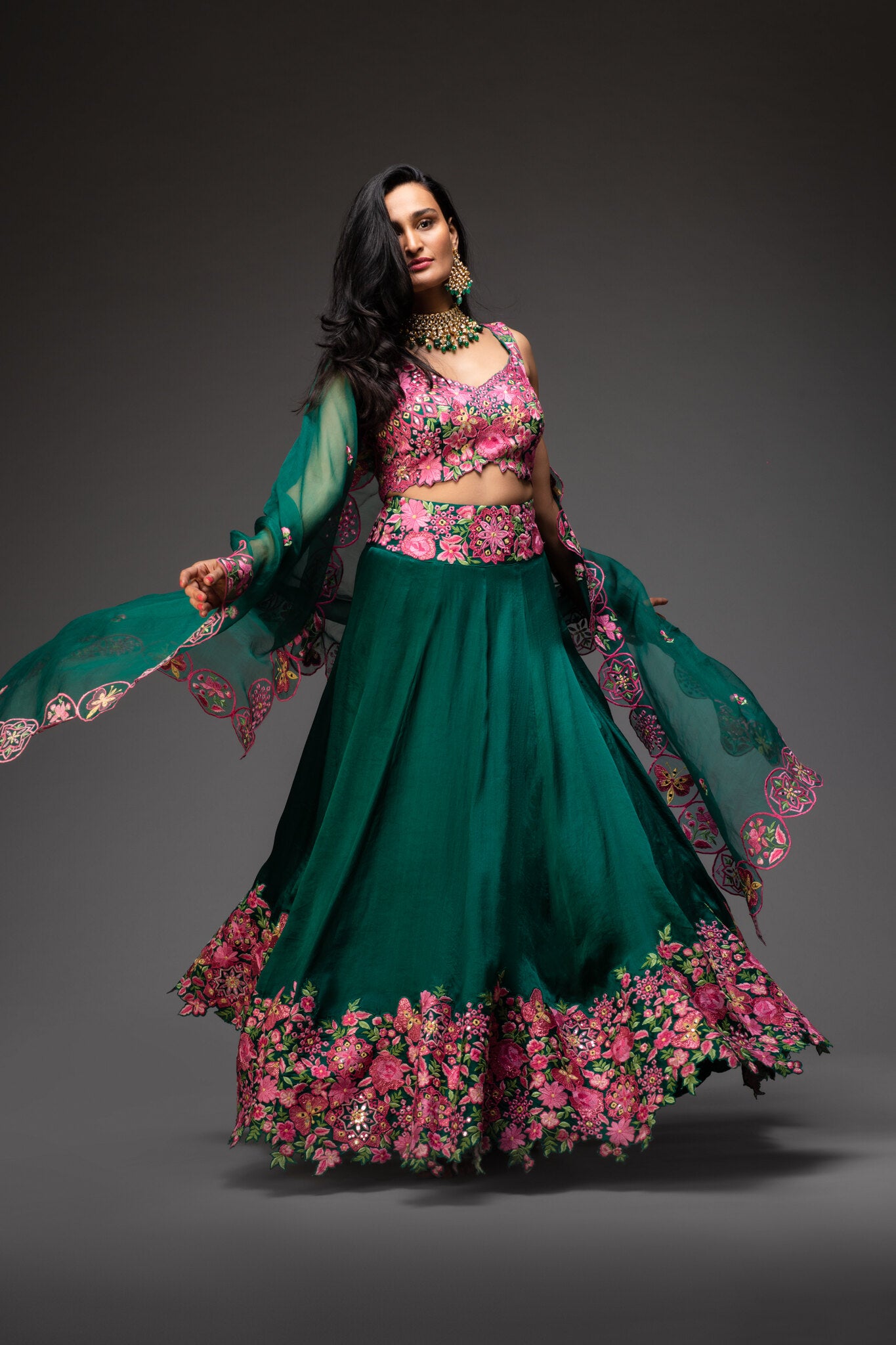 The Bridal Lehenga Set for women features an emerald green lehenga adorned with gota thread-mirror floral pink embroidery and a cutwork hem. The ensemble is completed with an organza cutwork blouse and a net dupatta with scalloped edges.