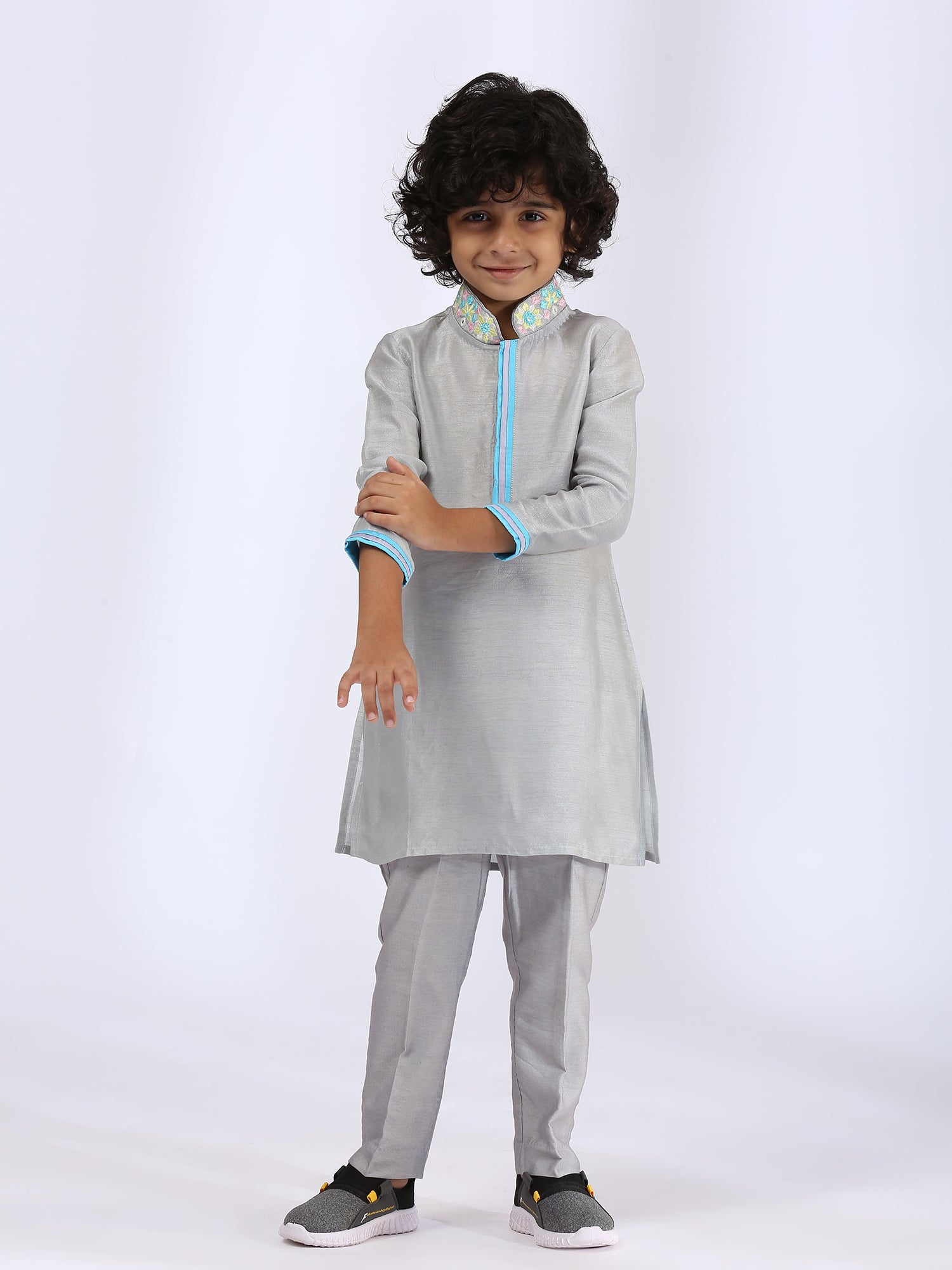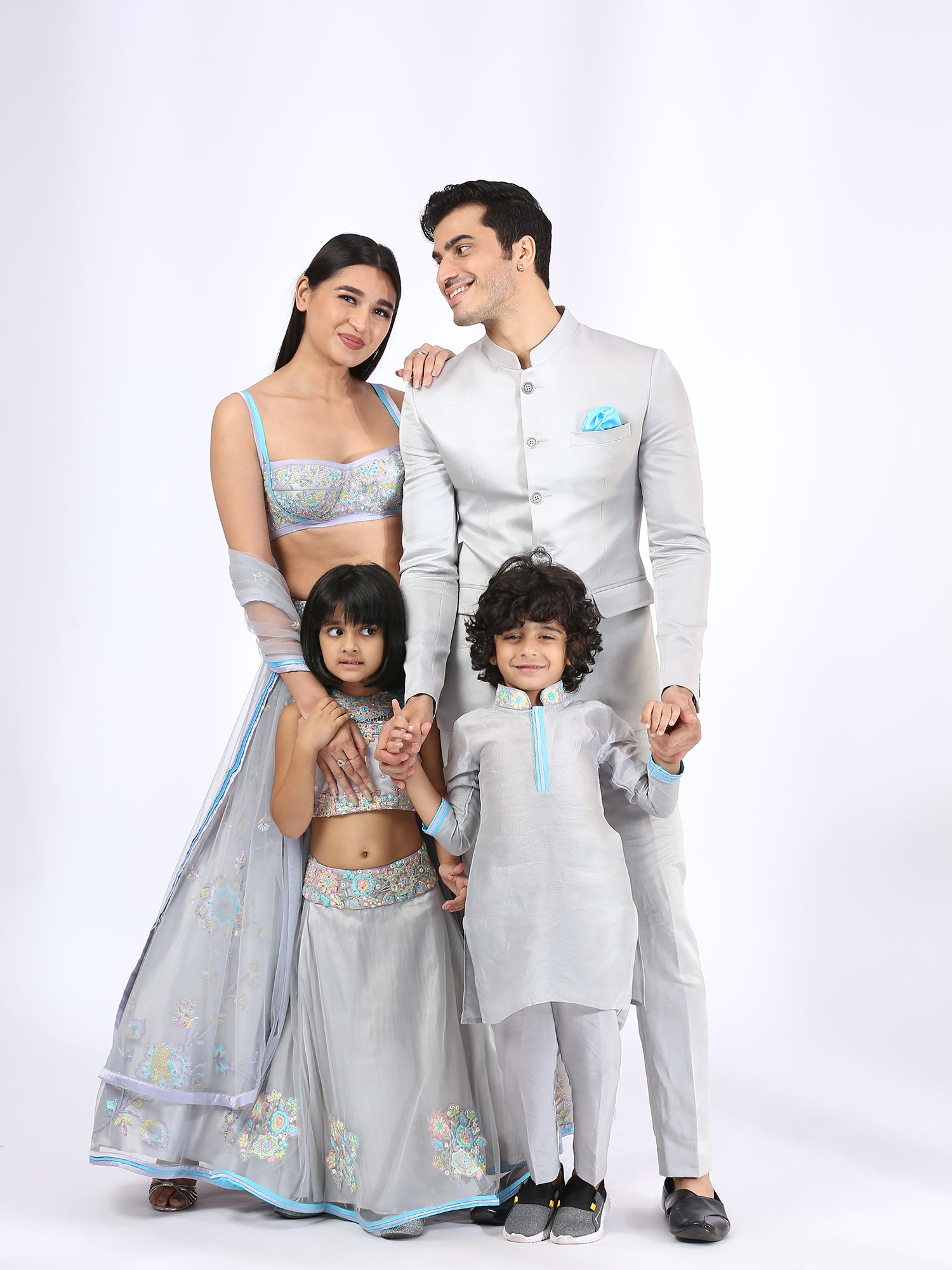 Grey Bandhgala teamed with narrow pants accentuated with a contrast pocketkercheif for father teamed up with Grey Kurta with embroidered collar teamed with narrow pants for son.