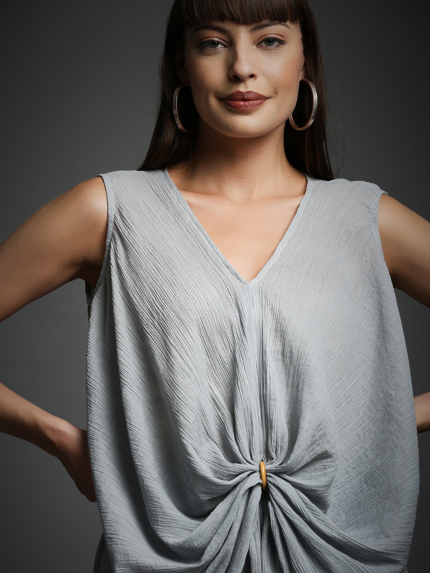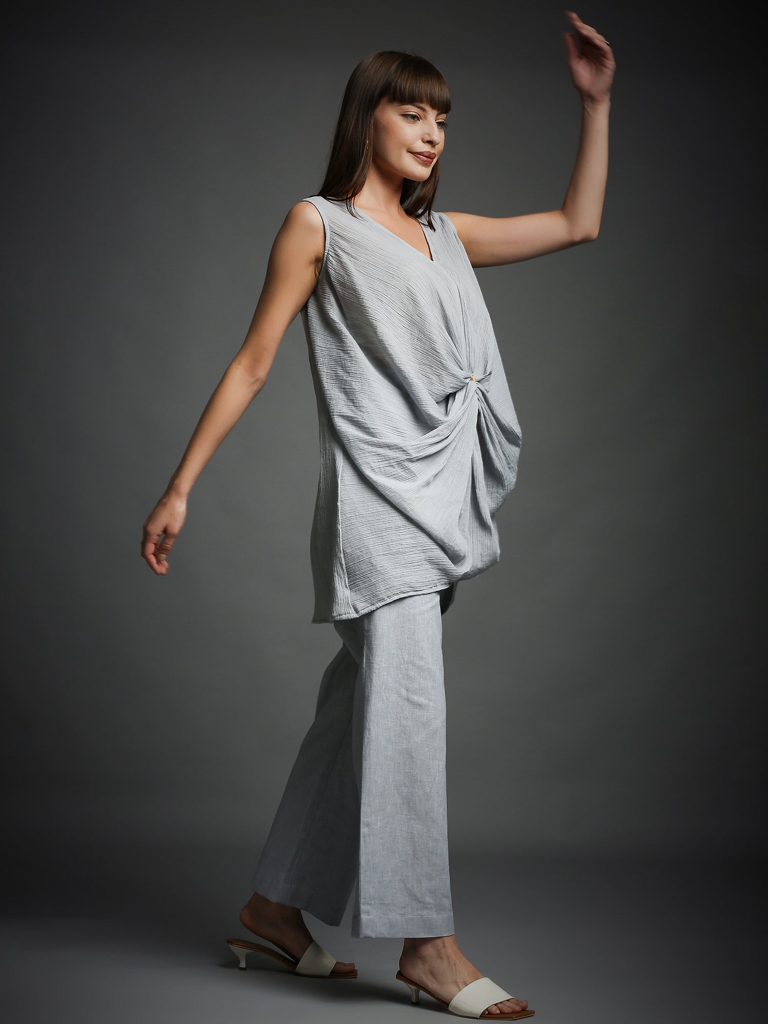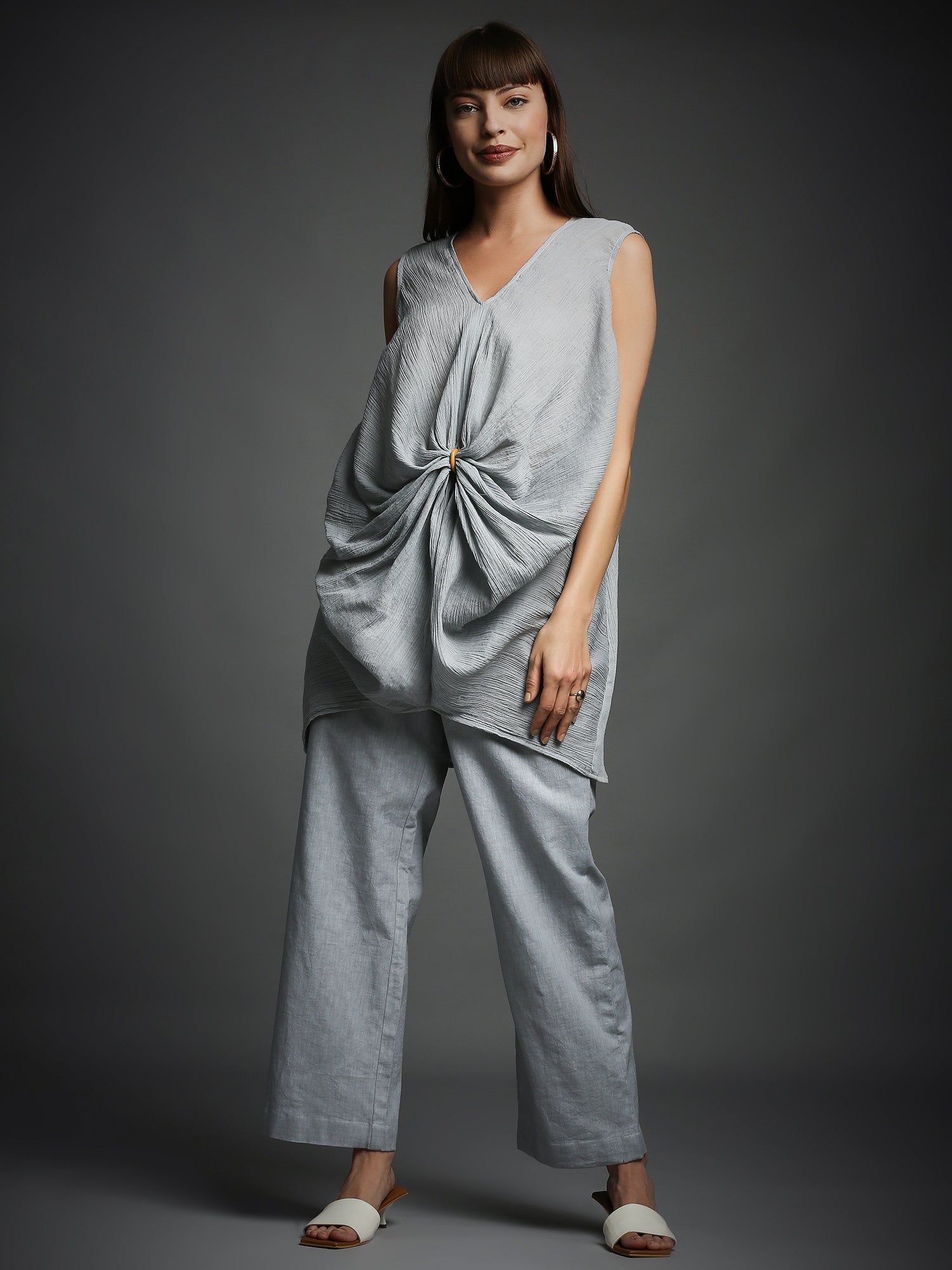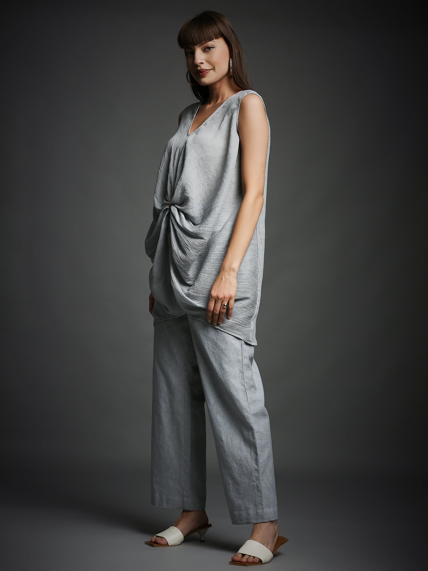 This steel grey tunic features elegant draped detailing and a high-low hem, perfectly paired with a matching pant for a chic and sophisticated look.