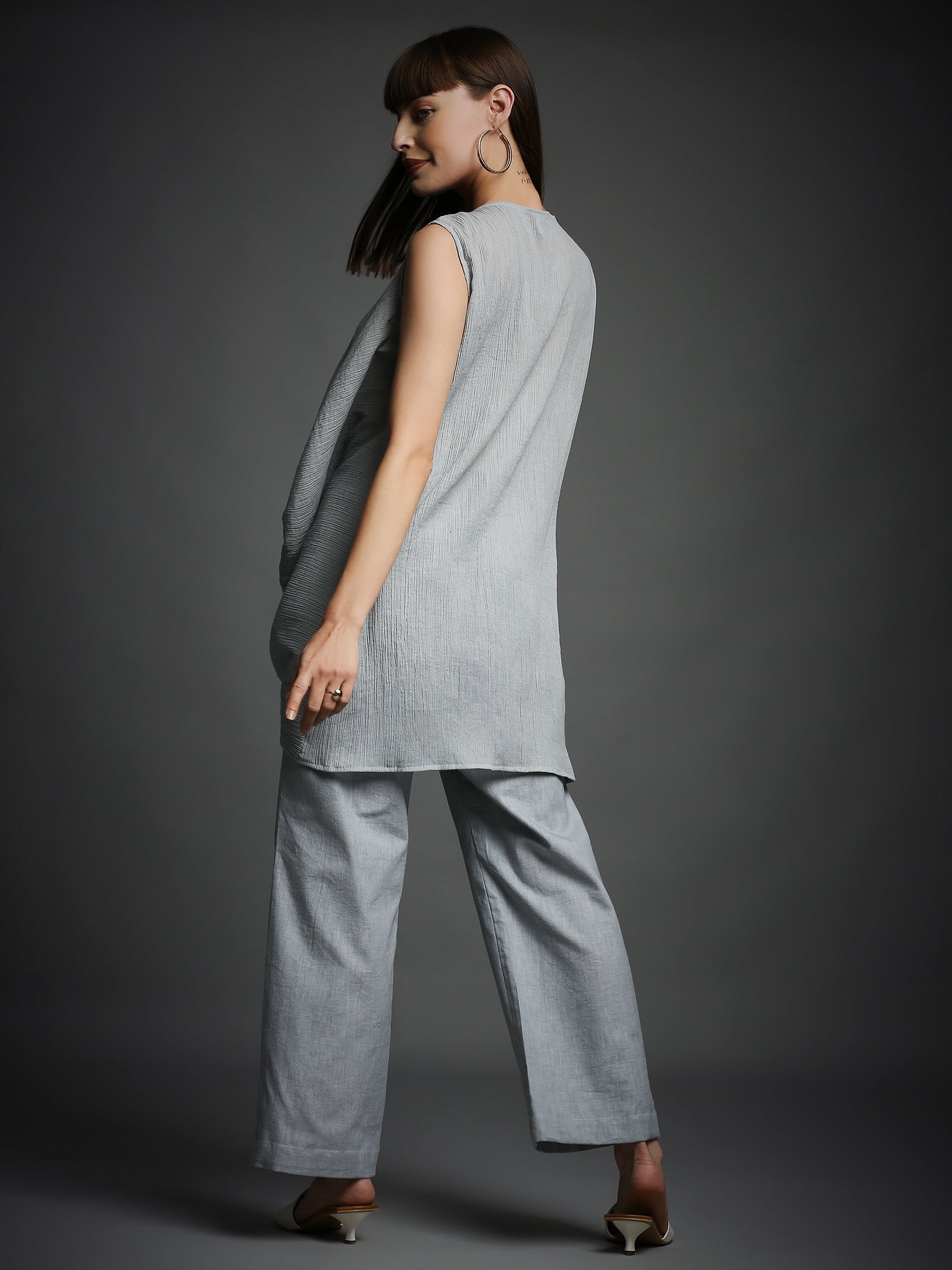 Grey Crinkled Cotton Draped Tunic and Pant Set