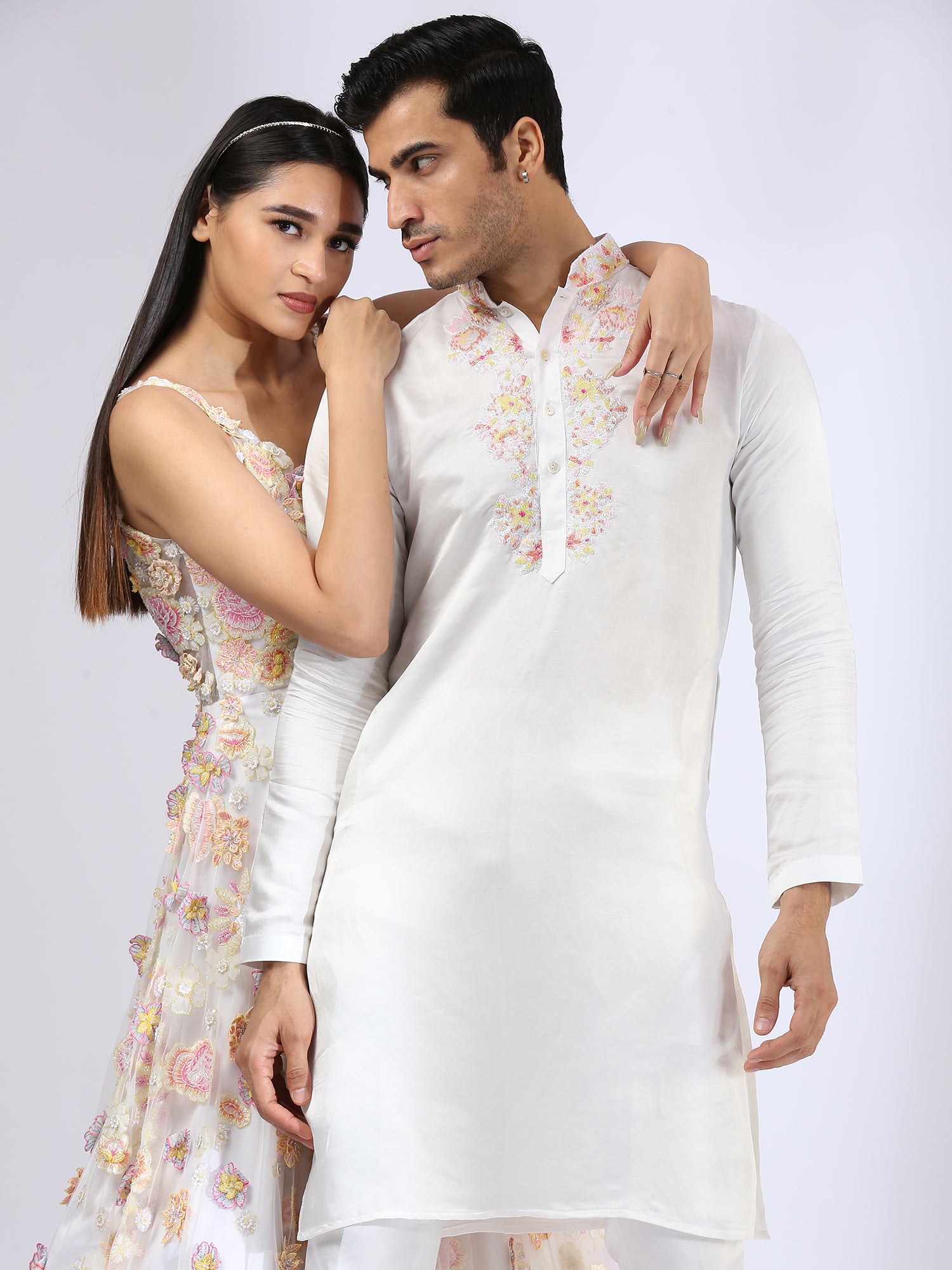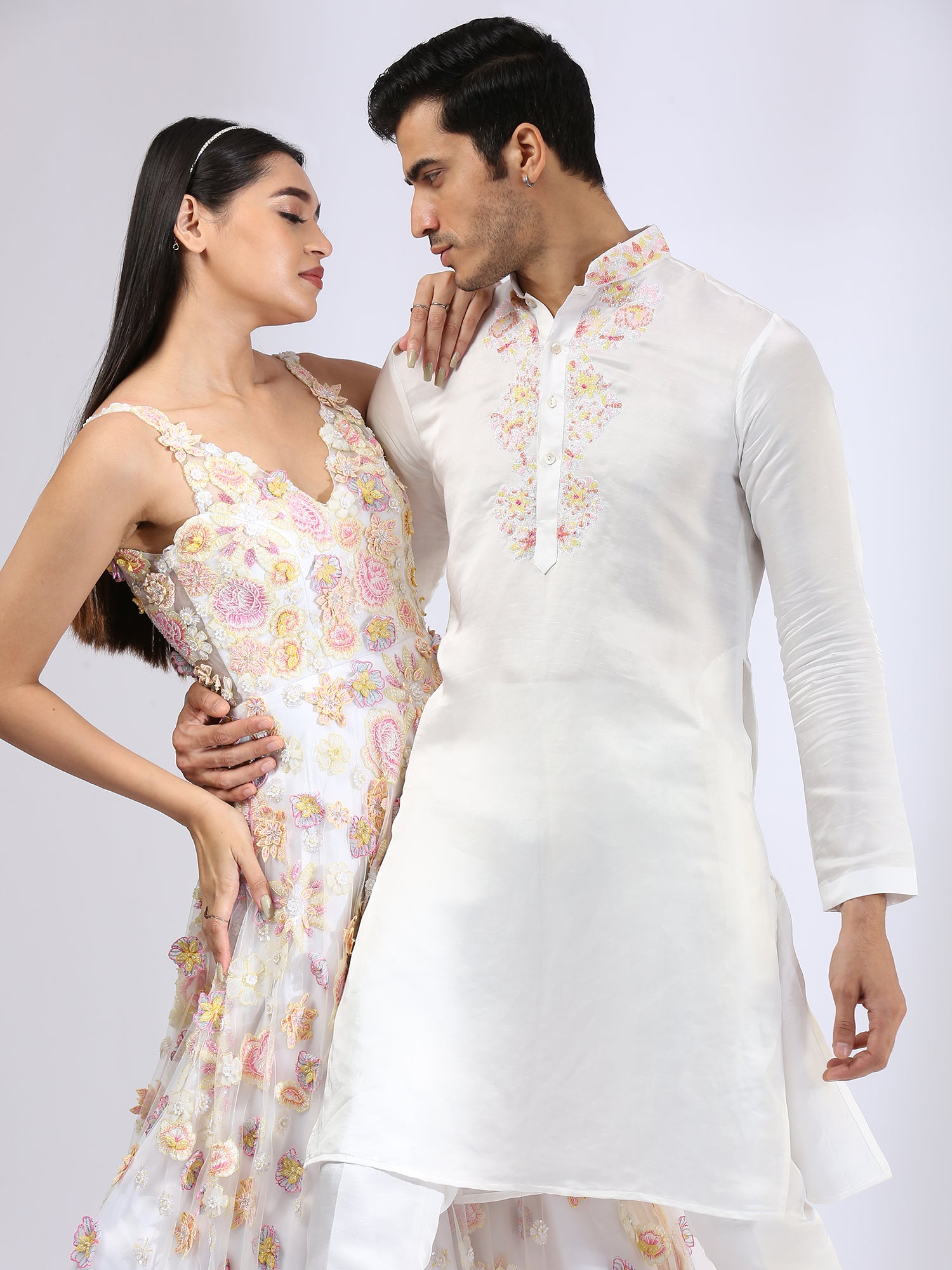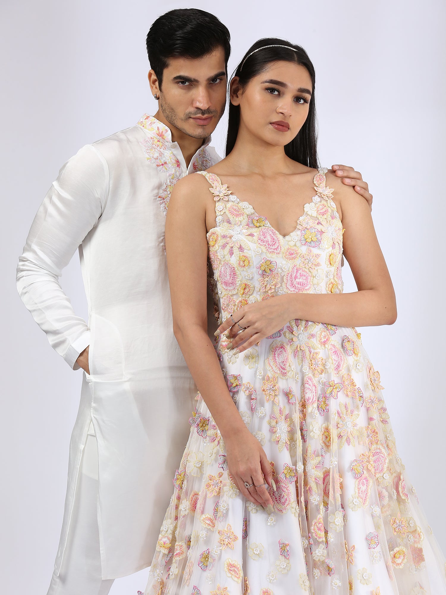 Ivory 3-D embroidered gown & Embroidered Ivory Kurta teamed with matching narrow pants