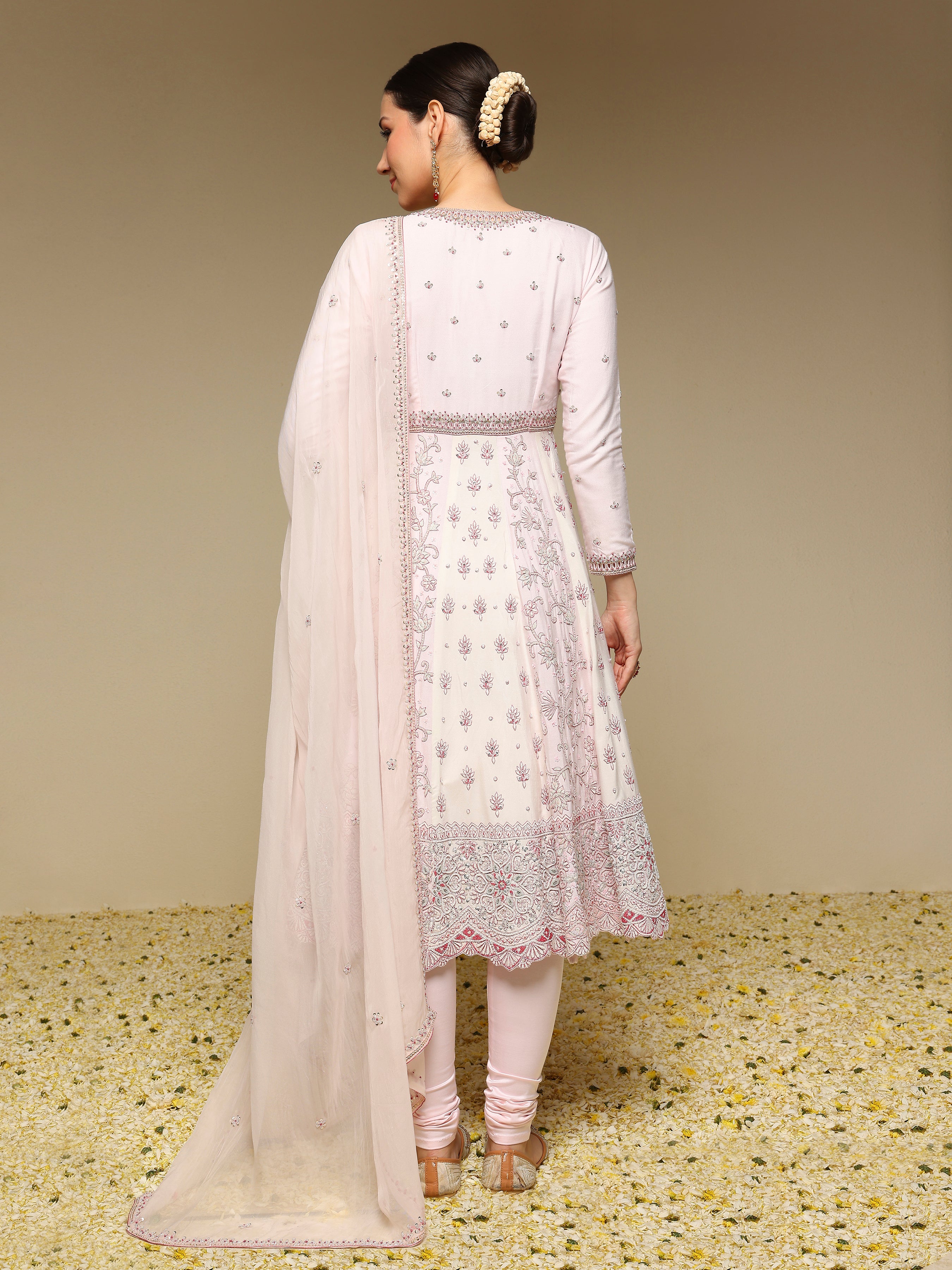 Ivory & Baby Pink Embroidered Kalidar Kurta with Organza Dupatta & Chudidar
