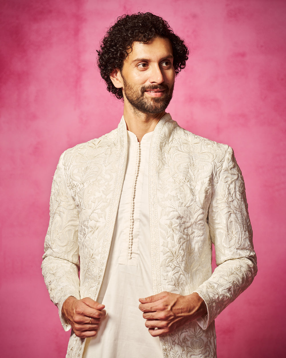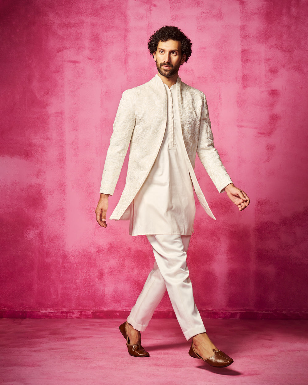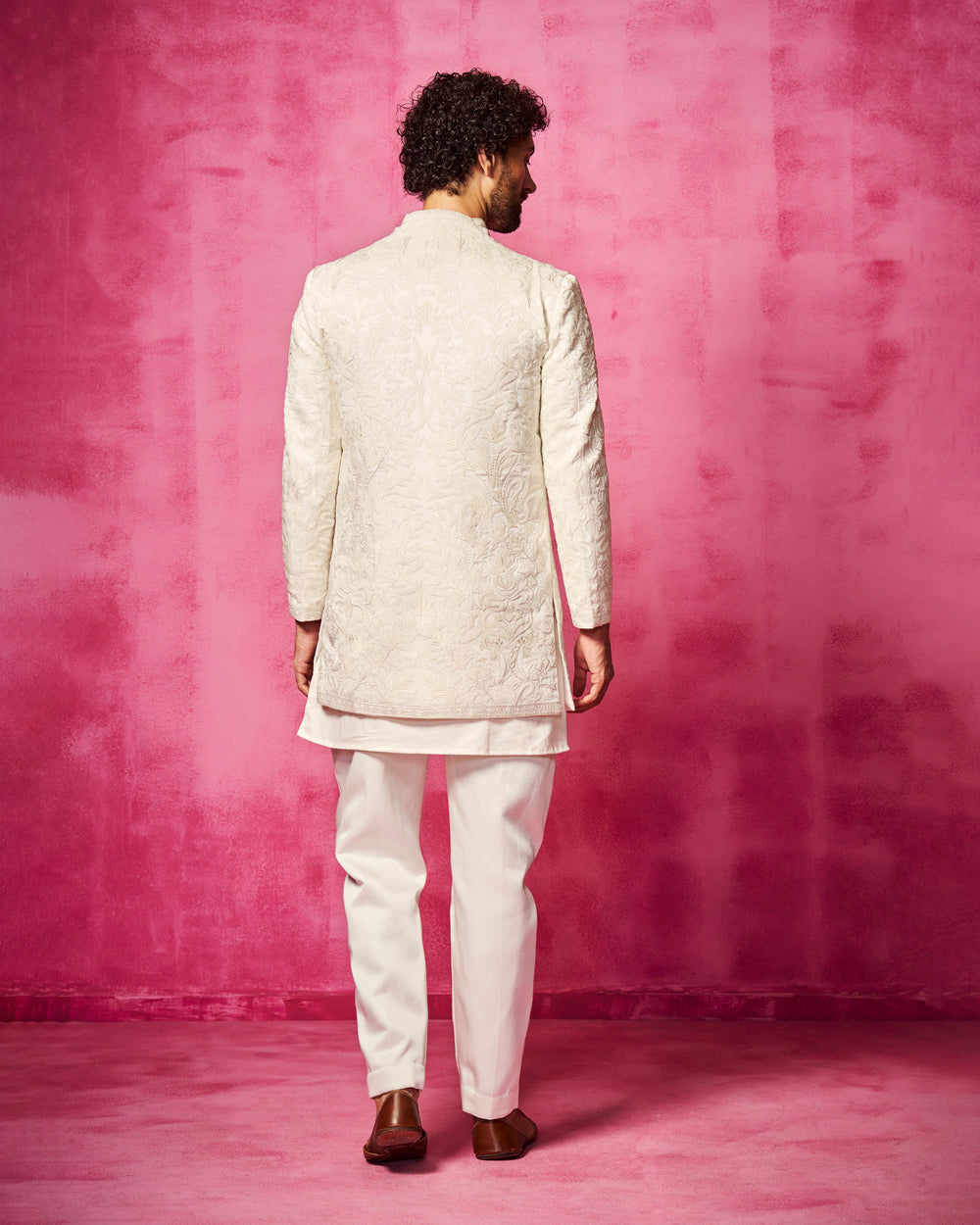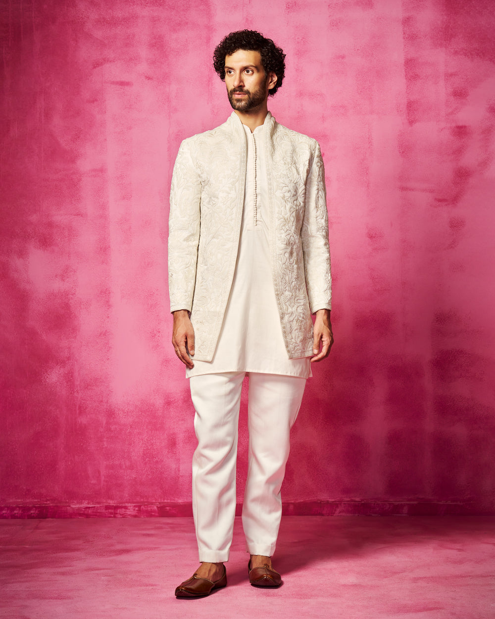 Tailored ivory Embroidered Jacket with velvet patchwork and threadwork embroidery. It is teamed with a matching kurta and pant set.