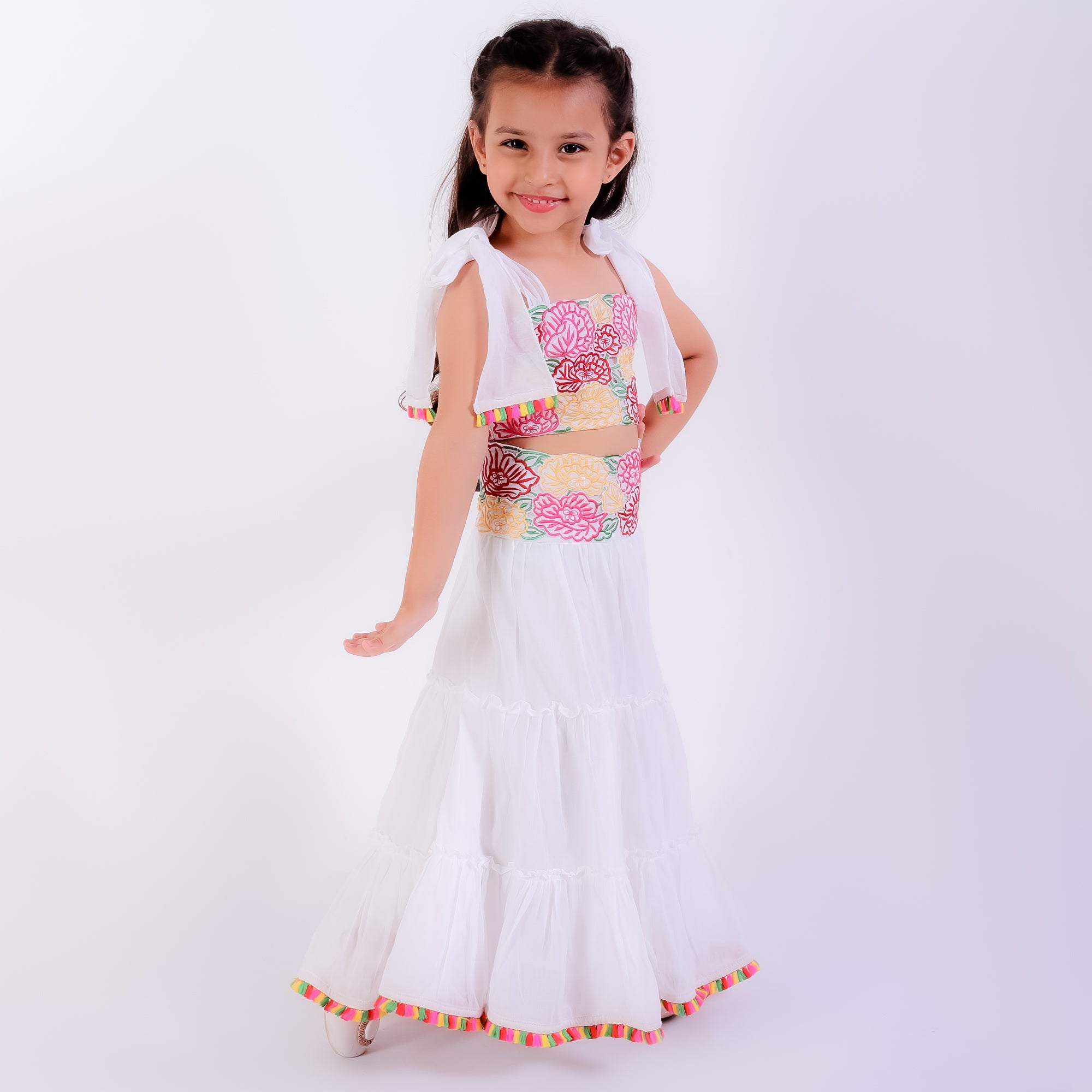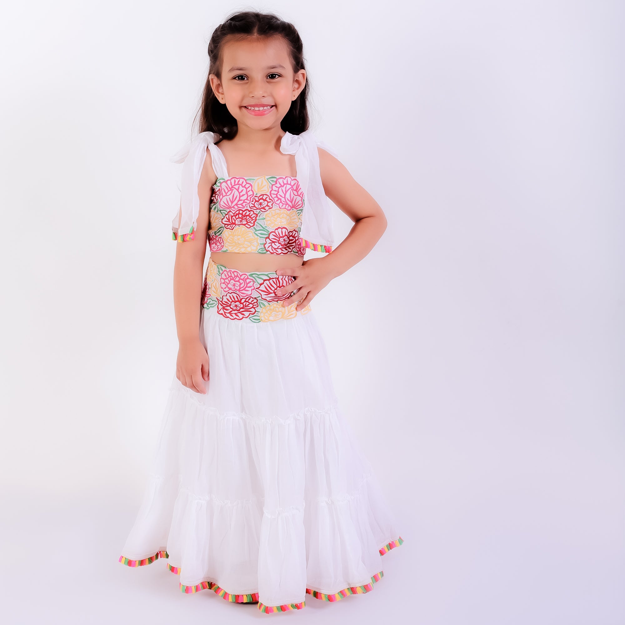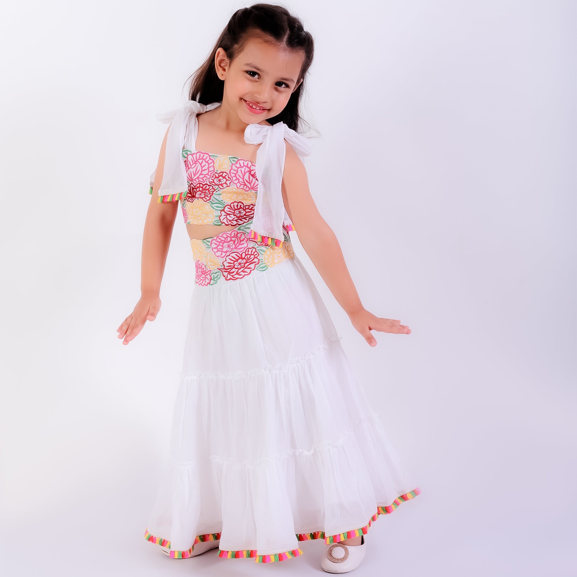 Ivory tiered lehenga with bloom embroidered waistband & tassel on the hem. Paired with a tie-up sleeves blouse with bloom embroidery.