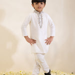Dress your little one in classic elegance with this boys’ ivory spun silk kurta set, featuring intricate embroidery on the collar and around the placket for a refined look. The kurta is paired with matching narrow pants crafted from soft spun silk, ensuring a comfortable fit for special occasions. Ideal for weddings, festivals, and family gatherings, this ensemble combines traditional charm with modern style and comfort.