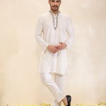 Experience timeless elegance with this men’s ivory spun silk kurta set, featuring intricate hand embroidery on the collar and around the placket for a refined and sophisticated look. The kurta is paired with matching narrow pants made from the same luxurious spun silk fabric, ensuring both comfort and style. Perfect for weddings, festive events, and formal occasions, this ensemble blends traditional craftsmanship with modern tailoring for a polished ethnic outfit.