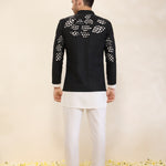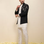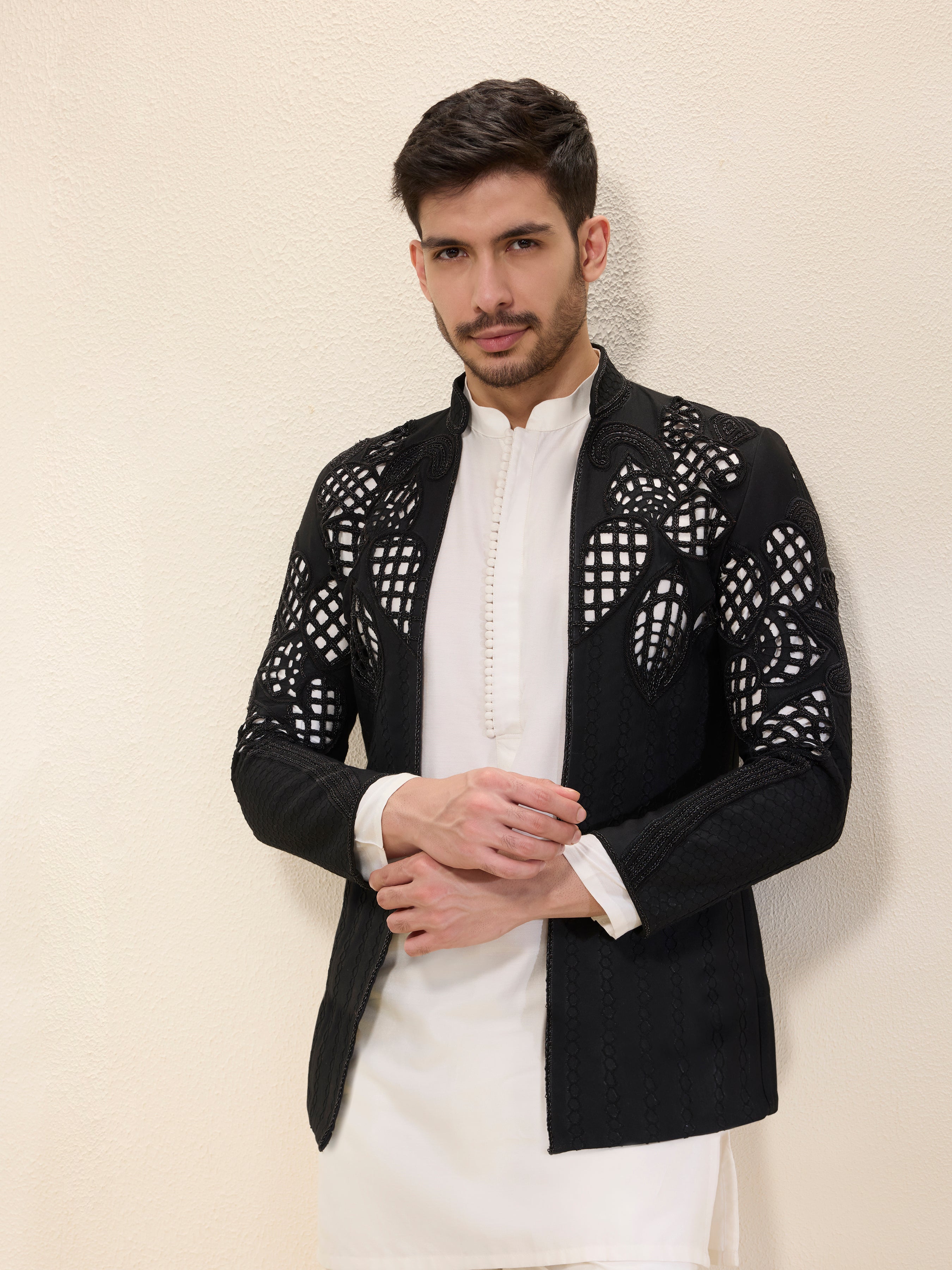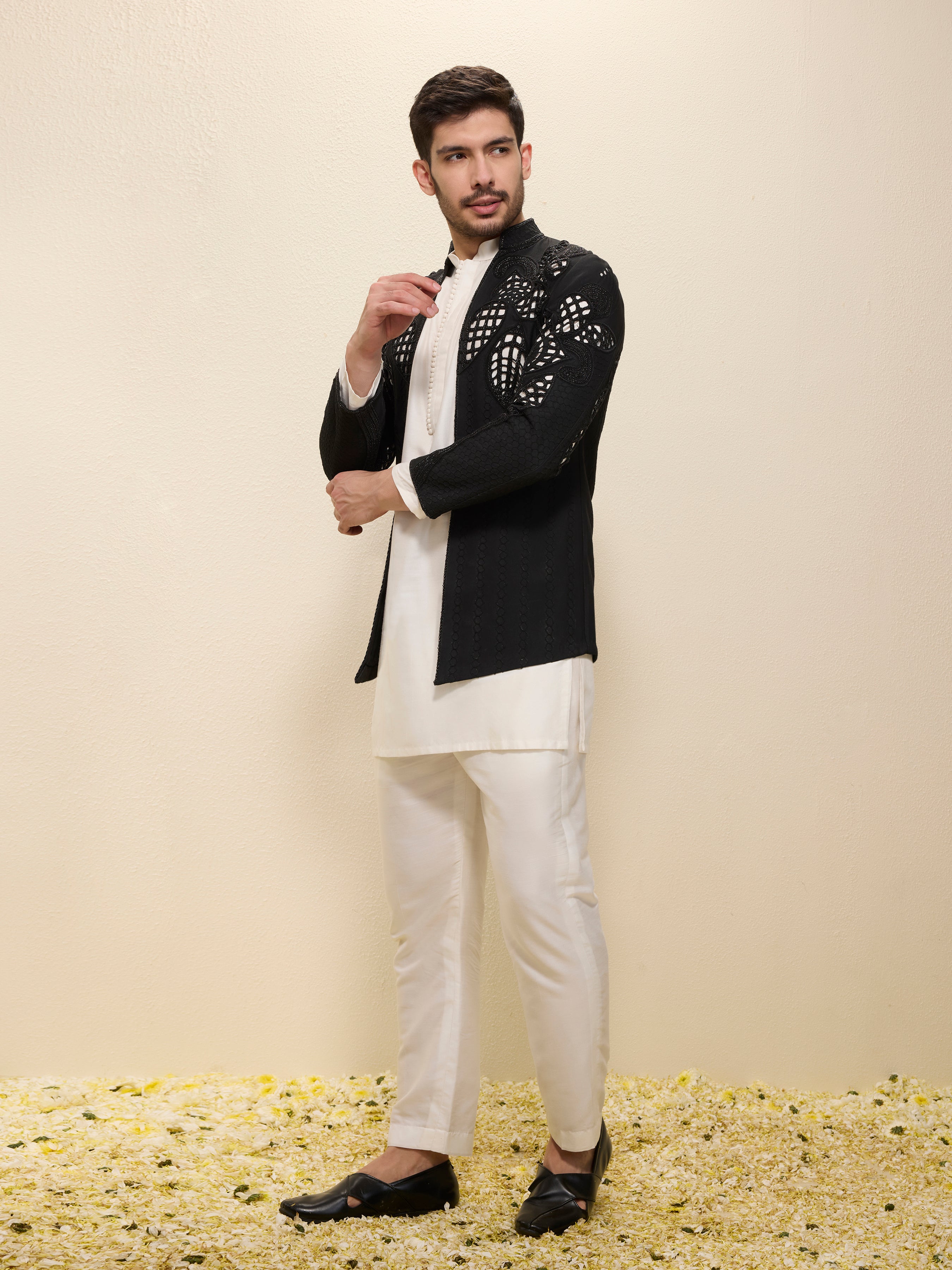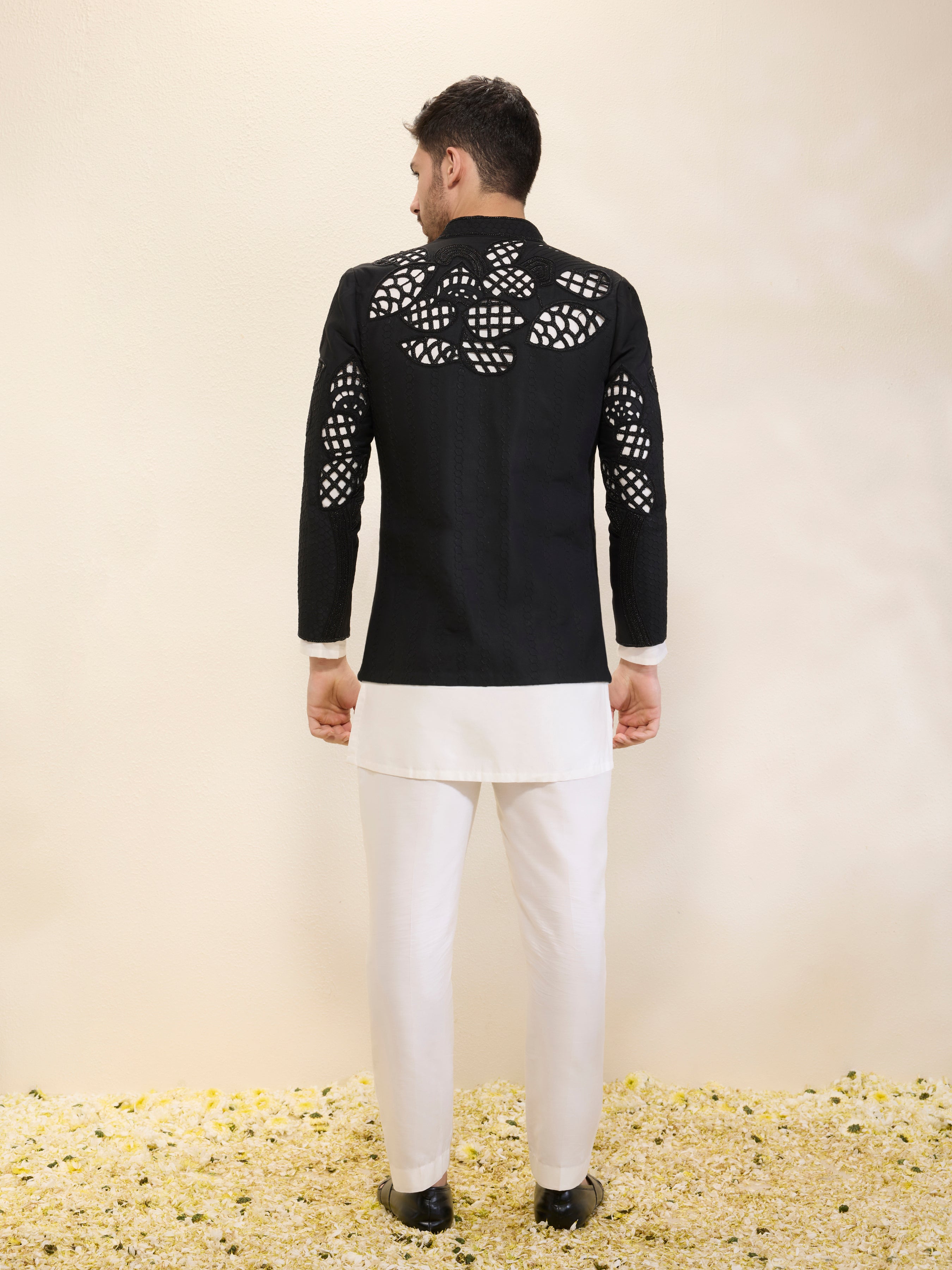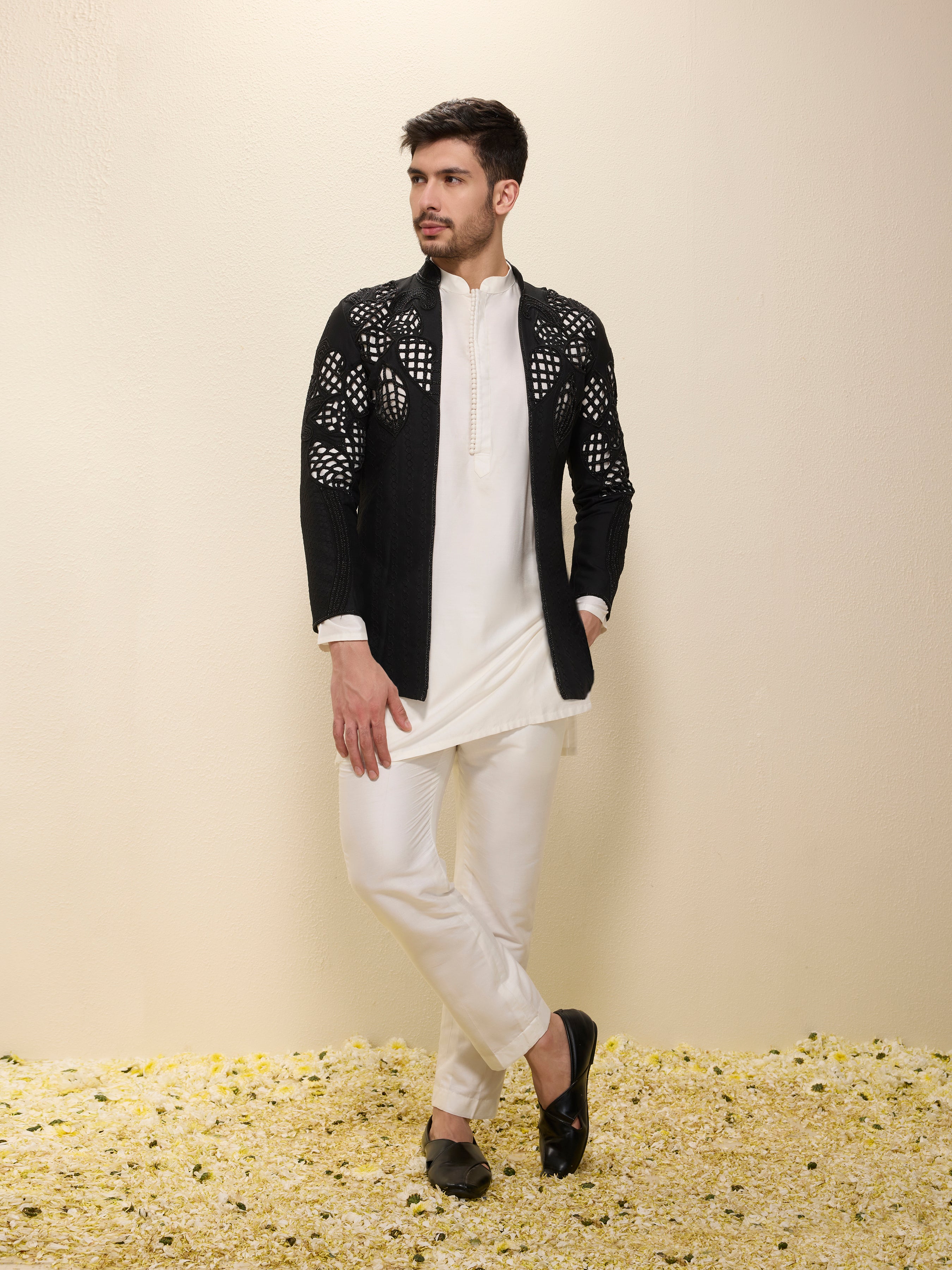 Ivory Spun Silk Kurta Set with Black Cutwork Hand-Embroidered Jacket