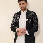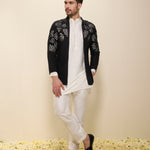 Elevate your ethnic style with this men’s ivory spun silk kurta set featuring traditional potli buttons and matching pants, perfectly complemented by a black jacket adorned with intricate cutwork and hand embroidery. This versatile ensemble blends classic elegance with contemporary detailing, making it ideal for weddings, festive celebrations, and formal occasions. Crafted with premium spun silk fabric, it ensures comfort and sophistication for every special event.