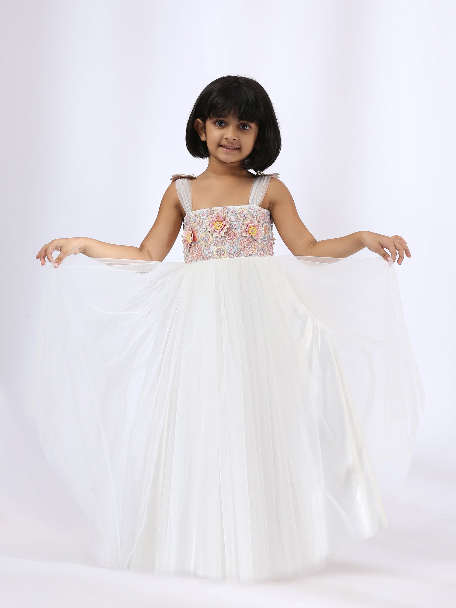 This ivory tulle gown features intricate embroidery with delicate thread and bugle beads, adorning the bodice with exquisite craftsmanship.