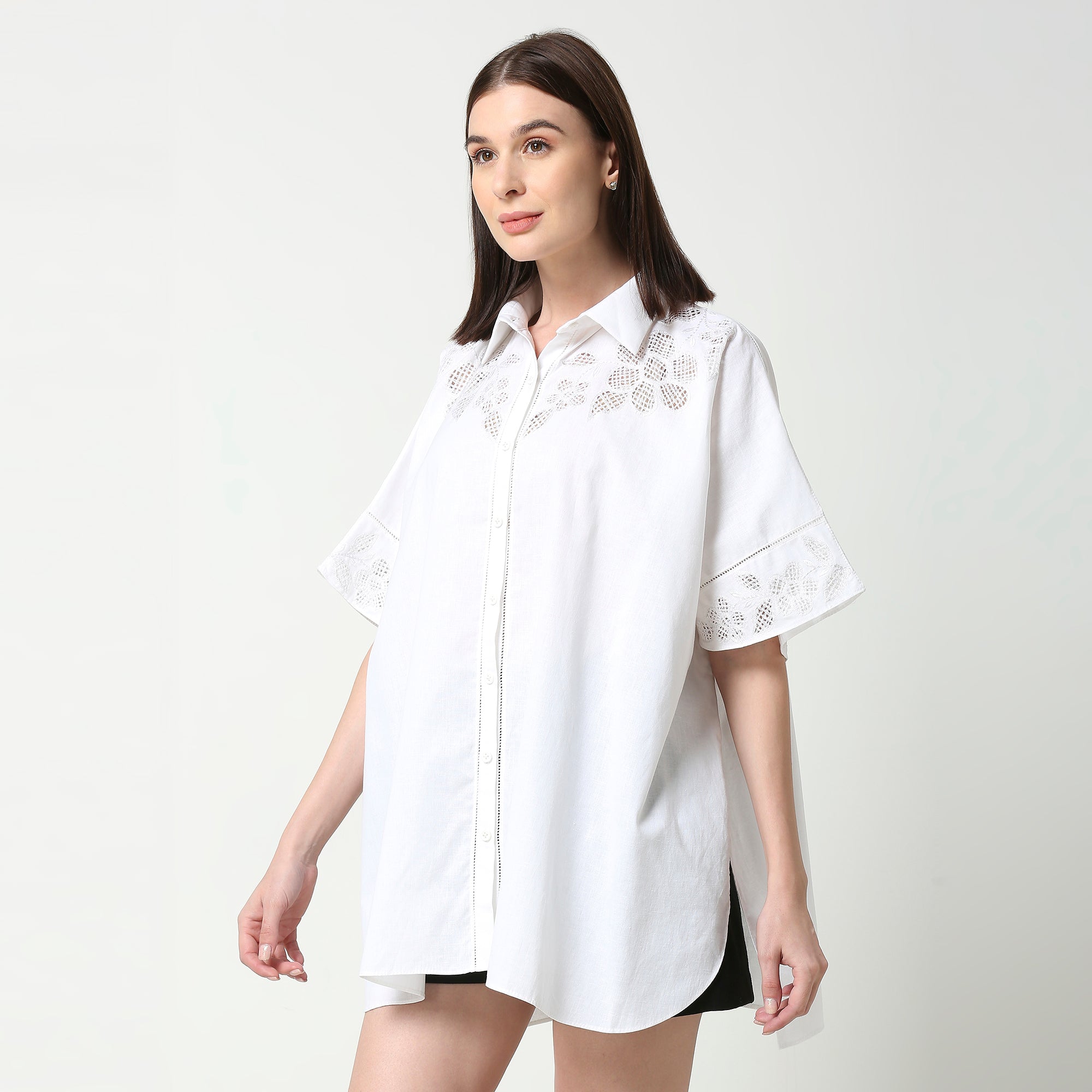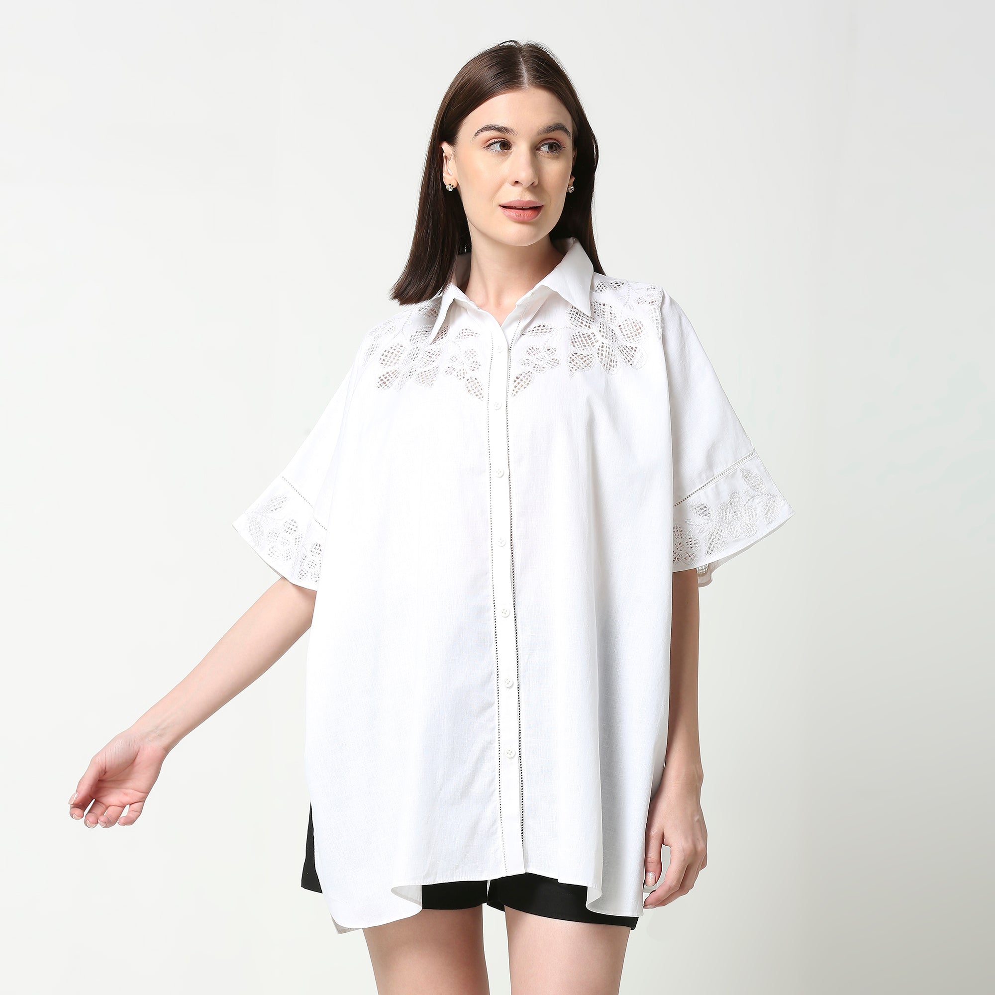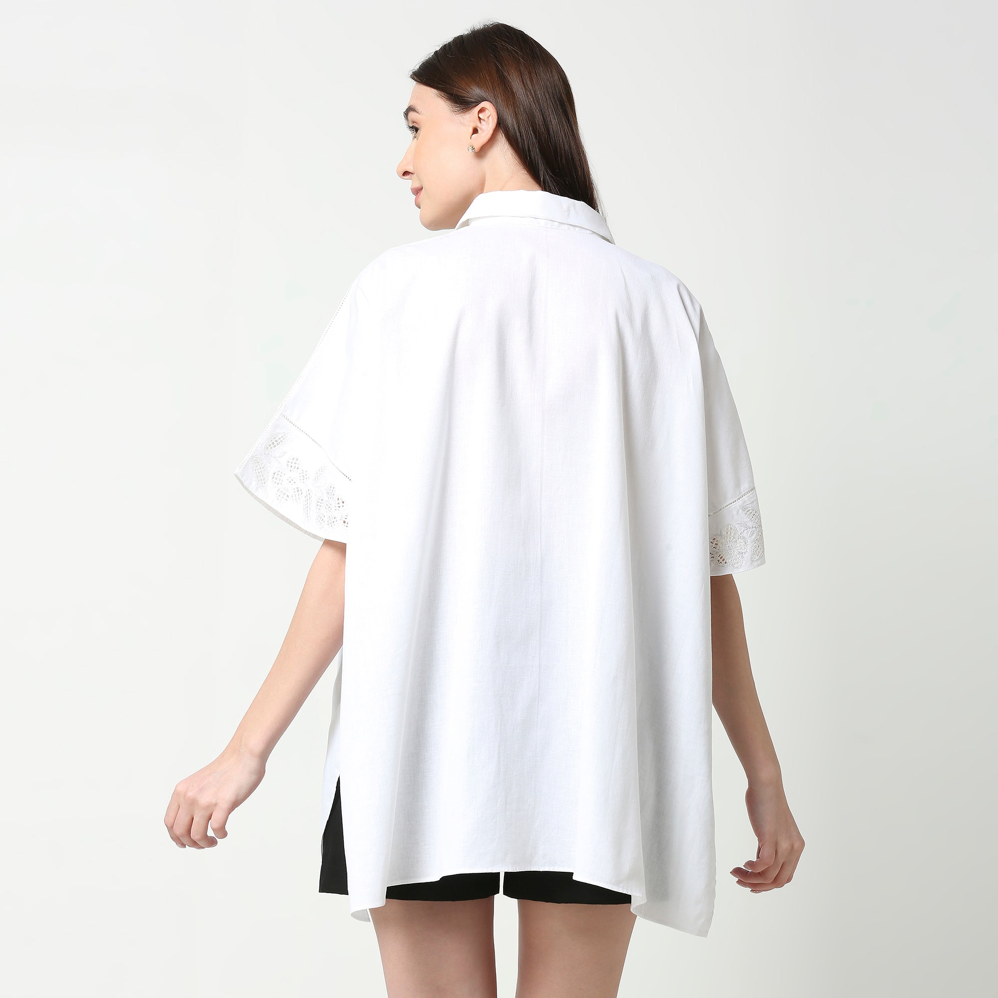 Ivory White Cotton Linen Collared Cutwork Kaftan Shirt