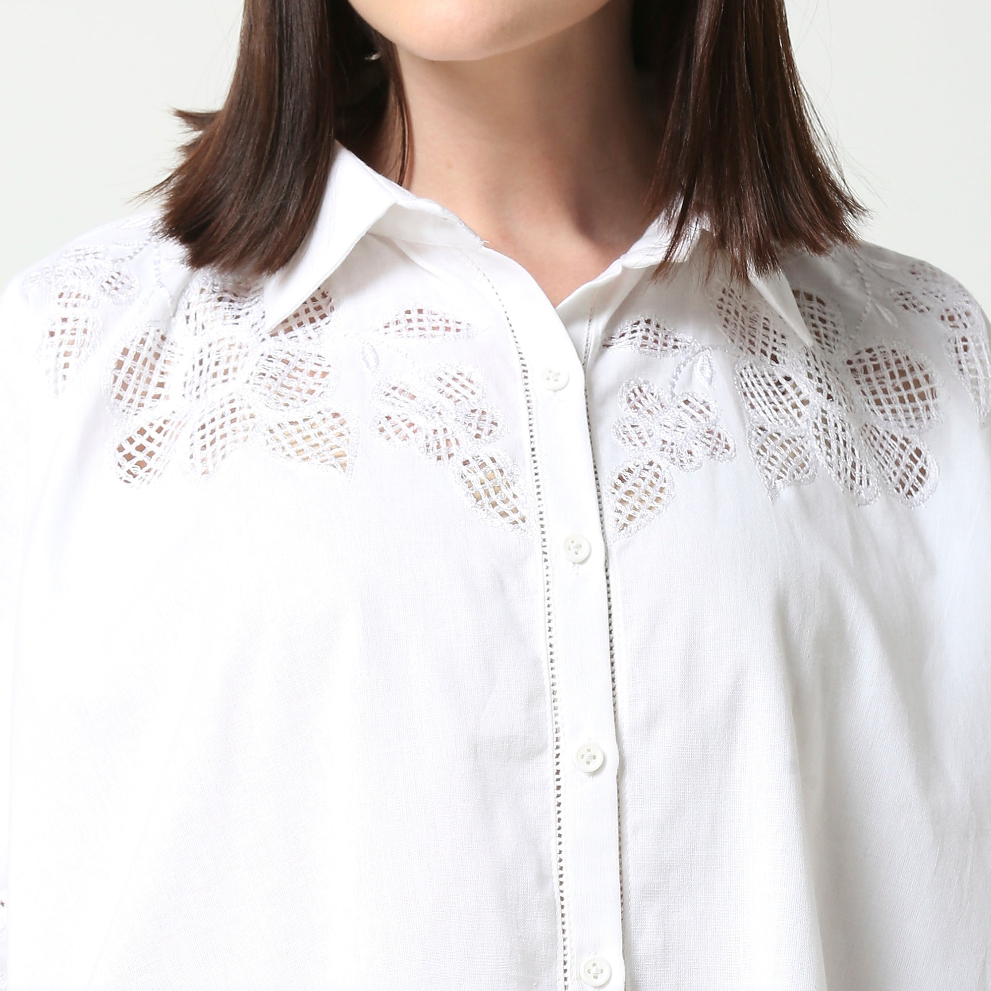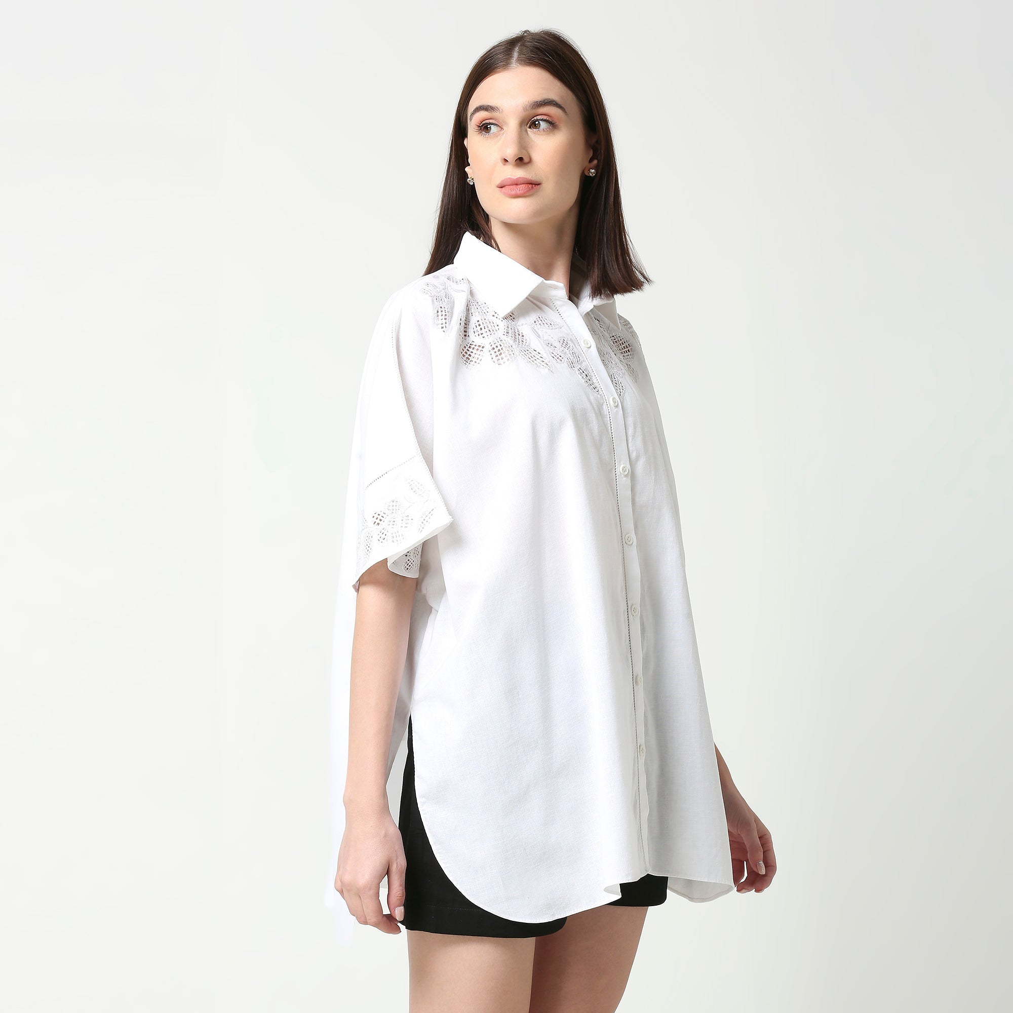 Ivory white kaftan shirt for women, featuring intricate cutwork detail on the front and sleeves. Expertly crafted with high-quality ivory cotton linen, this collared kaftan shirt is the perfect addition to any wardrobe. Durable and comfortable to wear the intricate cutwork detail on the front and sleeves adds a touch of elegance and sophistication to the design.