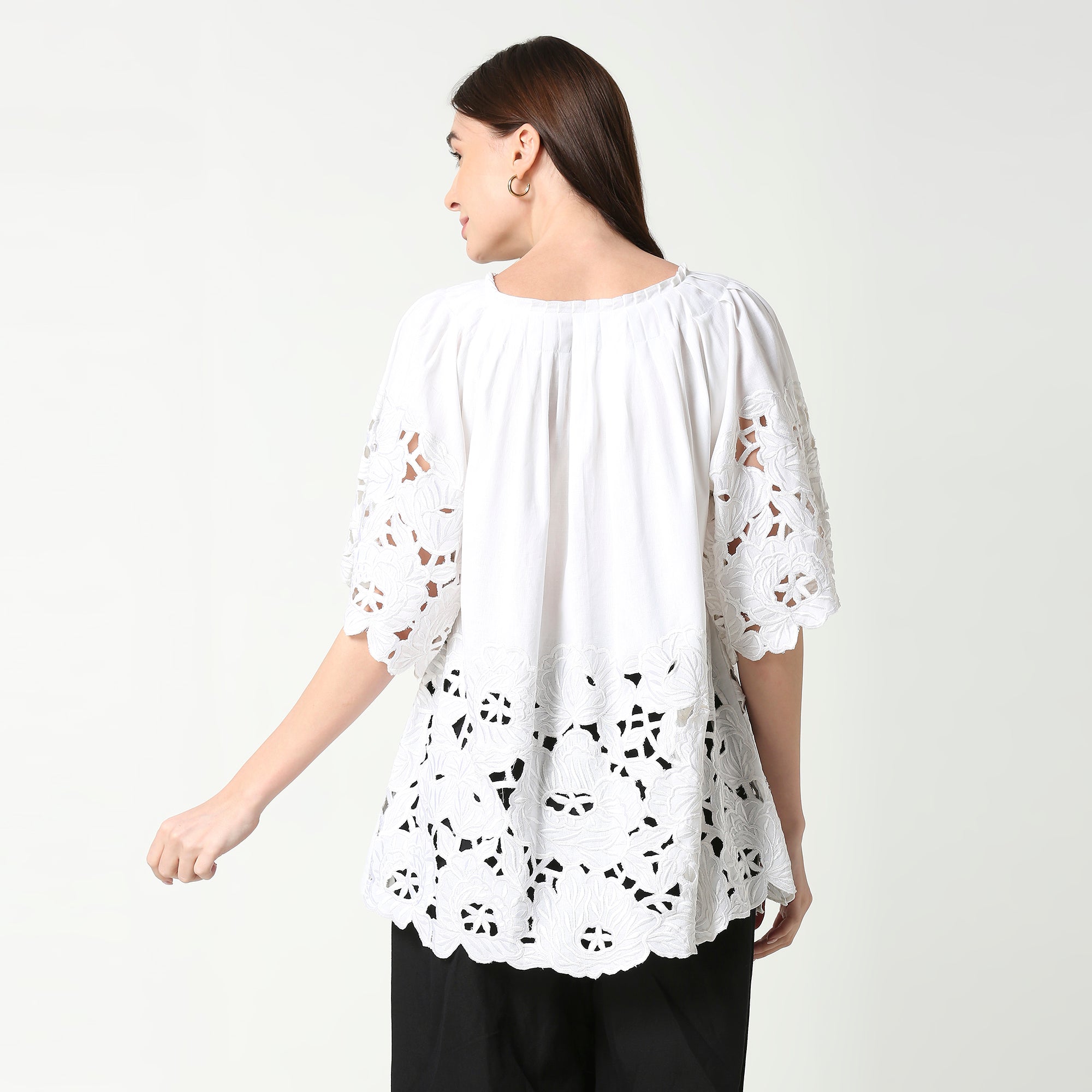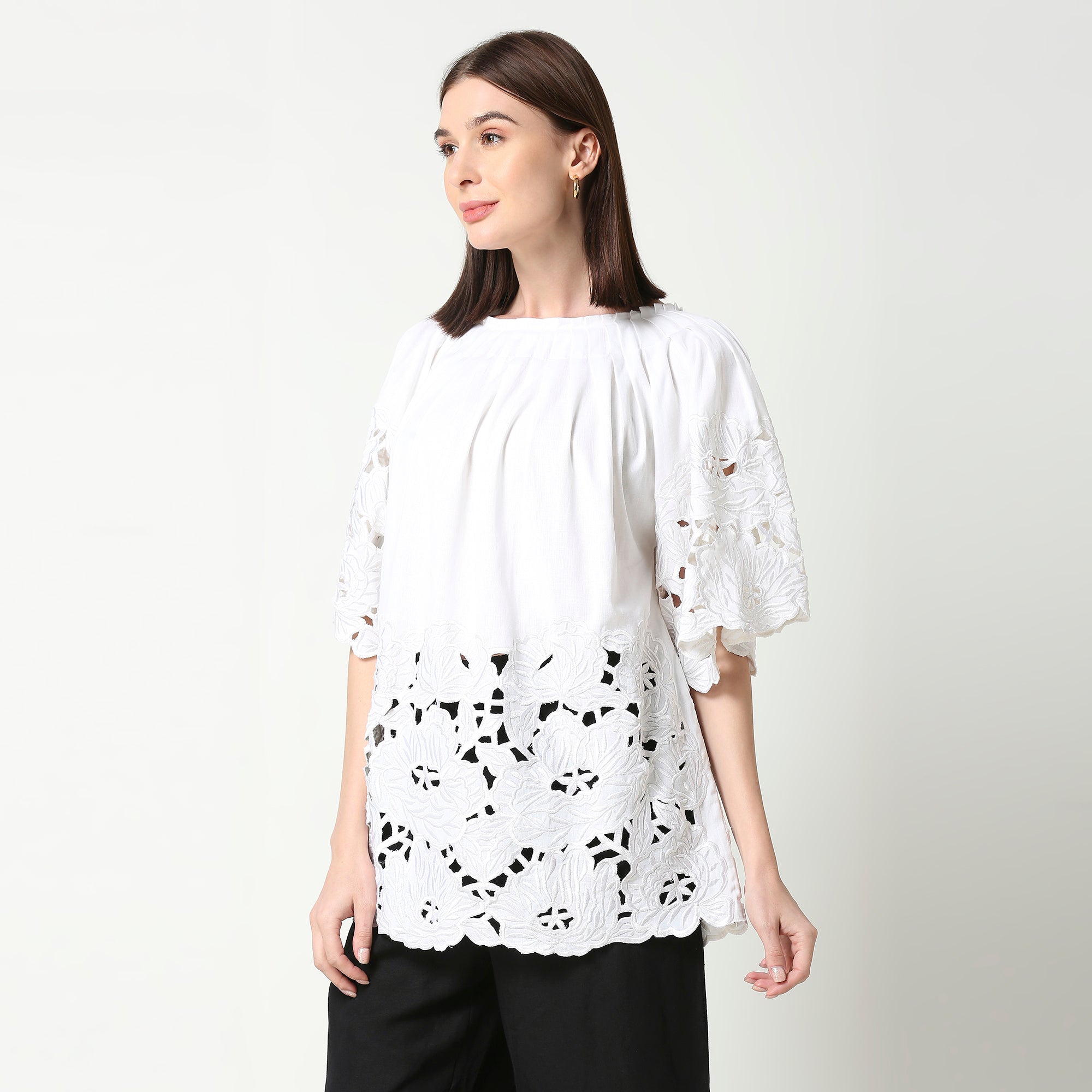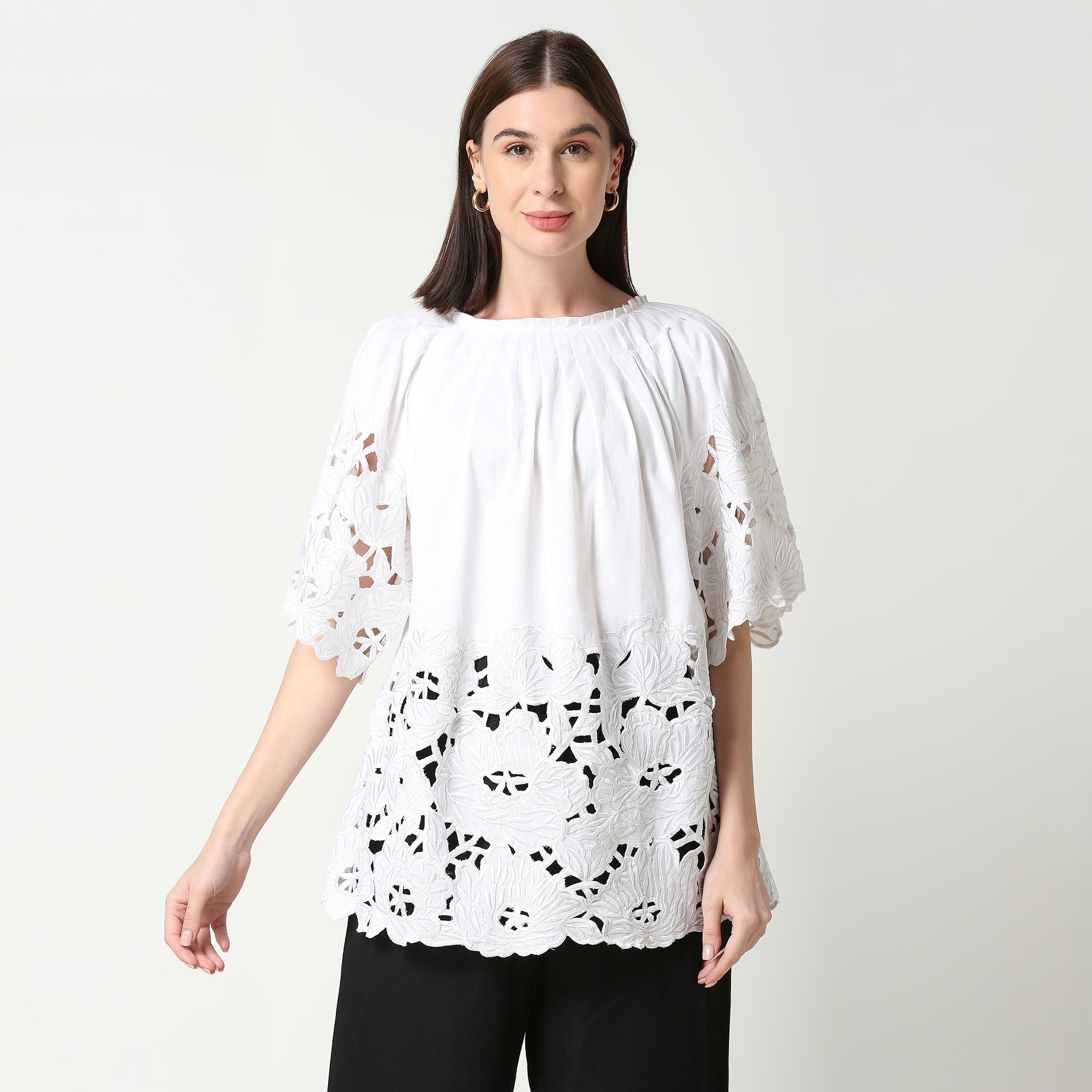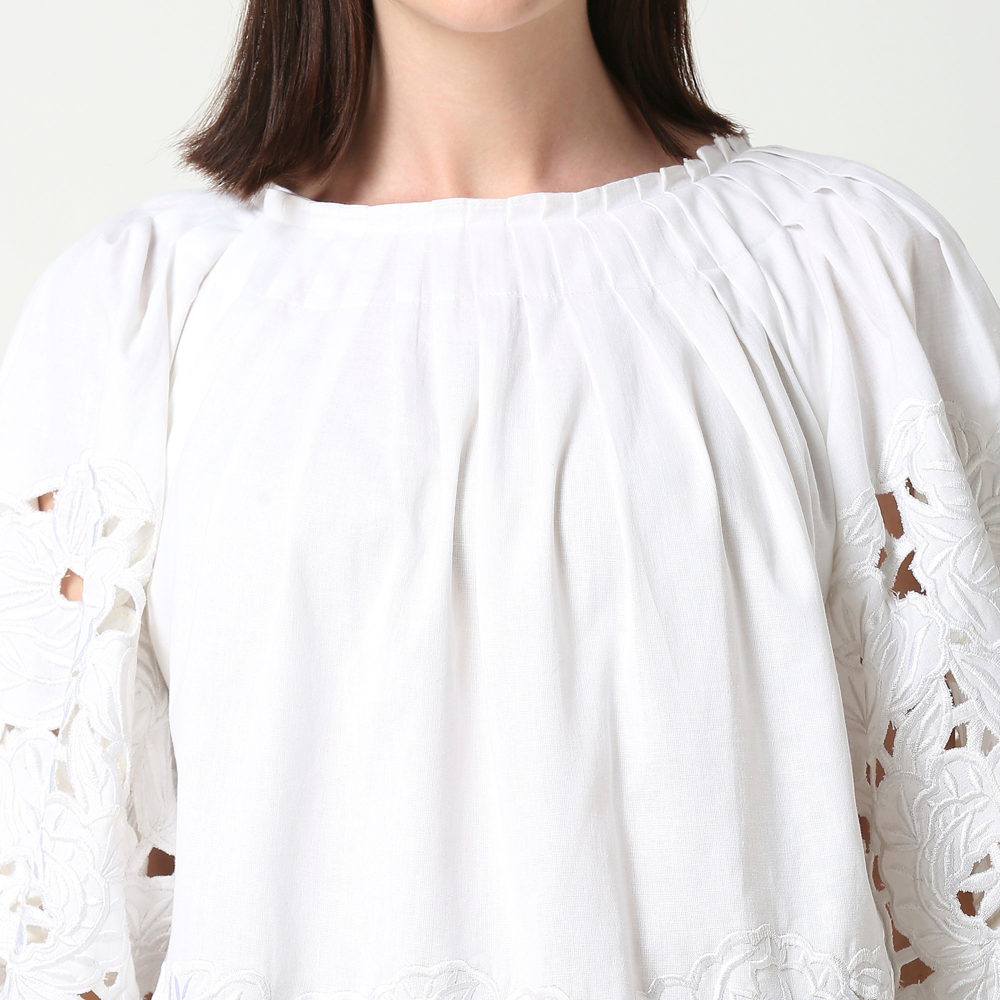 Ivory White Tunic featuring pleated detailing on the neckline and sleeve, as well as intricate threadwork and cutwork embroidery along the hemline and sleeves.