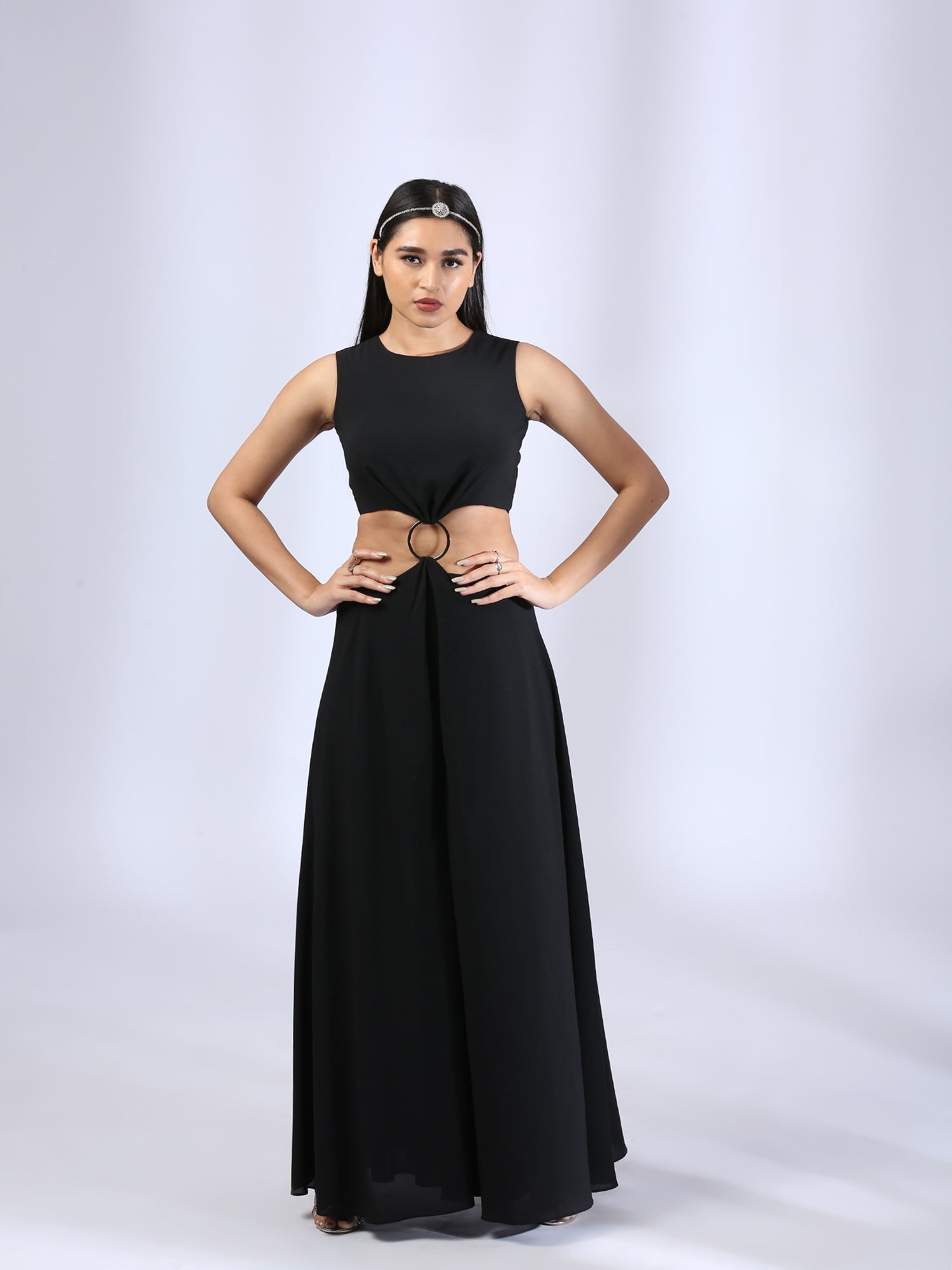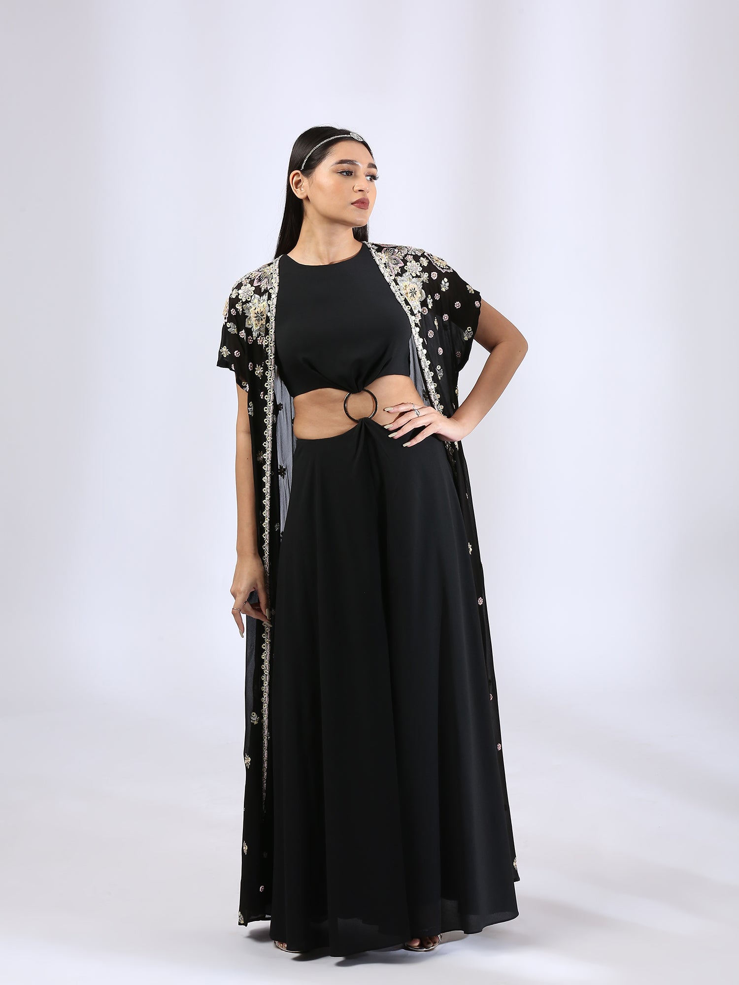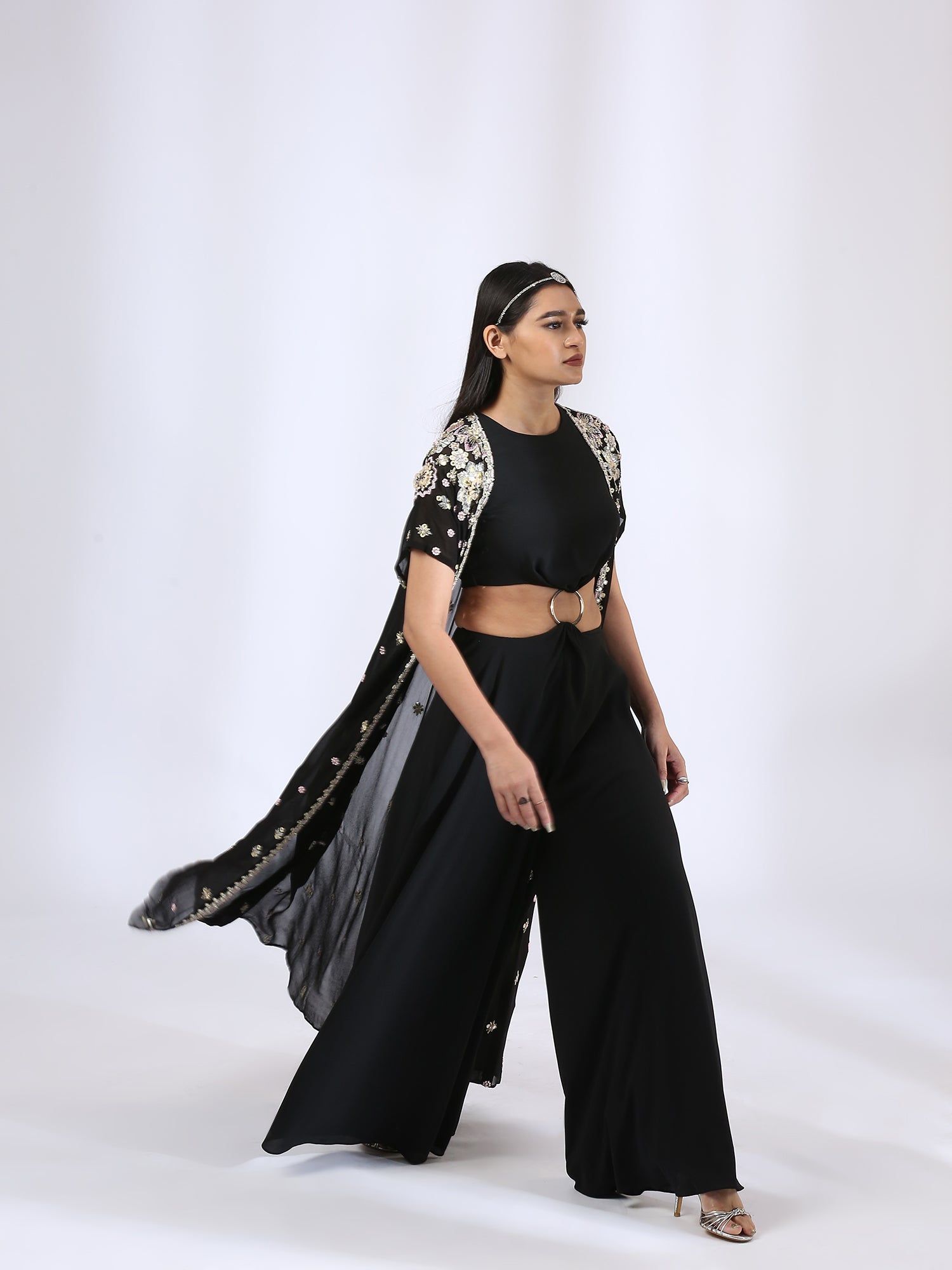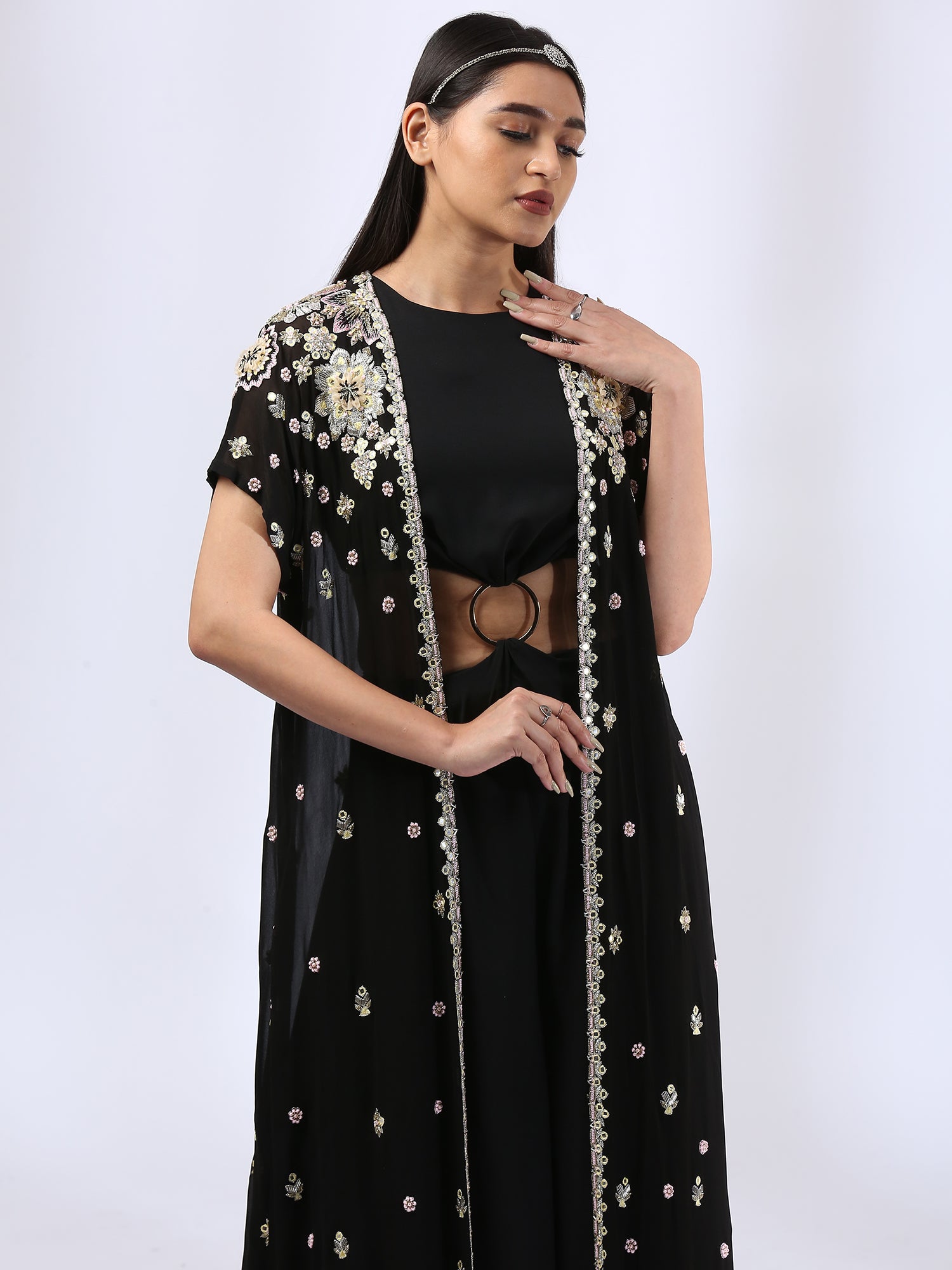 Jet black Jumpsuit with silver ring in the center. It is further enhanced with an open jacket with 3-D and threadwork embroidery.