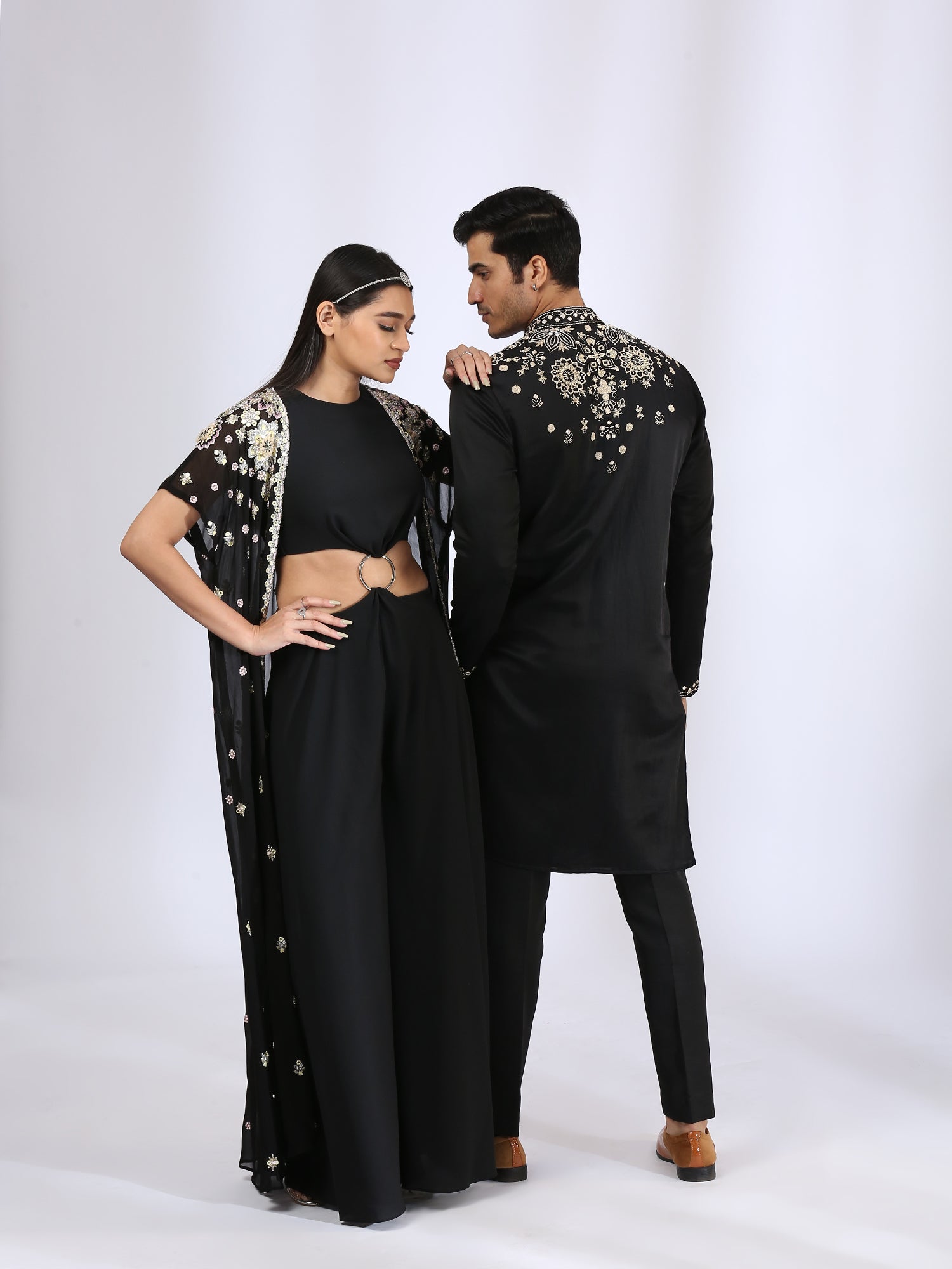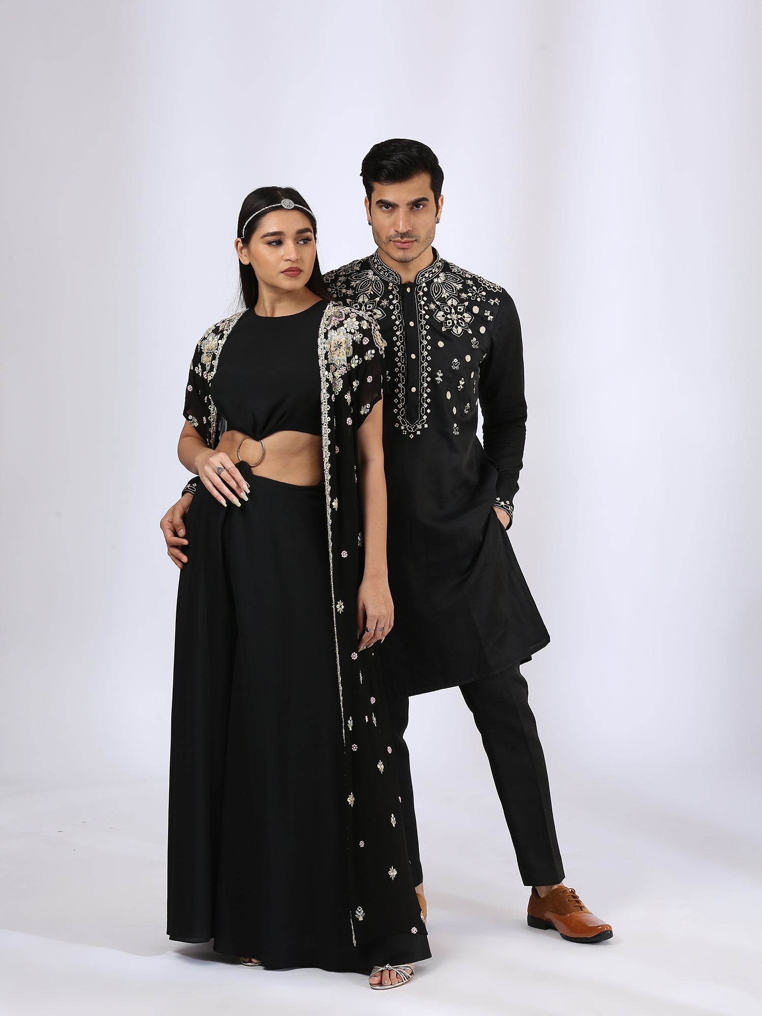 Jet black jumsuit with an embroidered open jacket & Black Embroidered Kurta teamed with matching narrow pants - Couple Set