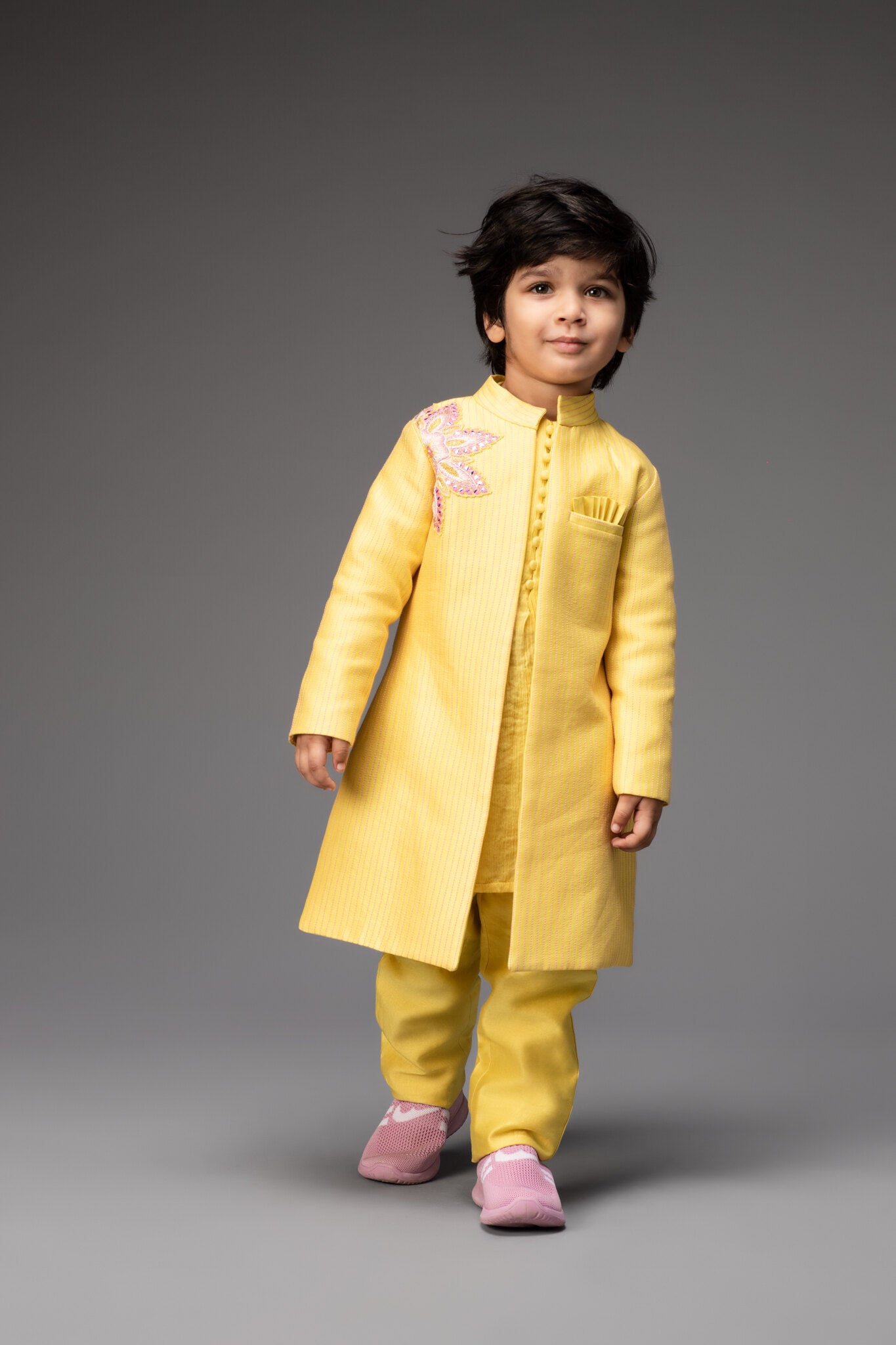 This Lemon Yellow Chanderi Jacket and Kurta Set features a crinkled kurta and narrow pants in a vibrant yellow hue. The set is completed with an open jacket adorned with thread and mirror work detailing on one shoulder.